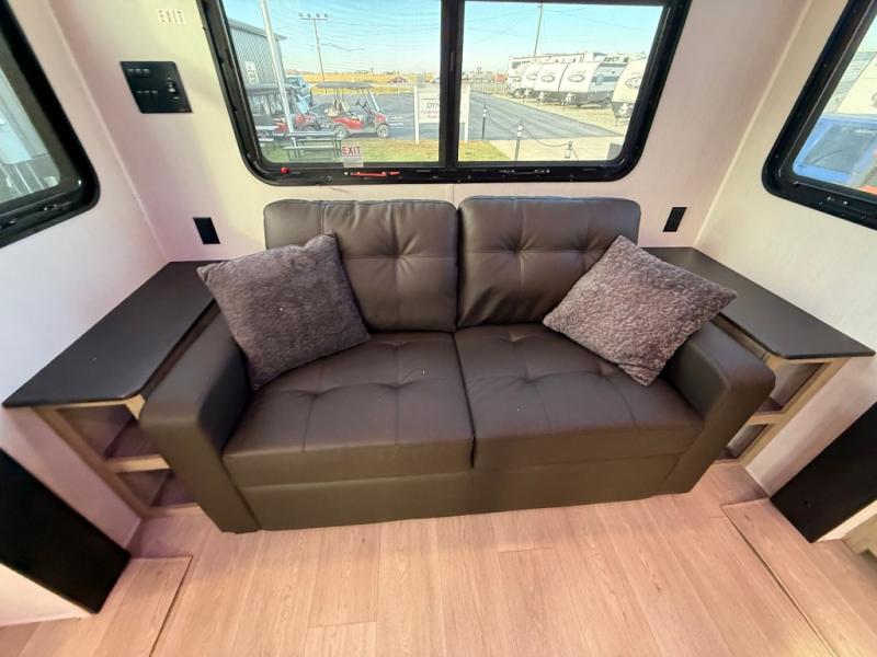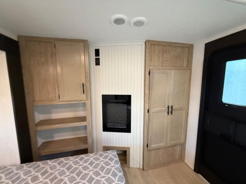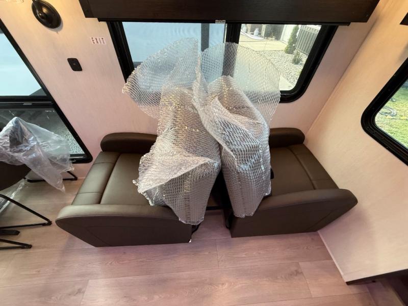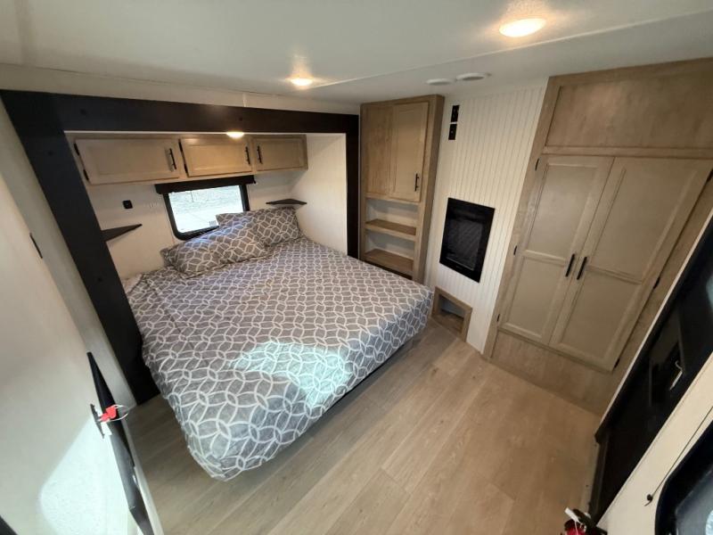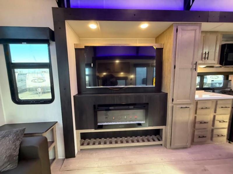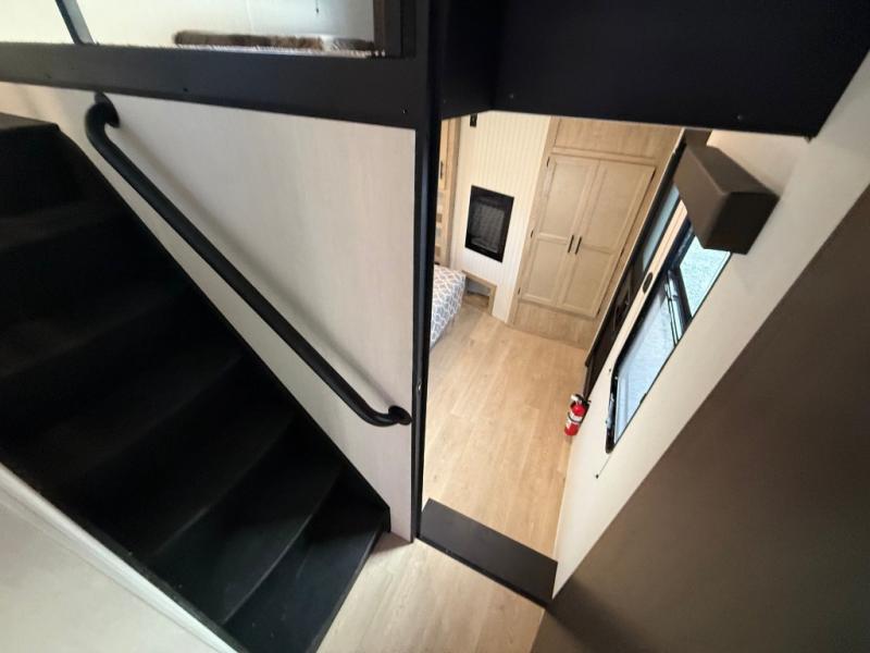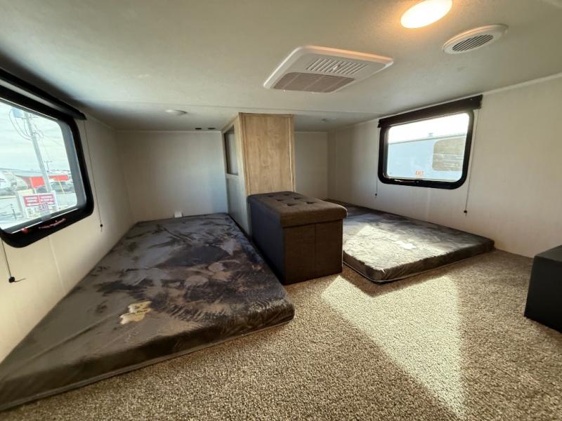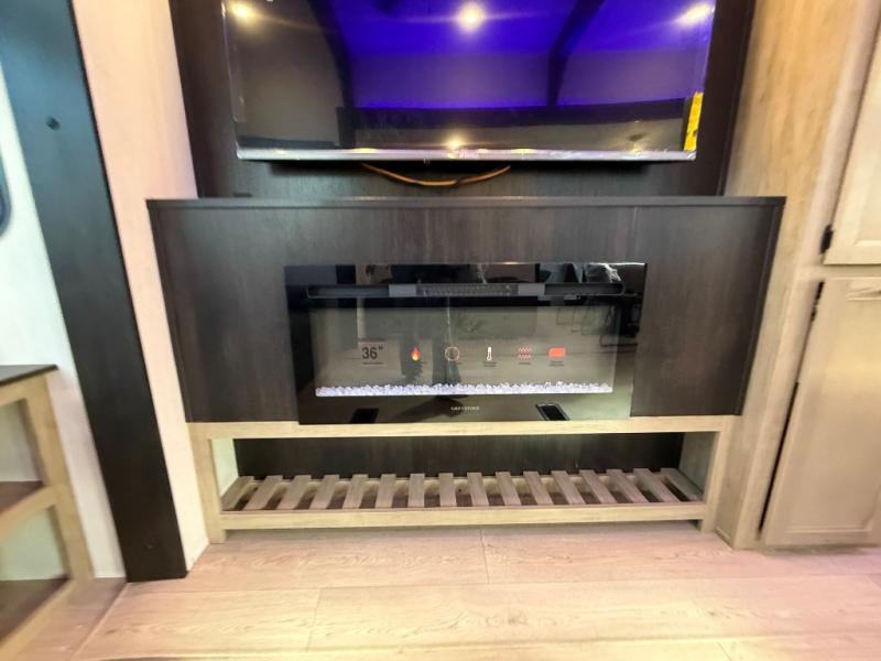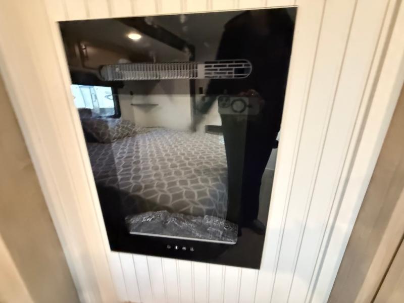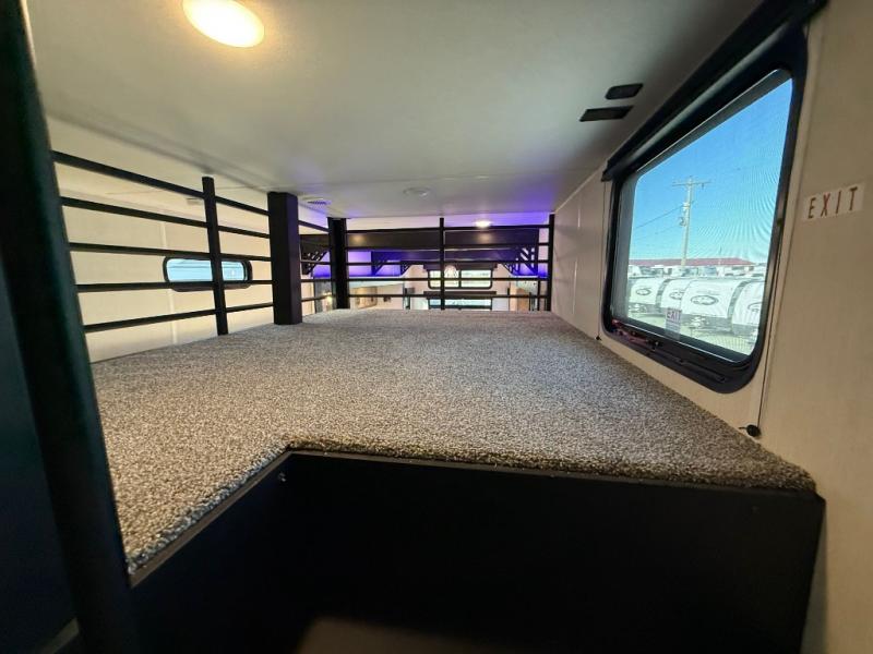 This destination trailer is an excellent and accommodating trailer that will make you feel right at home as soon as you enter through one of the two entry doors. The front private bedroom has a king bed slide, wardrobe, linen closet, and bedroom fireplace plus one of the dual entry doors to the unit. Above the bedroom is where the huge loft is located. When you take the stairs up to the loft, you'll find two 36" x 74" bunk mats, storage cabinets, and a large open area with railing. The main living area has a free-standing dinette with chairs, theater seats, and a hide-a-bed sofa, so you will have plenty of seating as you watch the main entertainment center.