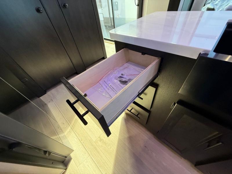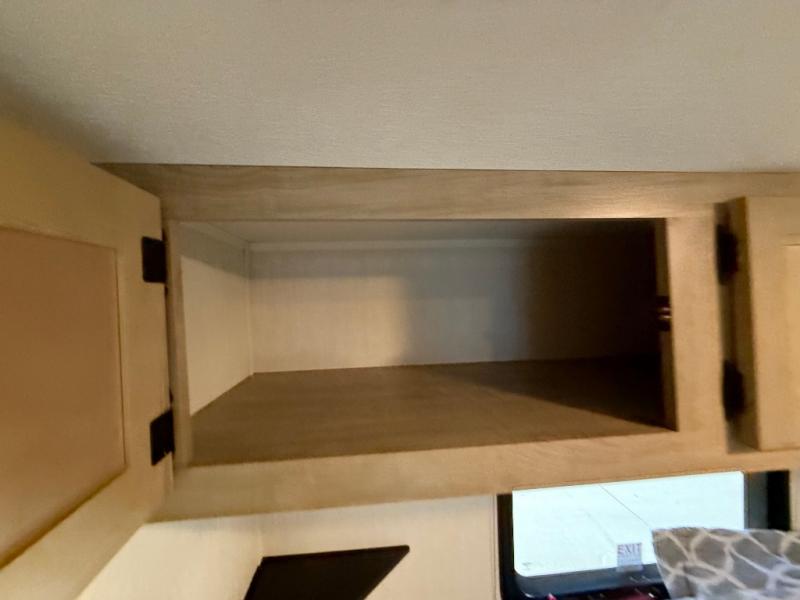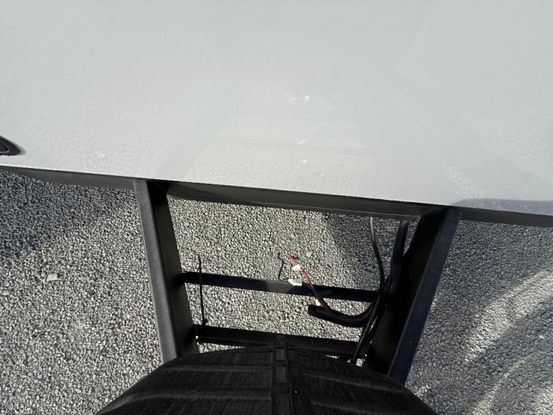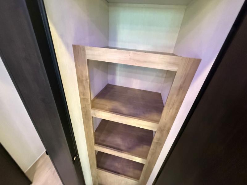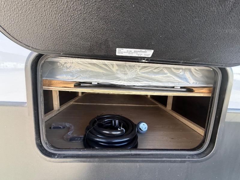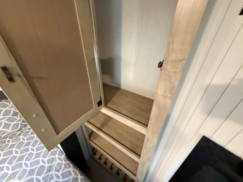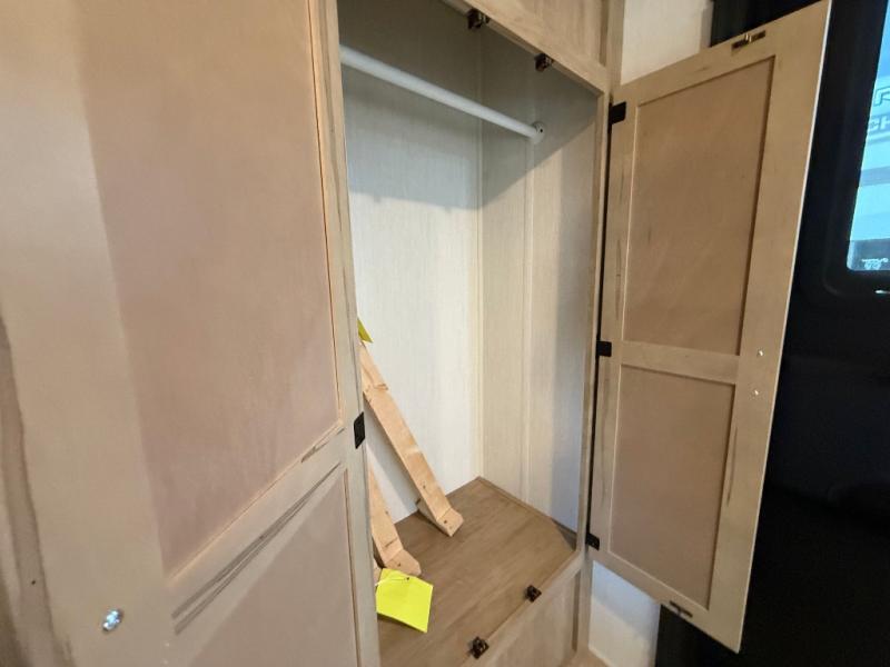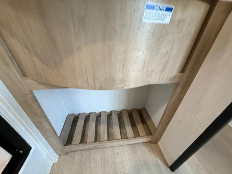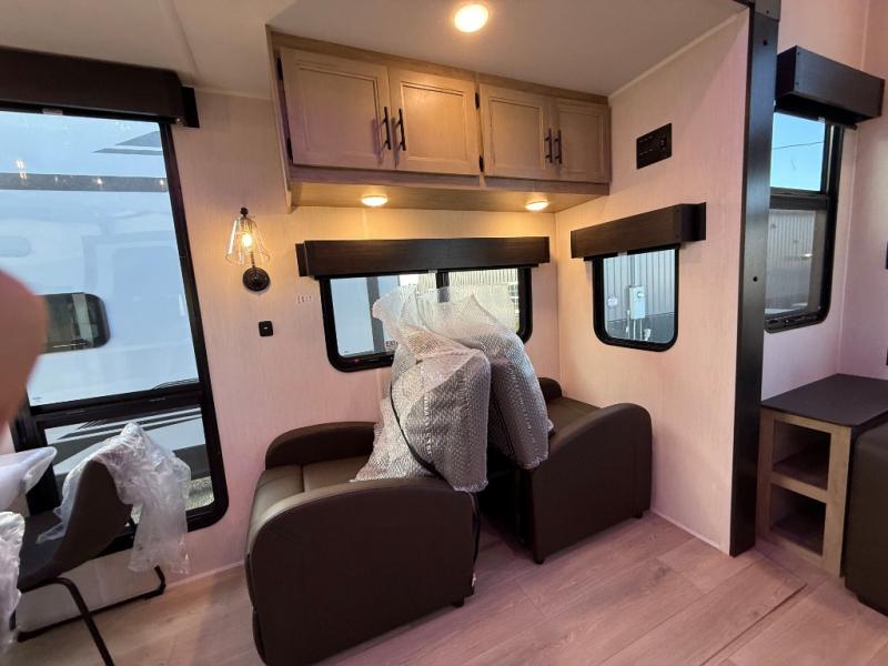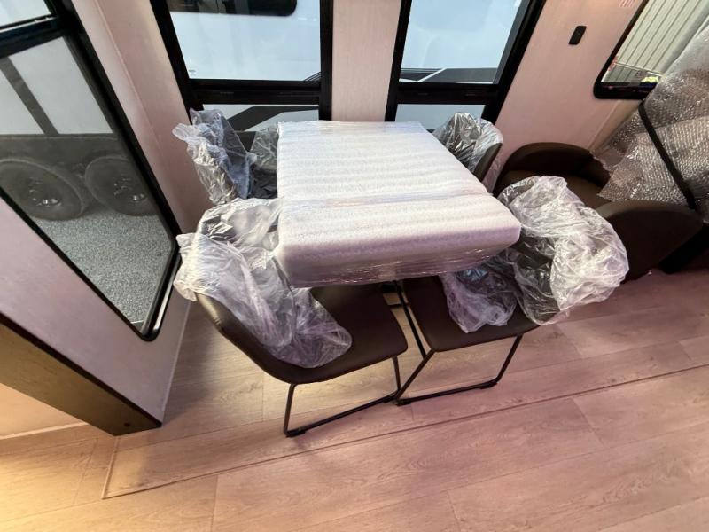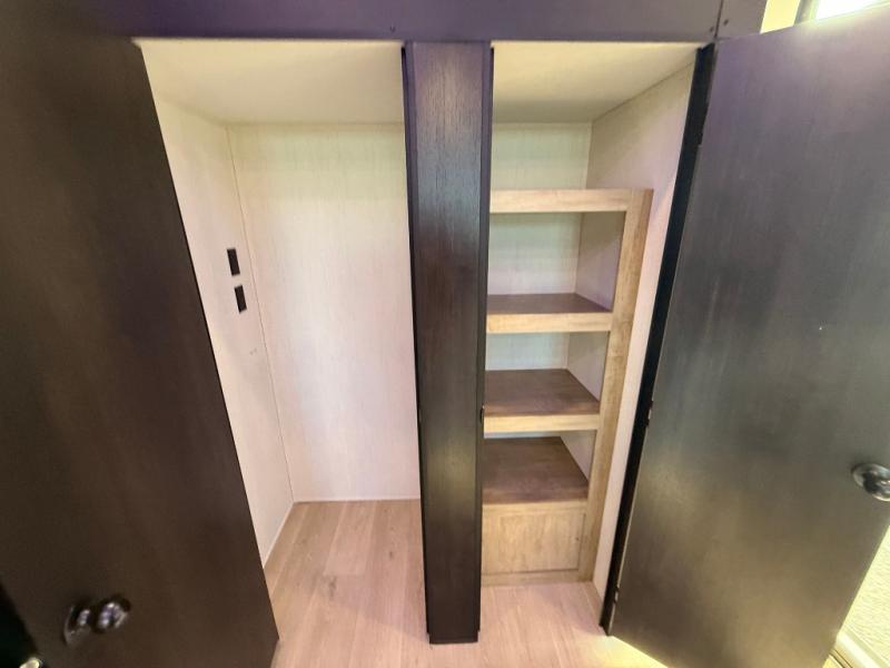 This destination trailer is an excellent and accommodating trailer that will make you feel right at home as soon as you enter through one of the two entry doors. The front private bedroom has a king bed slide, wardrobe, linen closet, and bedroom fireplace plus one of the dual entry doors to the unit. Above the bedroom is where the huge loft is located. When you take the stairs up to the loft, you'll find two 36" x 74" bunk mats, storage cabinets, and a large open area with railing. The main living area has a free-standing dinette with chairs, theater seats, and a hide-a-bed sofa, so you will have plenty of seating as you watch the main entertainment center.