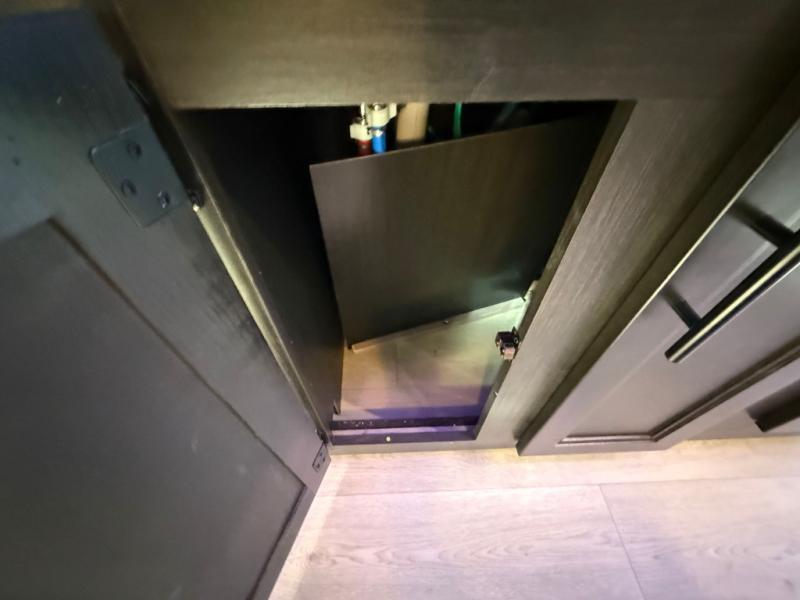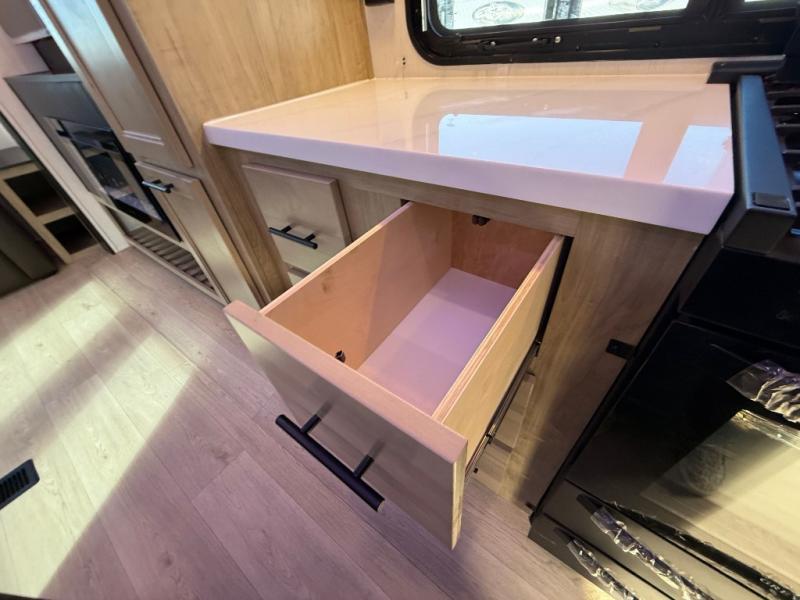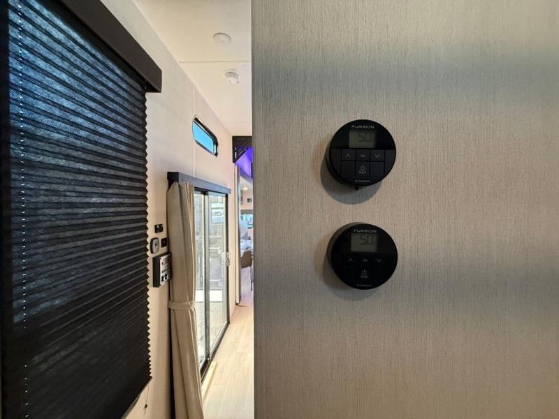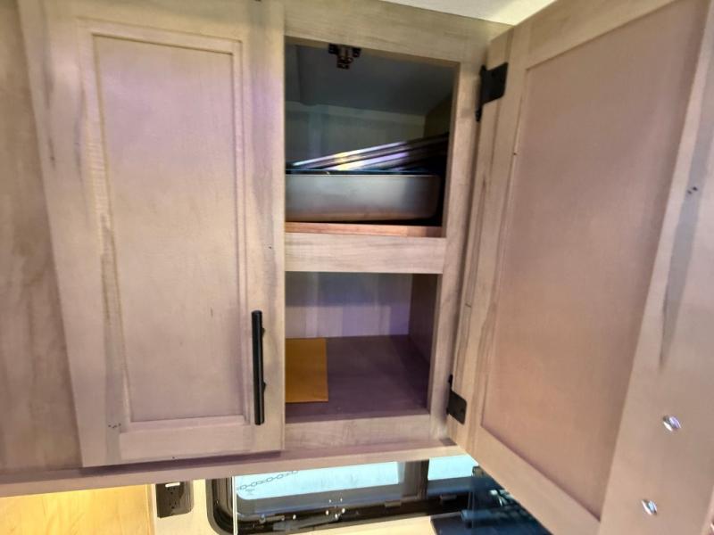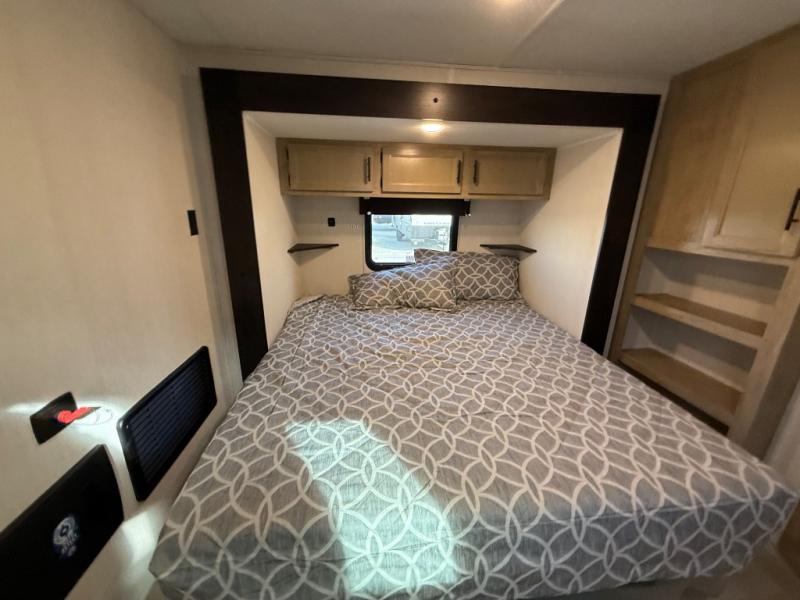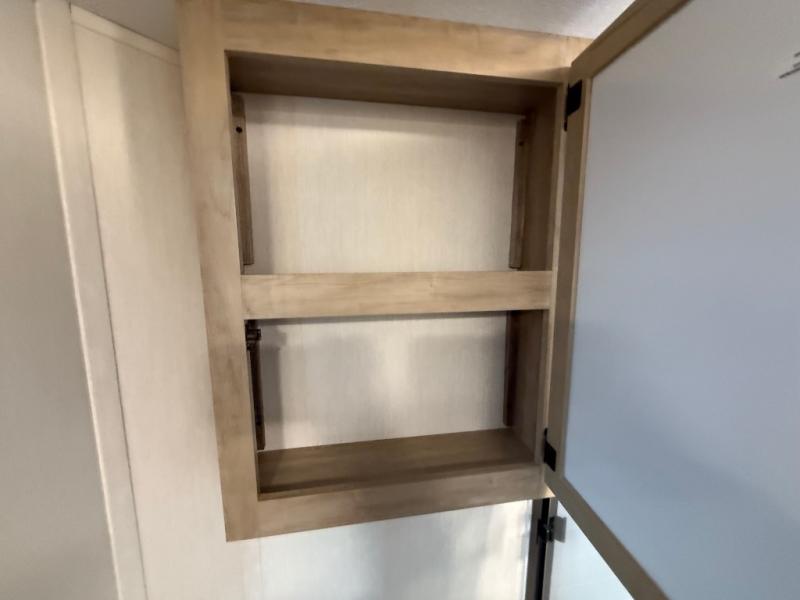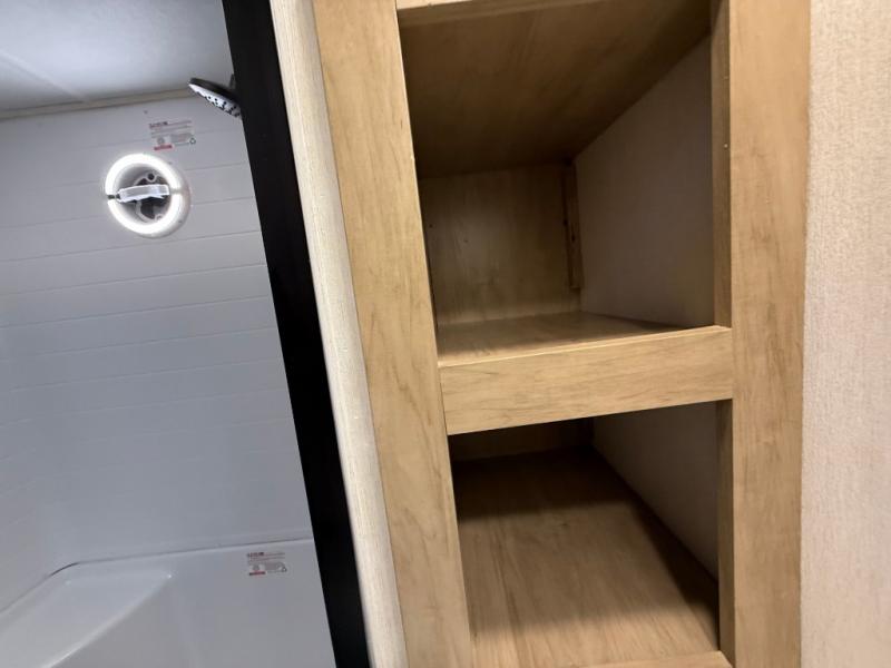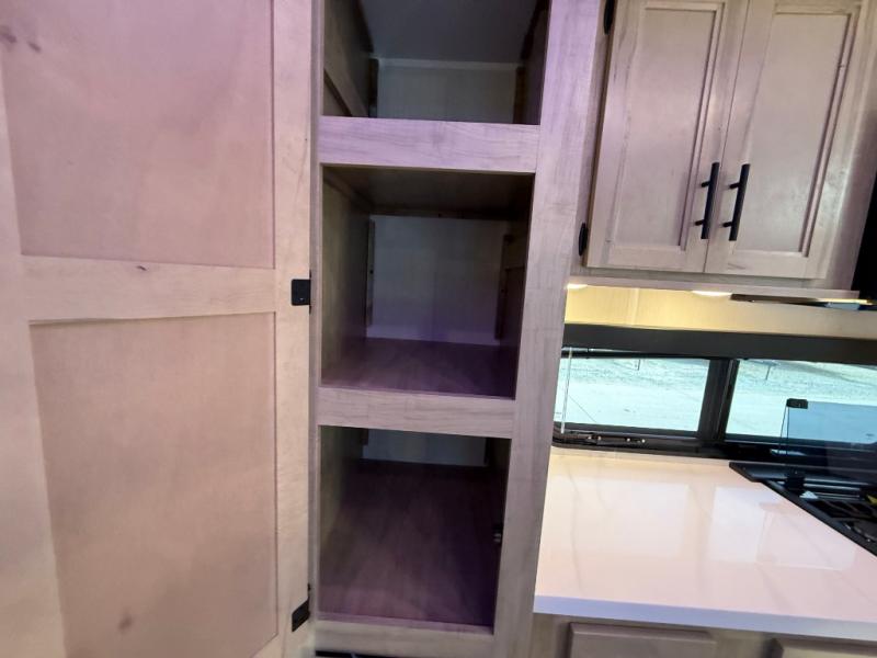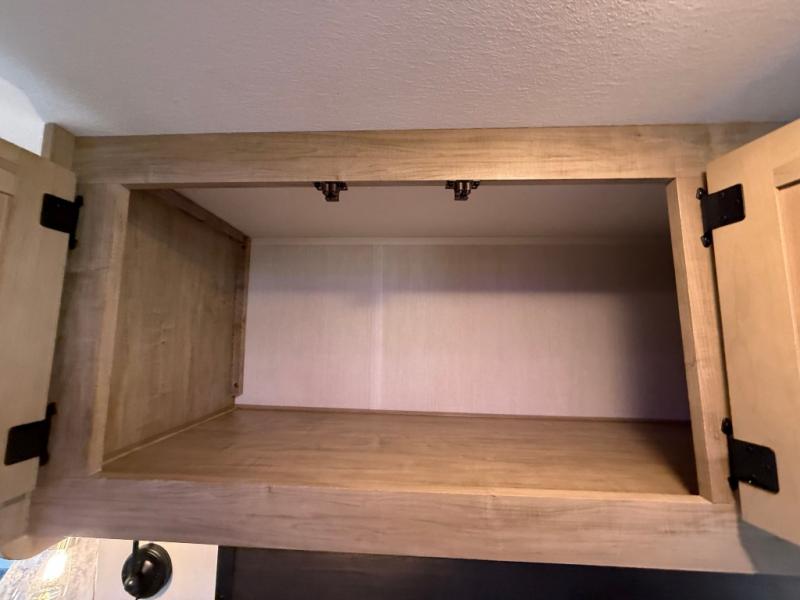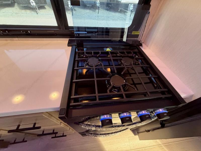 This destination trailer is an excellent and accommodating trailer that will make you feel right at home as soon as you enter through one of the two entry doors. The front private bedroom has a king bed slide, wardrobe, linen closet, and bedroom fireplace plus one of the dual entry doors to the unit. Above the bedroom is where the huge loft is located. When you take the stairs up to the loft, you'll find two 36" x 74" bunk mats, storage cabinets, and a large open area with railing. The main living area has a free-standing dinette with chairs, theater seats, and a hide-a-bed sofa, so you will have plenty of seating as you watch the main entertainment center.