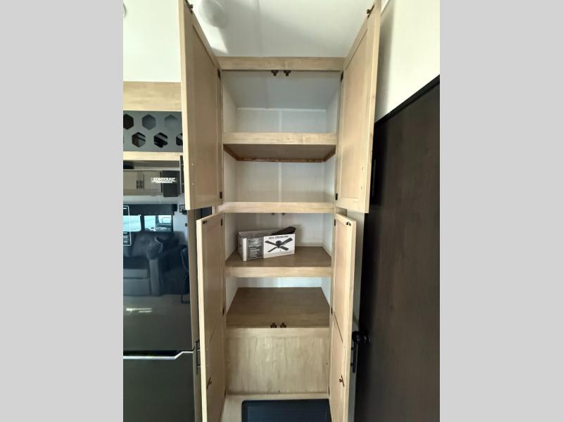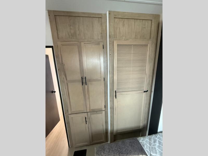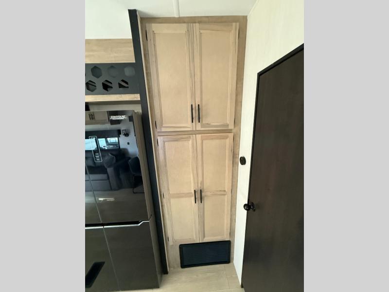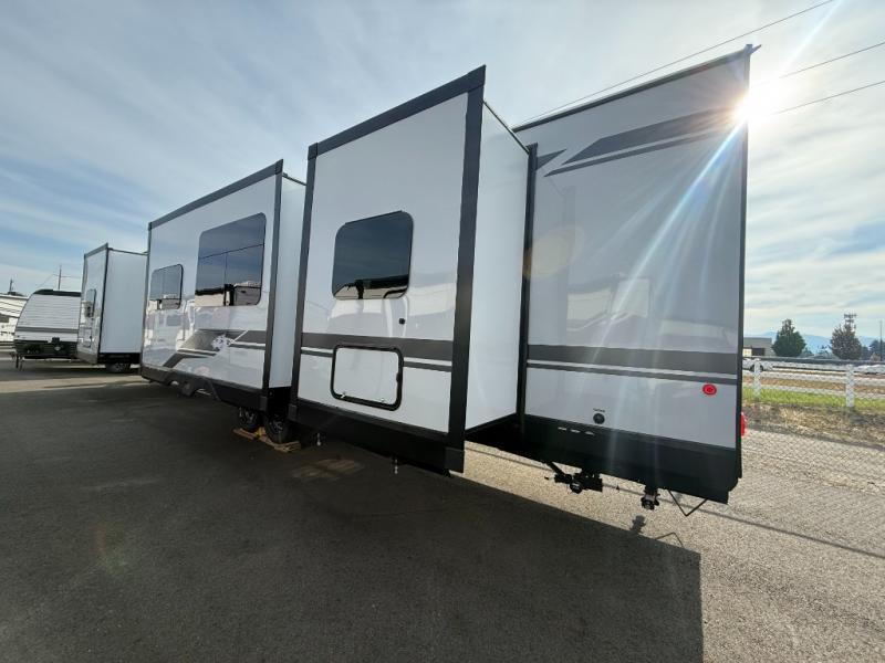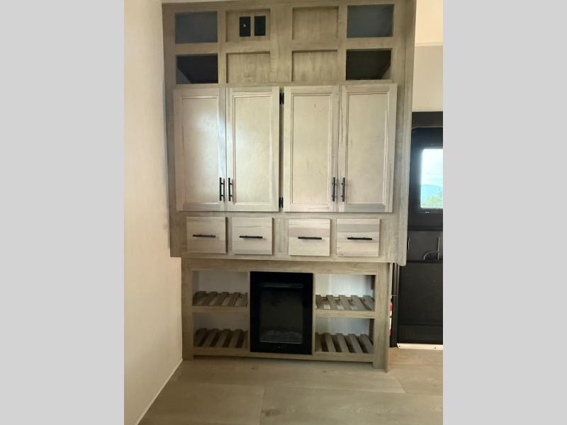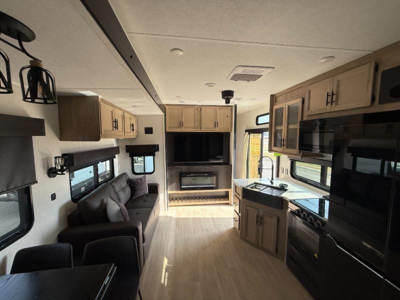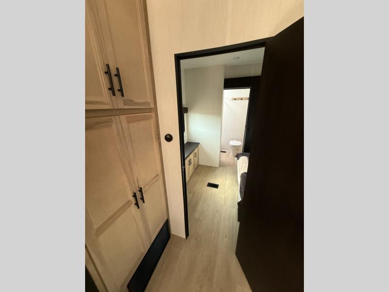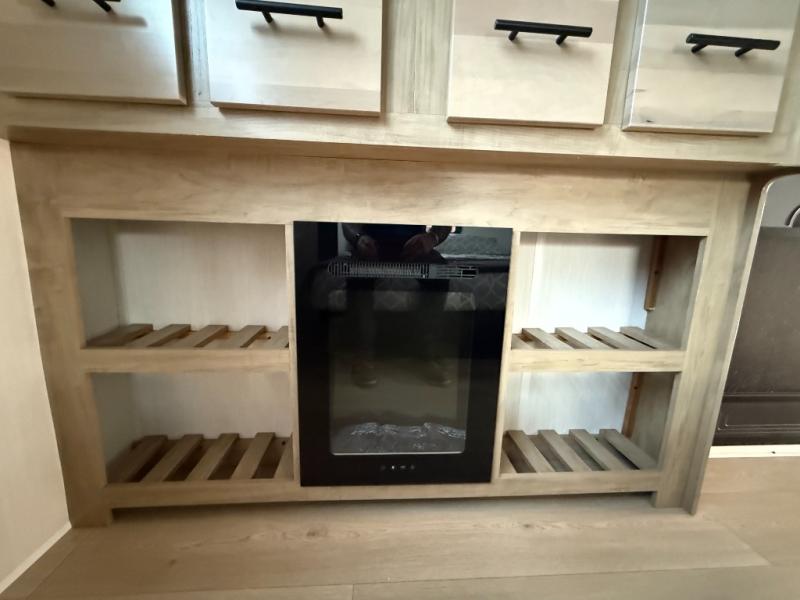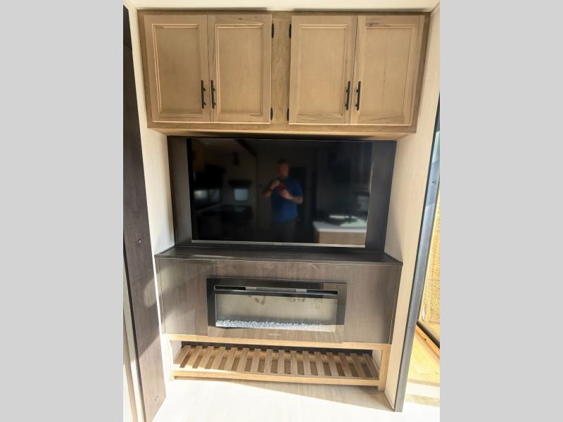 Spacious and comfortable is how you will describe this destination travel trailer featuring triple slides, two full baths, and a spacious combined kitchen and living area thanks to the large slide here featuring a free standing dinette and hide-a-bed sofa. The kitchen includes everything you need to comfortably cook while you are away, and allows you to make meals for your family just like at home. There is a large pantry where you can keep plenty of snacks and dry goods for your trip. Two full baths is a convenience especially at night with the front bathroom accessible to all guests just to the right of the main entry door. In the rear of the coach, there is a private bedroom featuring a queen bed slide for added roominess, comfortable sleeping, as well as ample storage between a dresser and wardrobe for your clothing. In the very back, a master suite bath featuring a vanity with a sink, a shower with a seat, and linen storage for your towels and toiletries. The front private bedroom includes a king bed slide, spacious wardrobe and fireplace.