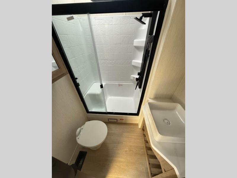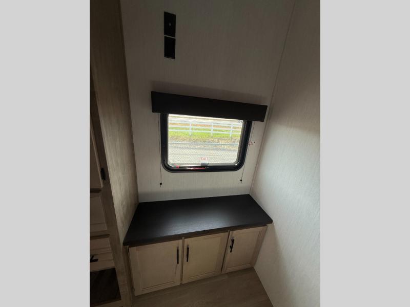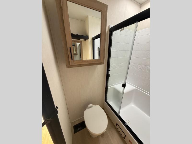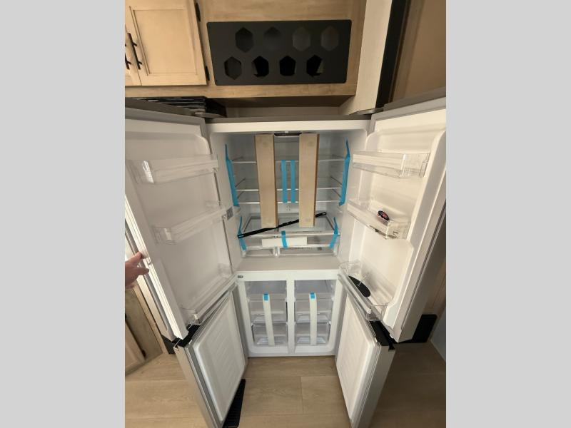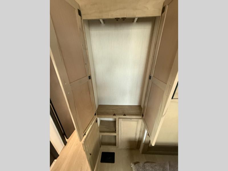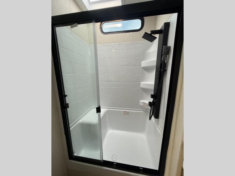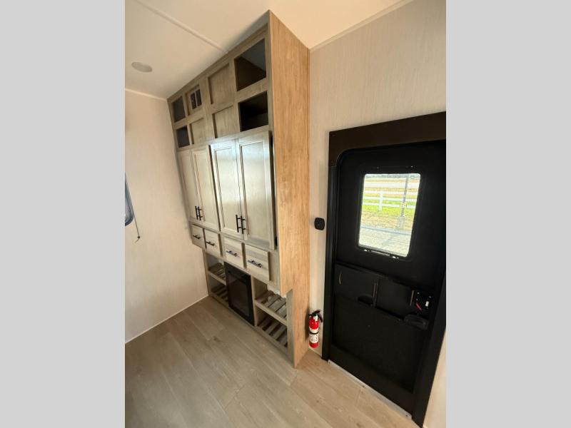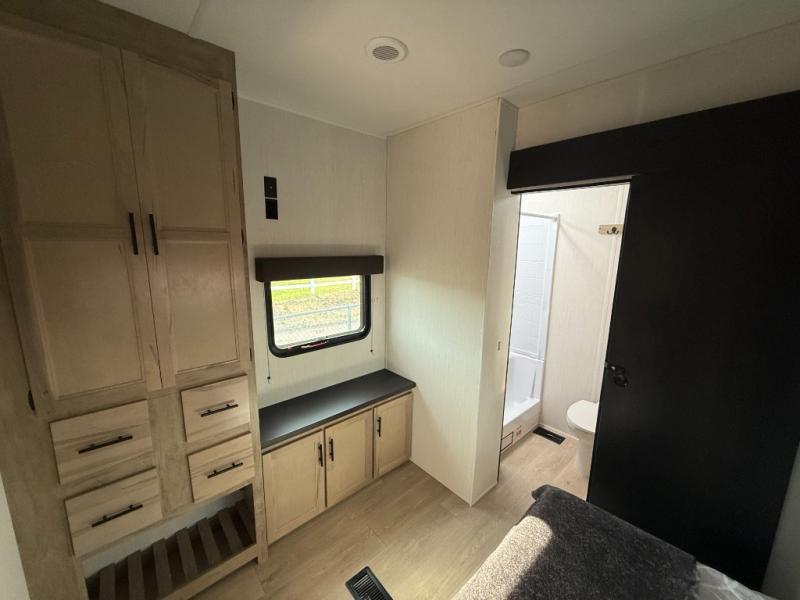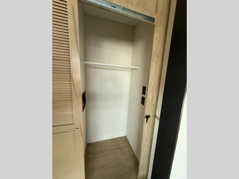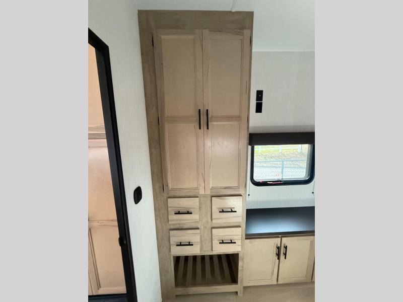Spacious and comfortable is how you will describe this destination travel trailer featuring triple slides, two full baths, and a spacious combined kitchen and living area thanks to the large slide here featuring a free standing dinette and hide-a-bed sofa. The kitchen includes everything you need to comfortably cook while you are away, and allows you to make meals for your family just like at home. There is a large pantry where you can keep plenty of snacks and dry goods for your trip. Two full baths is a convenience especially at night with the front bathroom accessible to all guests just to the right of the main entry door. In the rear of the coach, there is a private bedroom featuring a queen bed slide for added roominess, comfortable sleeping, as well as ample storage between a dresser and wardrobe for your clothing. In the very back, a master suite bath featuring a vanity with a sink, a shower with a seat, and linen storage for your towels and toiletries. The front private bedroom includes a king bed slide, spacious wardrobe and fireplace.