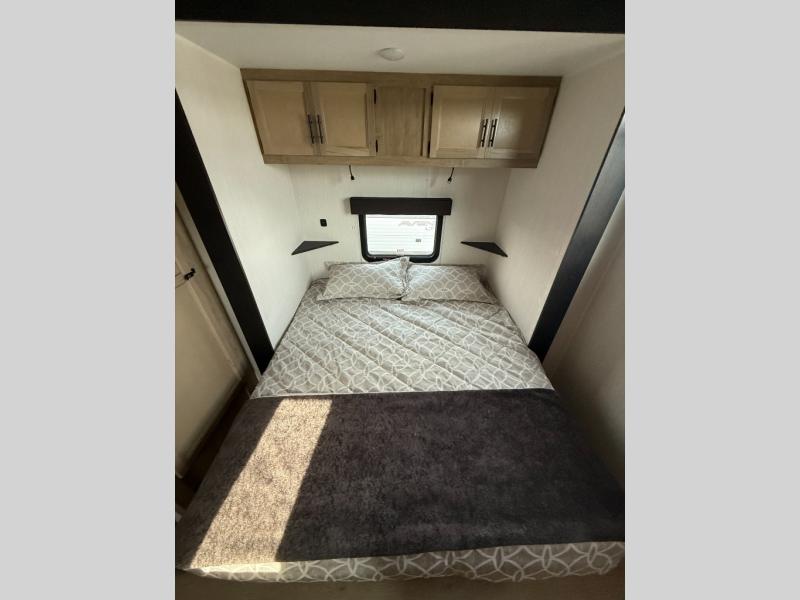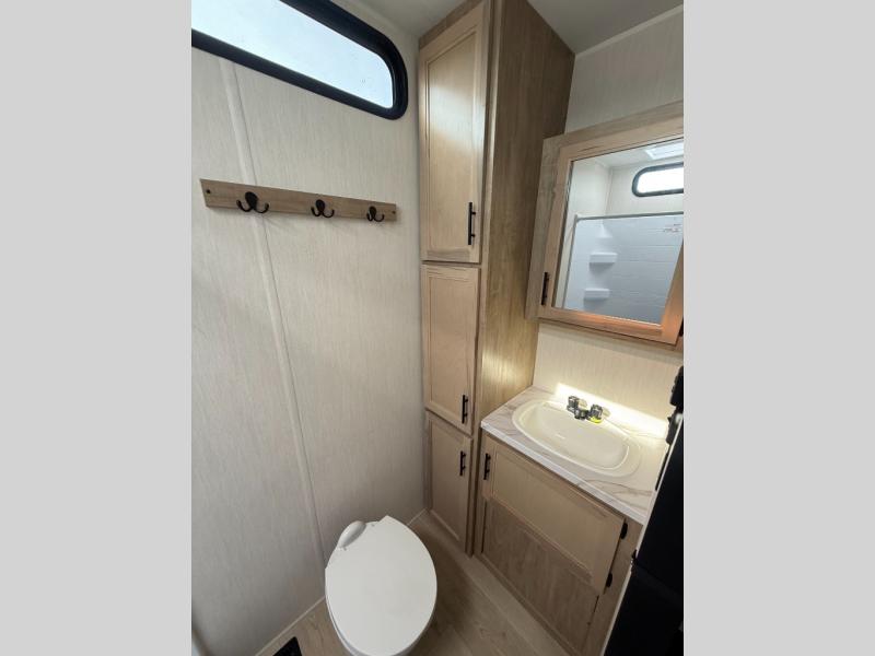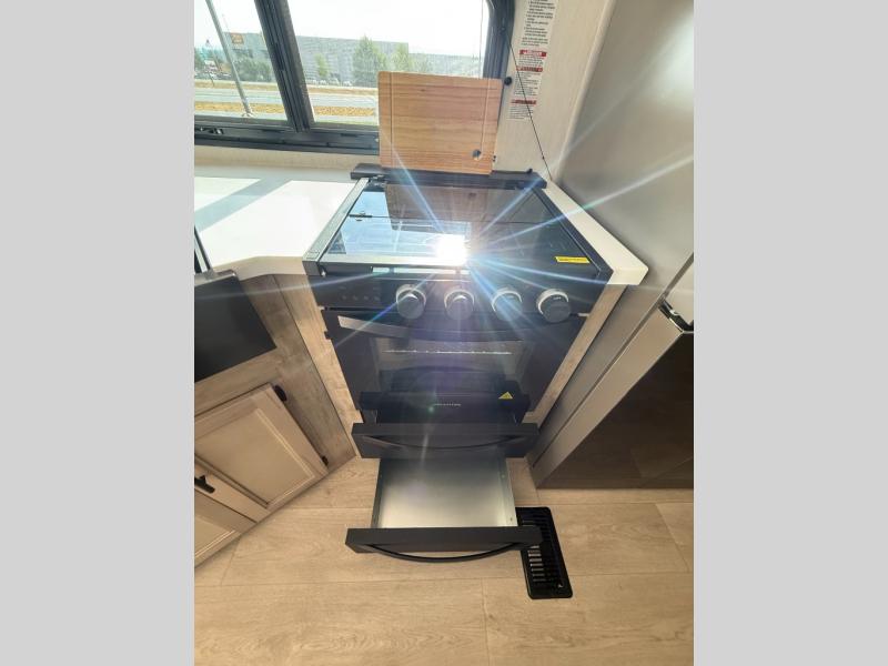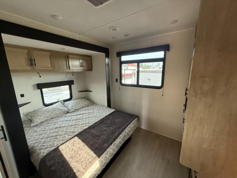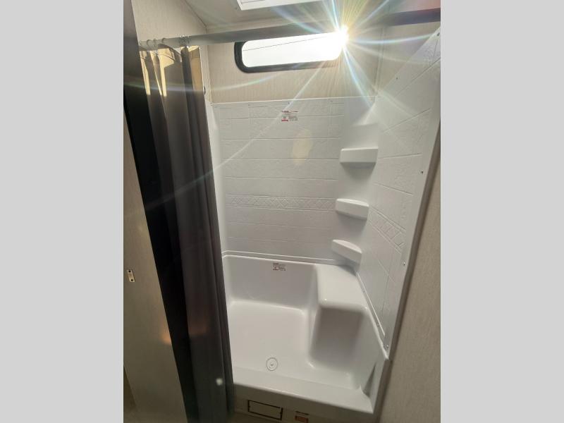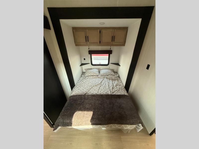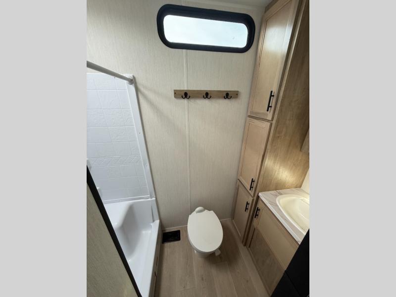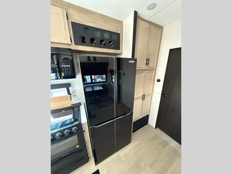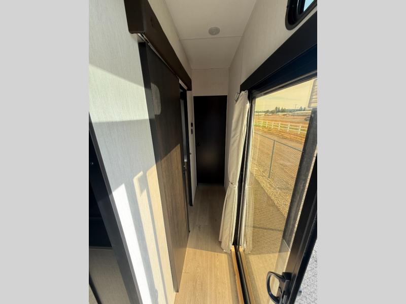 Spacious and comfortable is how you will describe this destination travel trailer featuring triple slides, two full baths, and a spacious combined kitchen and living area thanks to the large slide here featuring a free standing dinette and hide-a-bed sofa. The kitchen includes everything you need to comfortably cook while you are away, and allows you to make meals for your family just like at home. There is a large pantry where you can keep plenty of snacks and dry goods for your trip. Two full baths is a convenience especially at night with the front bathroom accessible to all guests just to the right of the main entry door. In the rear of the coach, there is a private bedroom featuring a queen bed slide for added roominess, comfortable sleeping, as well as ample storage between a dresser and wardrobe for your clothing. In the very back, a master suite bath featuring a vanity with a sink, a shower with a seat, and linen storage for your towels and toiletries. The front private bedroom includes a king bed slide, spacious wardrobe and fireplace.