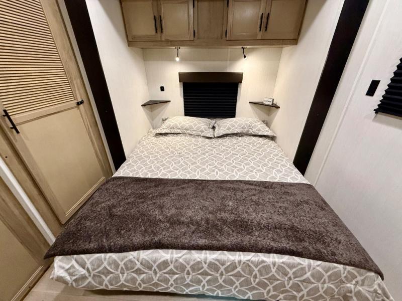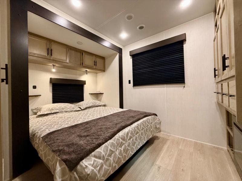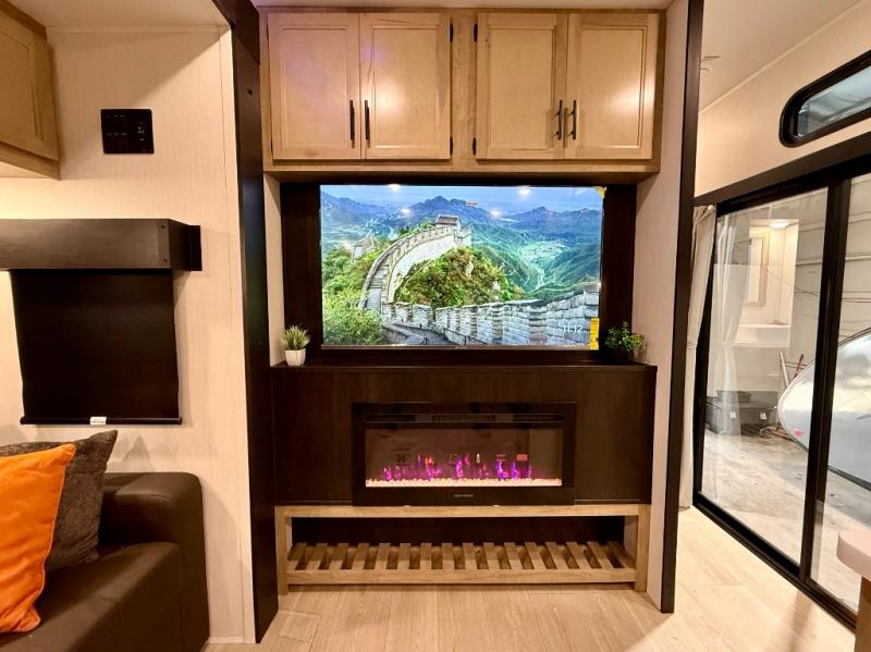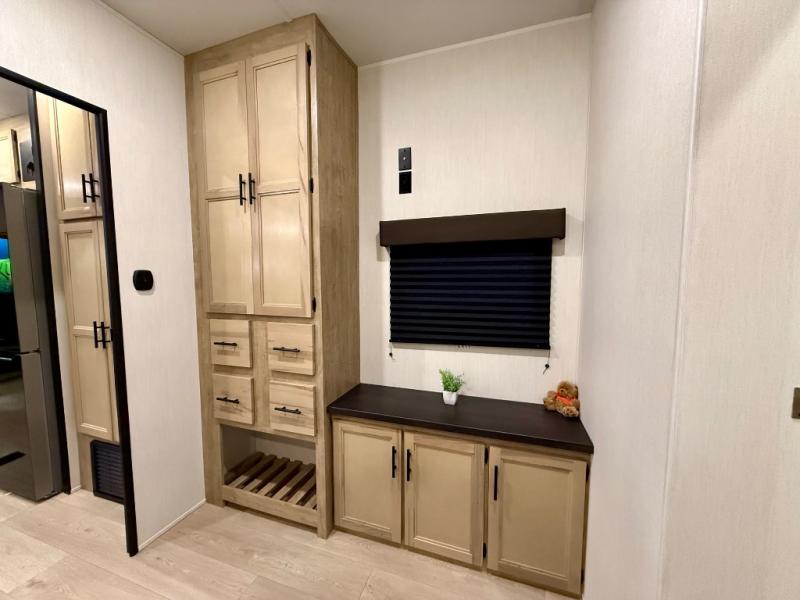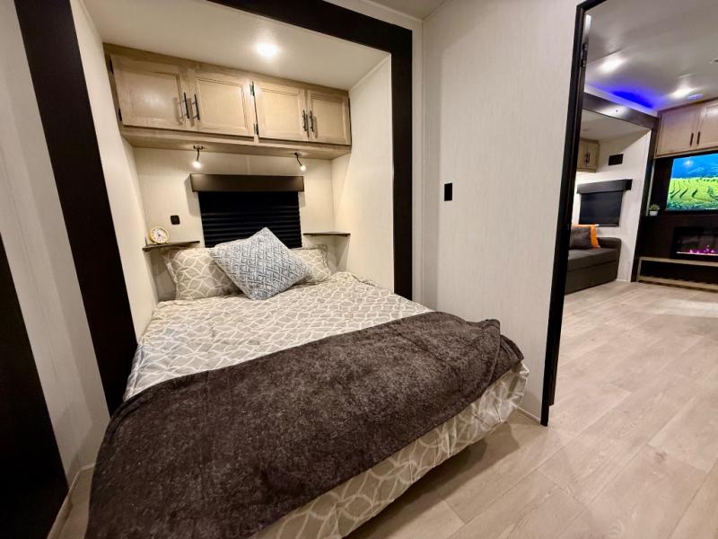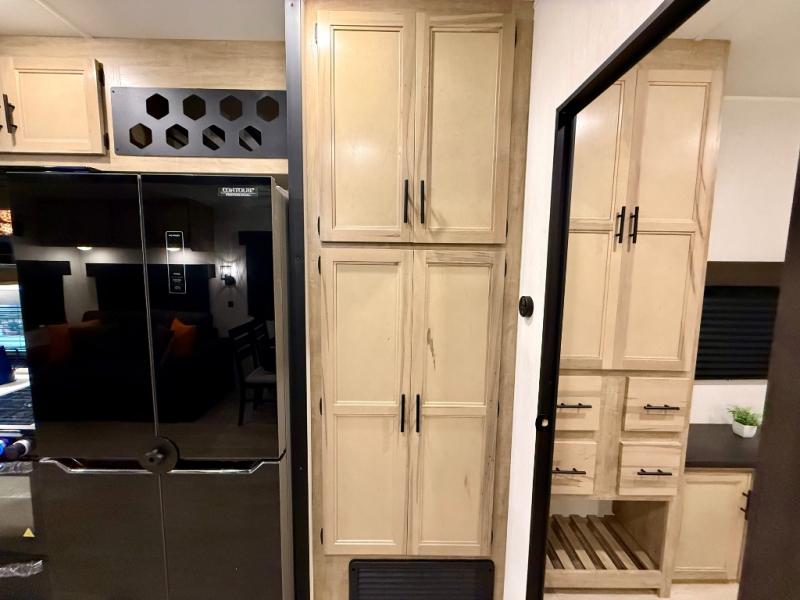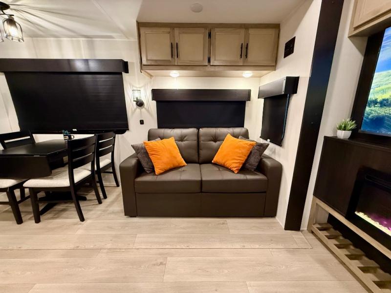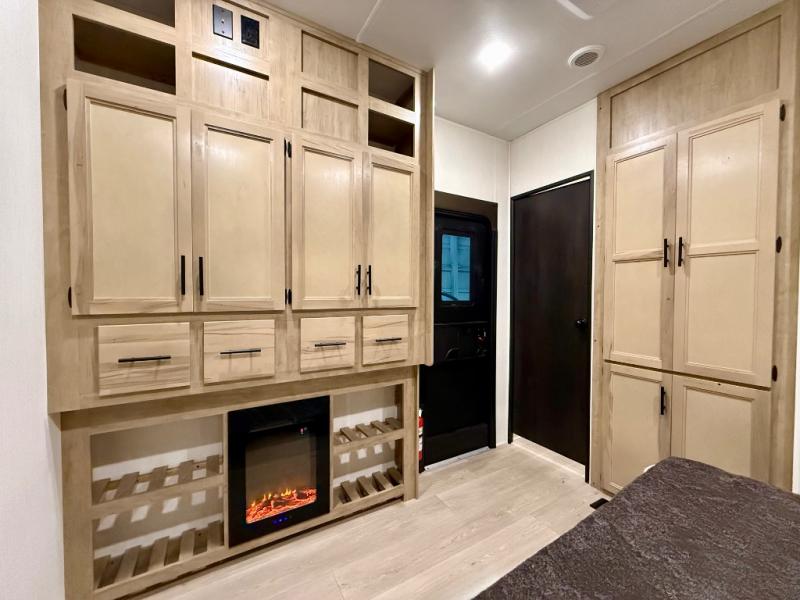 Spacious and comfortable is how you will describe this destination travel trailer featuring triple slides, two full baths, and a spacious combined kitchen and living area thanks to the large slide here featuring a free standing dinette and hide-a-bed sofa. The kitchen includes everything you need to comfortably cook while you are away, and allows you to make meals for your family just like at home. There is a large pantry where you can keep plenty of snacks and dry goods for your trip. Two full baths is a convenience especially at night with the front bathroom accessible to all guests just to the right of the main entry door. In the rear of the coach, there is a private bedroom featuring a queen bed slide for added roominess, comfortable sleeping, as well as ample storage between a dresser and wardrobe for your clothing. In the very back, a master suite bath featuring a vanity with a sink, a shower with a seat, and linen storage for your towels and toiletries. The front private bedroom includes a king bed slide, spacious wardrobe and fireplace.