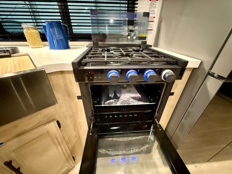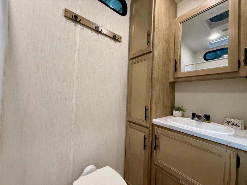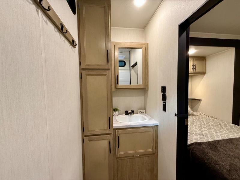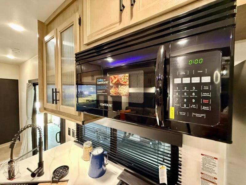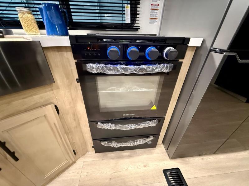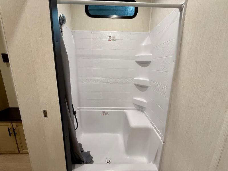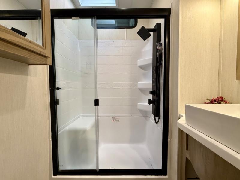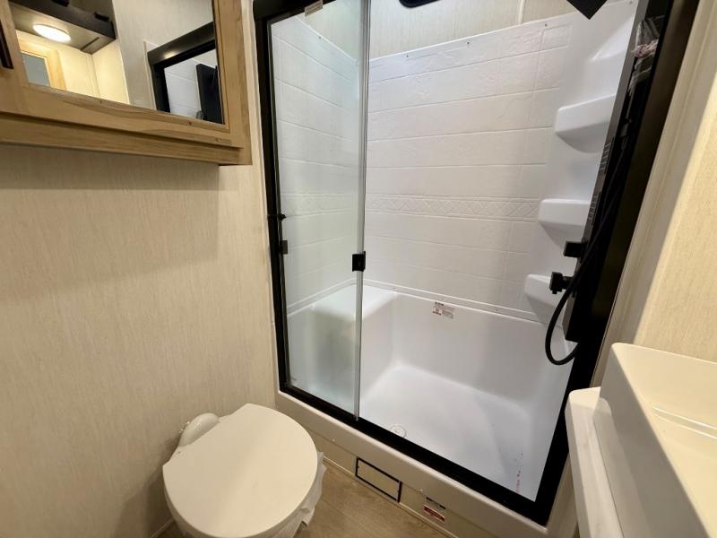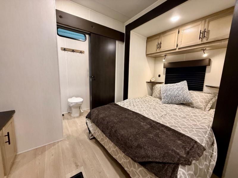 Spacious and comfortable is how you will describe this destination travel trailer featuring triple slides, two full baths, and a spacious combined kitchen and living area thanks to the large slide here featuring a free standing dinette and hide-a-bed sofa. The kitchen includes everything you need to comfortably cook while you are away, and allows you to make meals for your family just like at home. There is a large pantry where you can keep plenty of snacks and dry goods for your trip. Two full baths is a convenience especially at night with the front bathroom accessible to all guests just to the right of the main entry door. In the rear of the coach, there is a private bedroom featuring a queen bed slide for added roominess, comfortable sleeping, as well as ample storage between a dresser and wardrobe for your clothing. In the very back, a master suite bath featuring a vanity with a sink, a shower with a seat, and linen storage for your towels and toiletries. The front private bedroom includes a king bed slide, spacious wardrobe and fireplace.