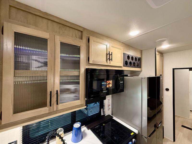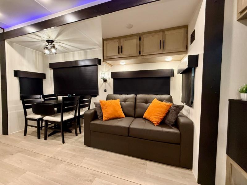 Enjoy comforts of home wherever you decide to roam in a Cherokee Timberwolf Black Label destination trailer by Forest River. The seamless roofing membrane with heat reflectivity and power gear frame technology provide a durable foundation to your RV. You will also appreciate the exclusive solar thermo controlled reflective tinted safety glass windows, tire pressure monitors, and an on-demand tankless water heater to make extended stays easier than ever. Inside, the night shades will provide your crew with privacy, while the LED lights illuminate your space. There are also seamless countertops, along with a premium bedding ensemble and comforter, USB charging stations, and a supersized central A/C unit. The Black Label Package features hung fiberglass gel coat sided walls, Thermo-Foil Arctic insulation, and a frameless window package. There are also upgraded reading lights, designer cushion fabric, and upgraded solid surface countertops to have you feeling right at home!