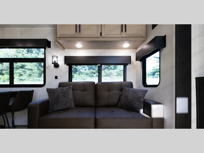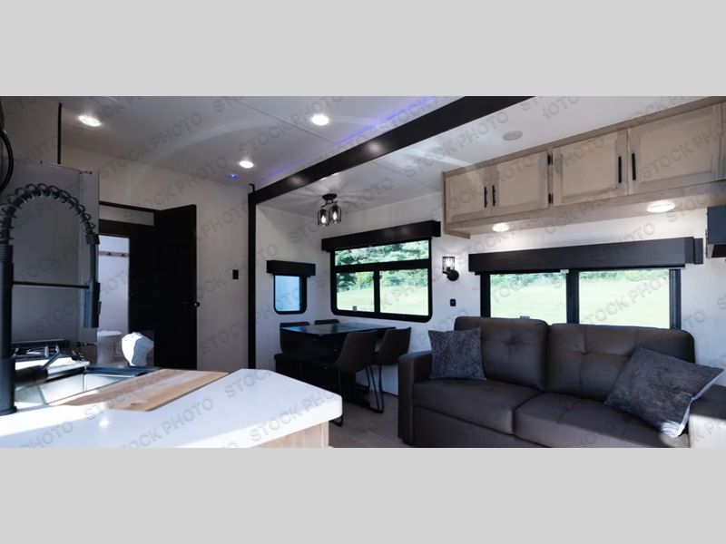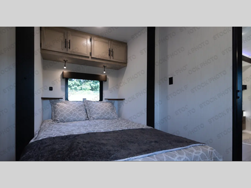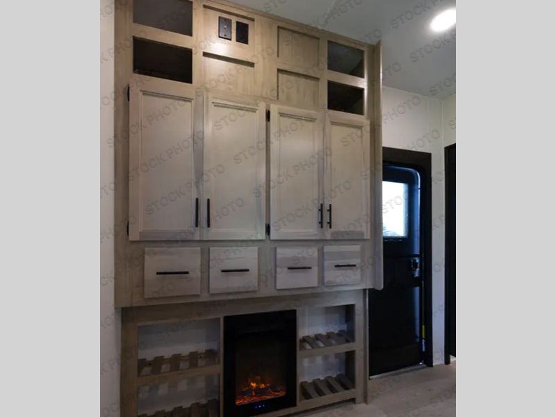 Spacious and comfortable is how you will describe this destination travel trailer featuring triple slides, two full baths, and a spacious combined kitchen and living area thanks to the large slide here featuring a free standing dinette and hide-a-bed sofa. The kitchen includes everything you need to comfortably cook while you are away, and allows you to make meals for your family just like at home. There is a large pantry where you can keep plenty of snacks and dry goods for your trip. Two full baths is a convenience especially at night with the front bathroom accessible to all guests just to the right of the main entry door. In the rear of the coach, there is a private bedroom featuring a queen bed slide for added roominess, comfortable sleeping, as well as ample storage between a dresser and wardrobe for your clothing. In the very back, a master suite bath featuring a vanity with a sink, a shower with a seat, and linen storage for your towels and toiletries. The front private bedroom includes a king bed slide, spacious wardrobe and fireplace.