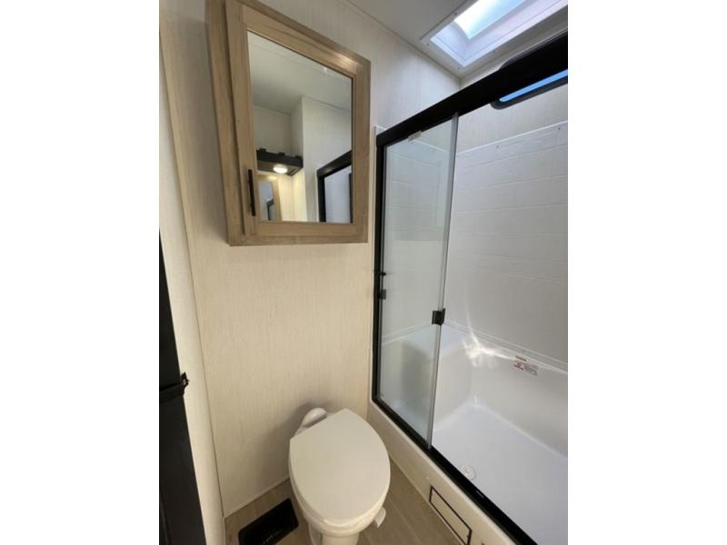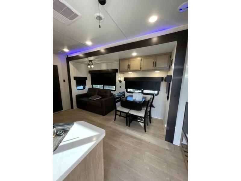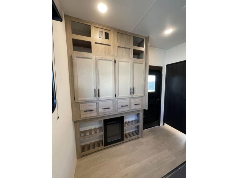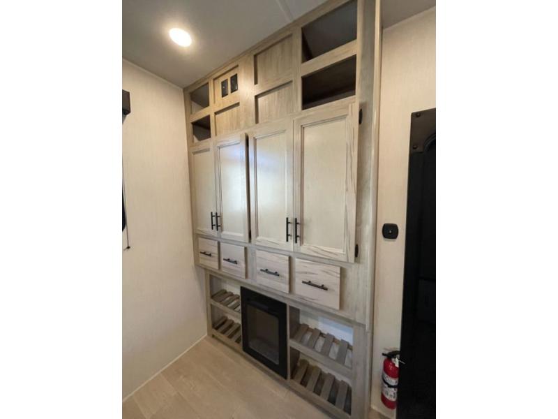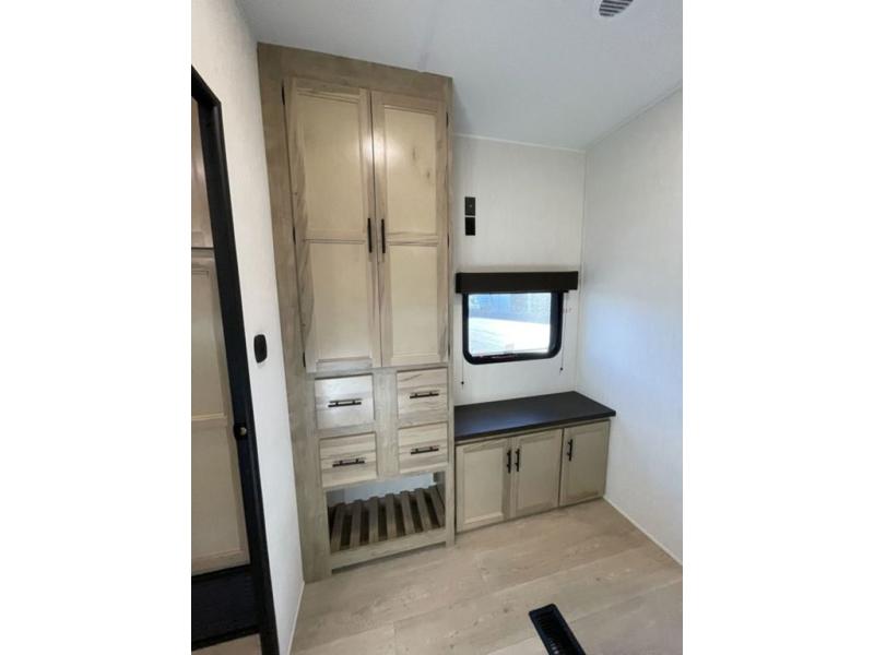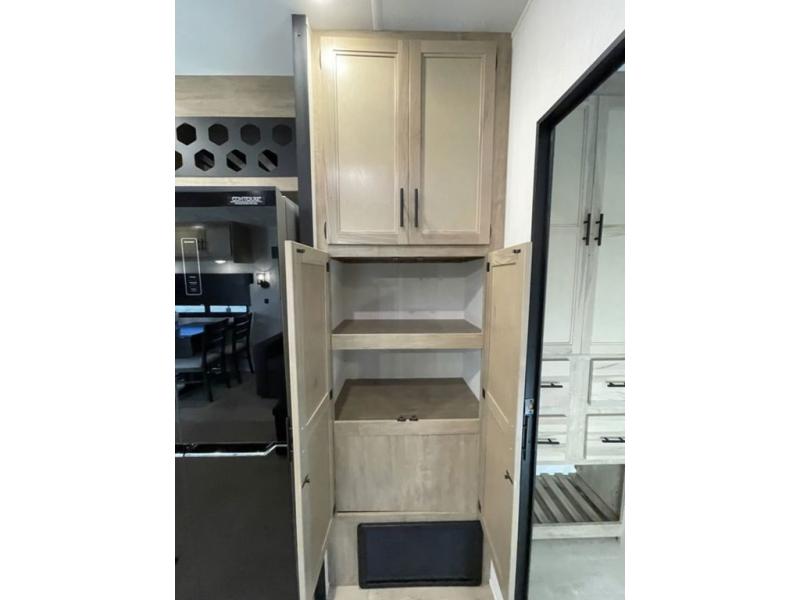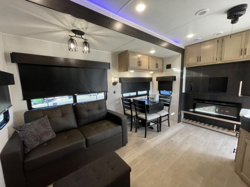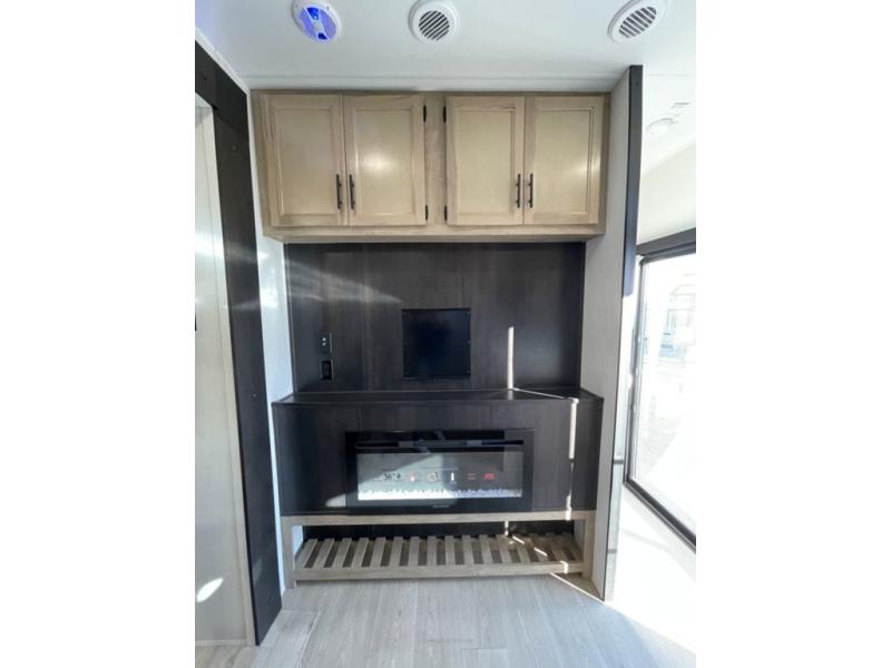 Spacious and comfortable is how you will describe this destination travel trailer featuring triple slides, two full baths, and a spacious combined kitchen and living area thanks to the large slide here featuring a free standing dinette and hide-a-bed sofa. The kitchen includes everything you need to comfortably cook while you are away, and allows you to make meals for your family just like at home. There is a large pantry where you can keep plenty of snacks and dry goods for your trip. Two full baths is a convenience especially at night with the front bathroom accessible to all guests just to the right of the main entry door. In the rear of the coach, there is a private bedroom featuring a queen bed slide for added roominess, comfortable sleeping, as well as ample storage between a dresser and wardrobe for your clothing. In the very back, a master suite bath featuring a vanity with a sink, a shower with a seat, and linen storage for your towels and toiletries. The front private bedroom includes a king bed slide, spacious wardrobe and fireplace.