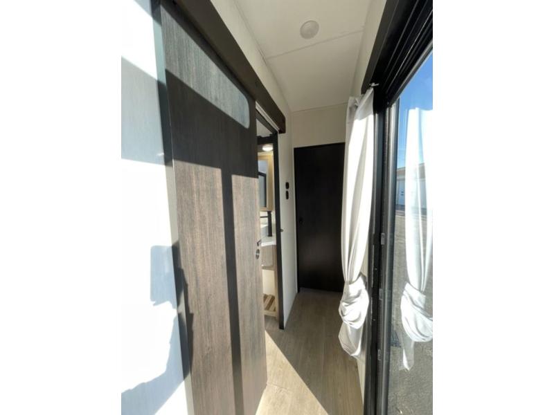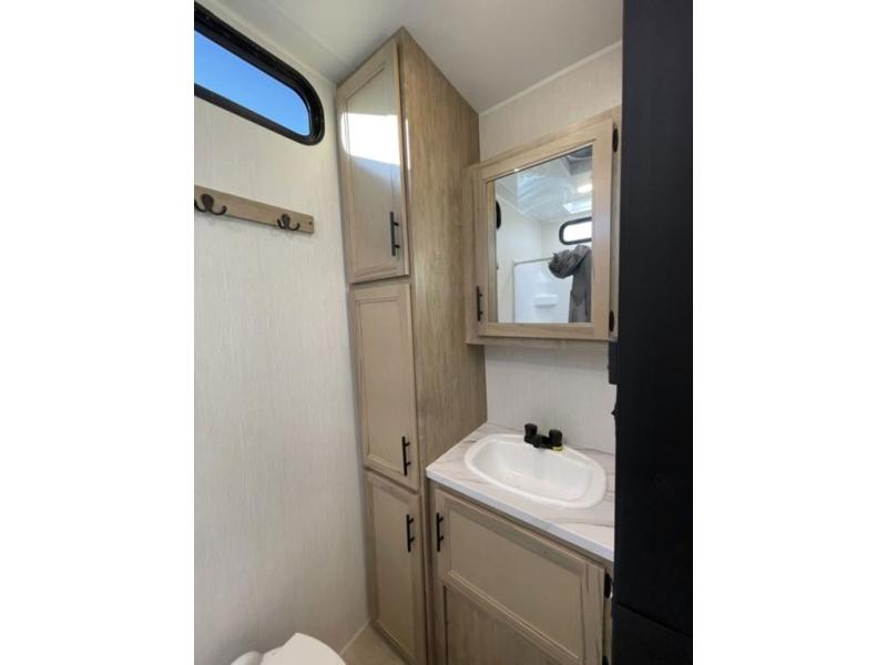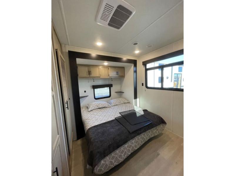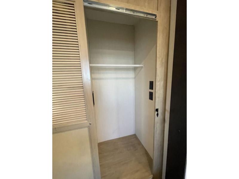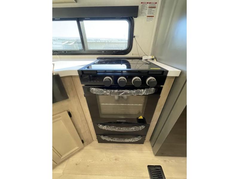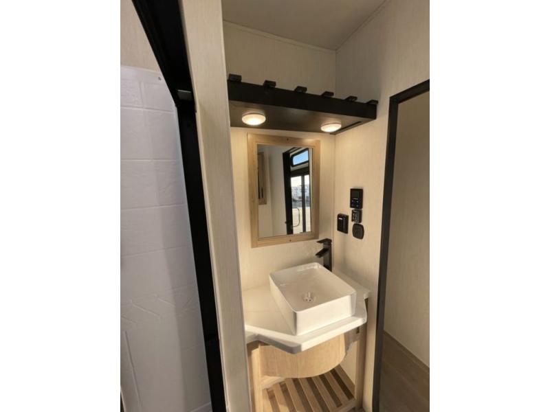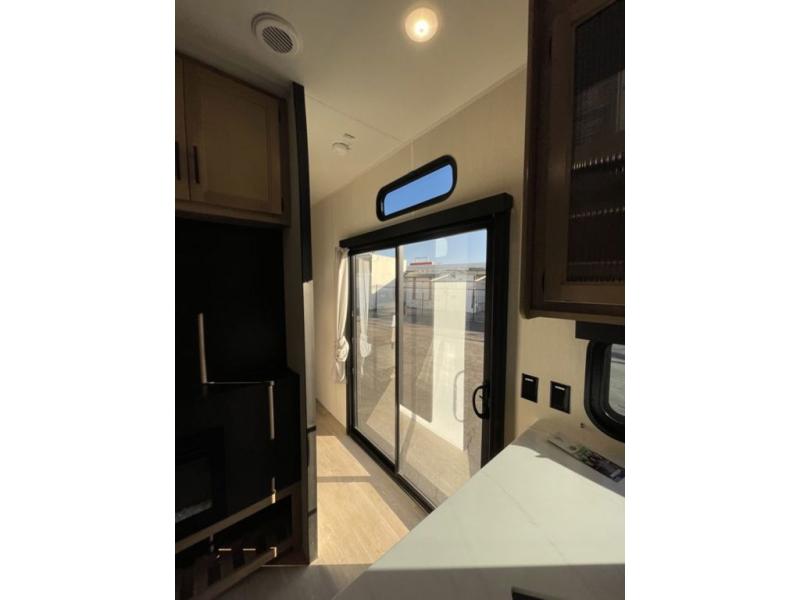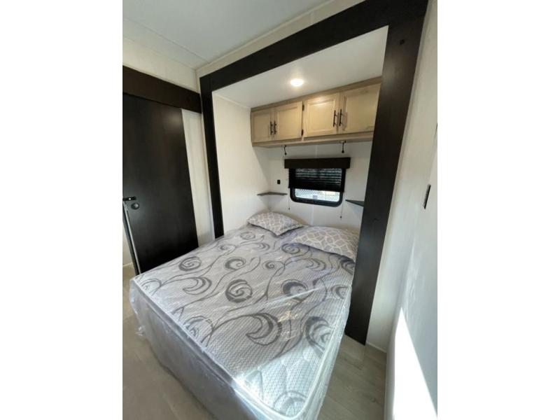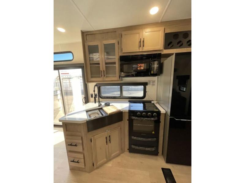 Spacious and comfortable is how you will describe this destination travel trailer featuring triple slides, two full baths, and a spacious combined kitchen and living area thanks to the large slide here featuring a free standing dinette and hide-a-bed sofa. The kitchen includes everything you need to comfortably cook while you are away, and allows you to make meals for your family just like at home. There is a large pantry where you can keep plenty of snacks and dry goods for your trip. Two full baths is a convenience especially at night with the front bathroom accessible to all guests just to the right of the main entry door. In the rear of the coach, there is a private bedroom featuring a queen bed slide for added roominess, comfortable sleeping, as well as ample storage between a dresser and wardrobe for your clothing. In the very back, a master suite bath featuring a vanity with a sink, a shower with a seat, and linen storage for your towels and toiletries. The front private bedroom includes a king bed slide, spacious wardrobe and fireplace.