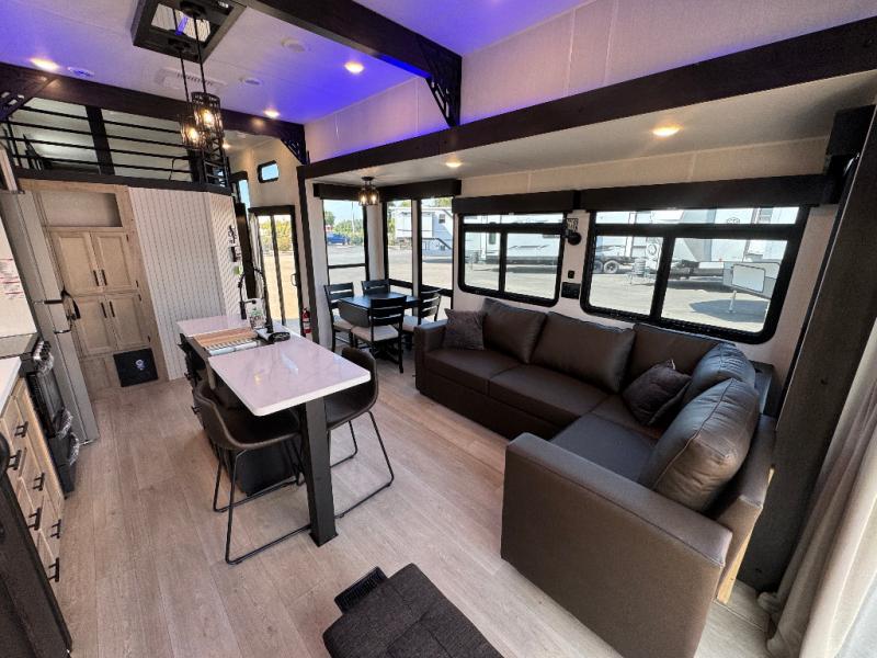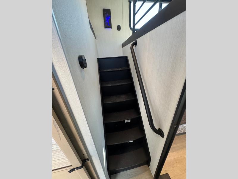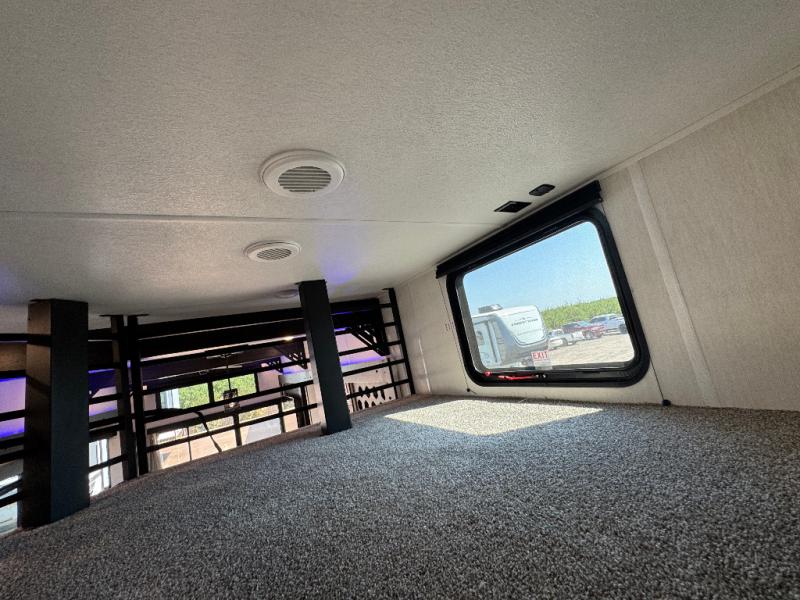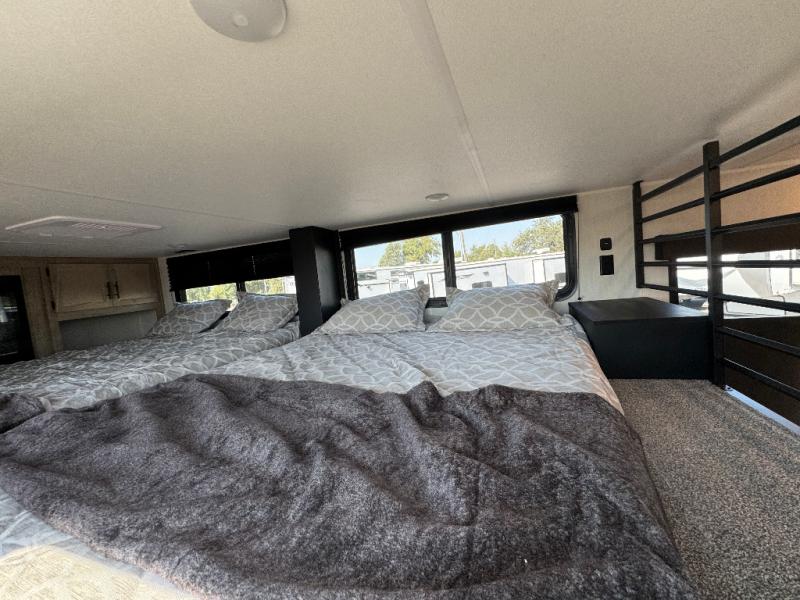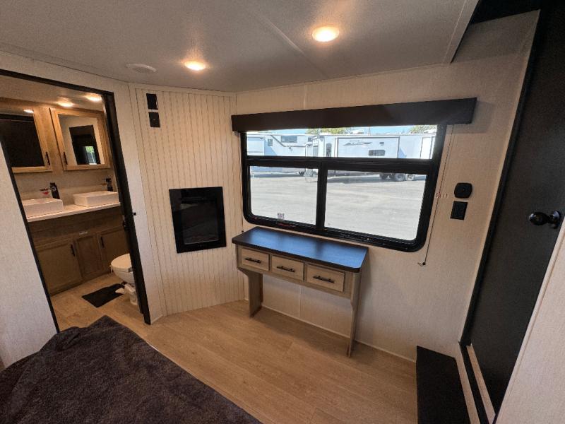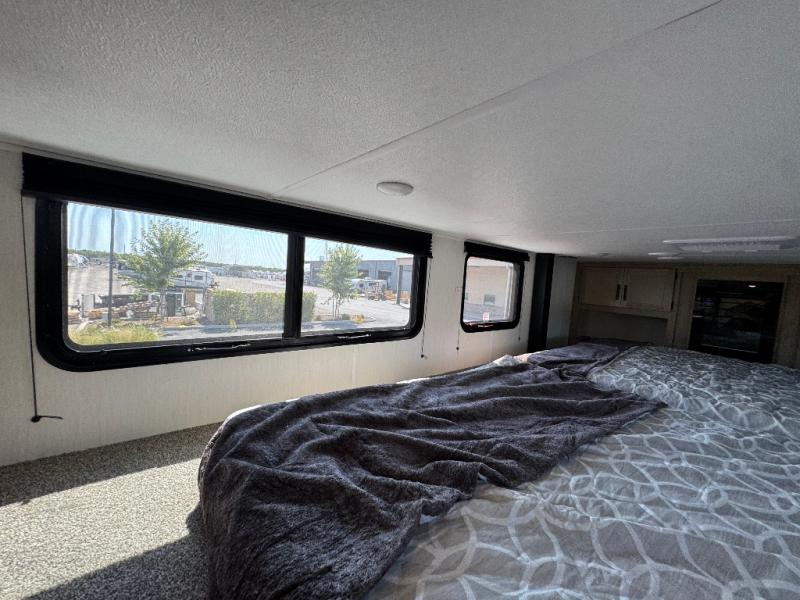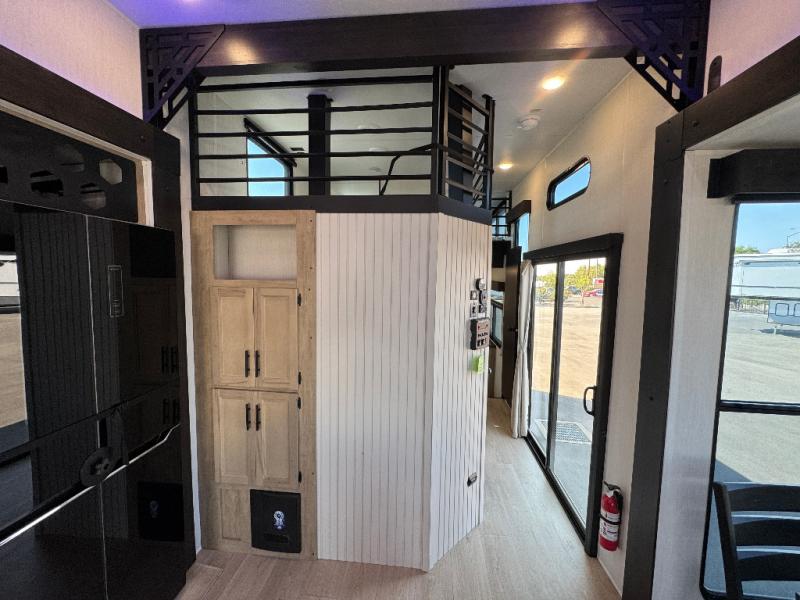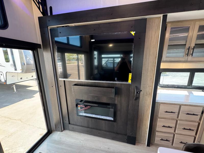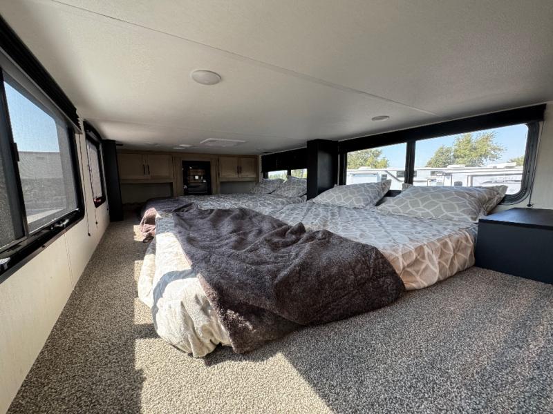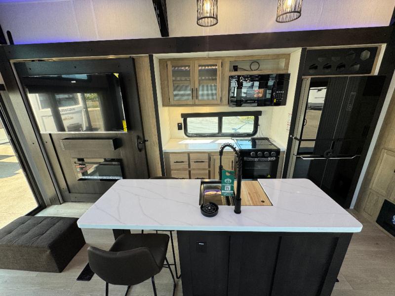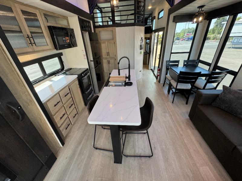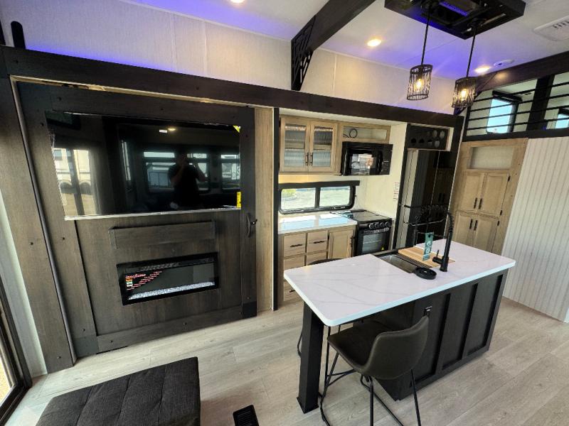 Choosing this destination trailer as your next RV won't be a hard decision! You can enter in through the front bath that includes dual bath sinks, a shower with a seat, and a medicine cabinet for your necessities. The master bedroom is connected to this bath for added convenience, and you're sure to enjoy the bedroom fireplace and king bed slide out. Just outside this room are the stairs that lead to the loft where you'll find two queen-size beds on one side and an open area where the kids can play or to use as storage. A second full bath is found next the stairs on the lower level, and there is a wardrobe with washer/dryer prep if you want to add these appliances. Everyone will love to join together and visit in the combined kitchen and living room. Here, you'll find a free-standing dinette, an L-shaped sofa, a kitchen island with two chairs, plus an entertainment center with a fireplace! The hidden pantry behind the fireplace will let you keep food stocked, and the rear patio doors will let natural light in!