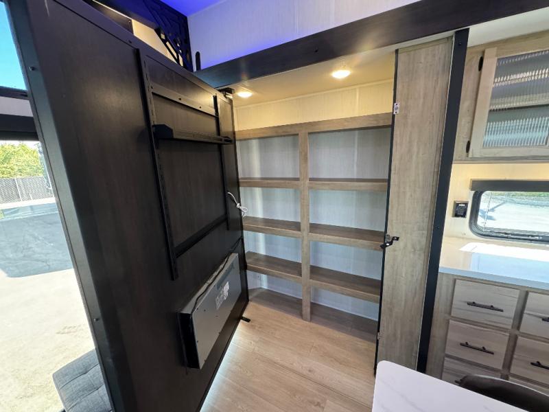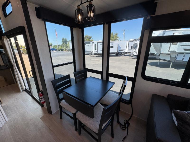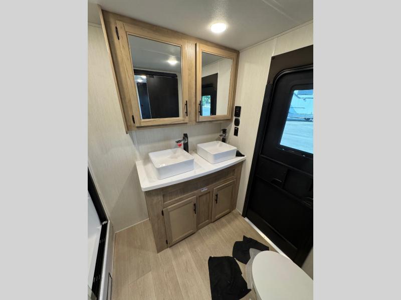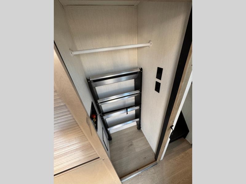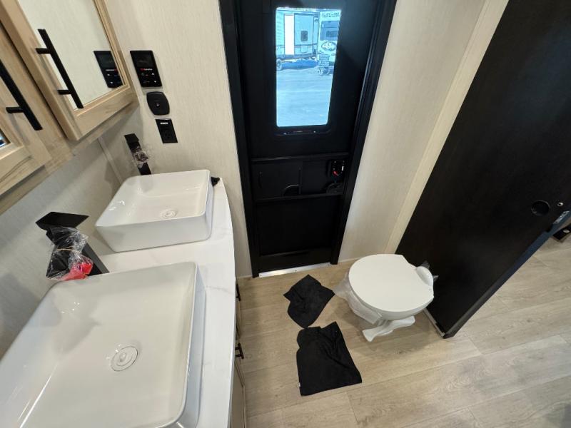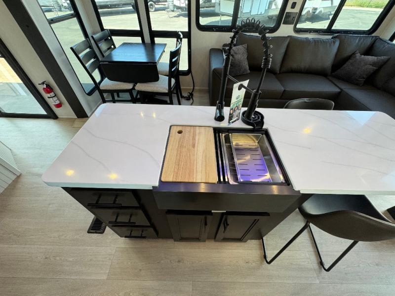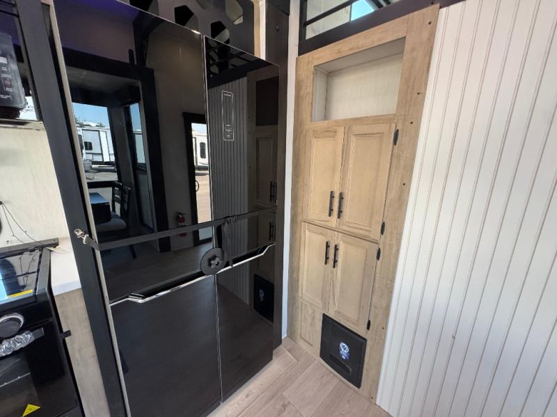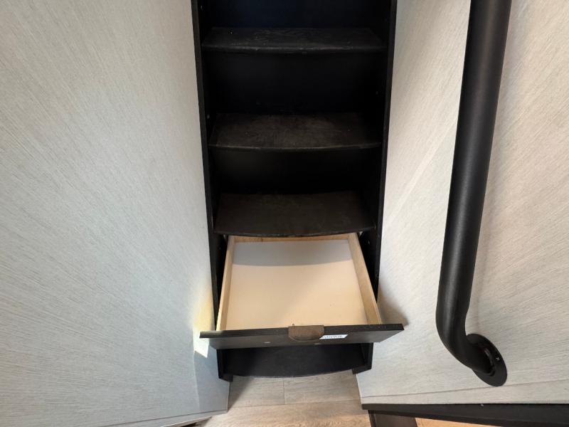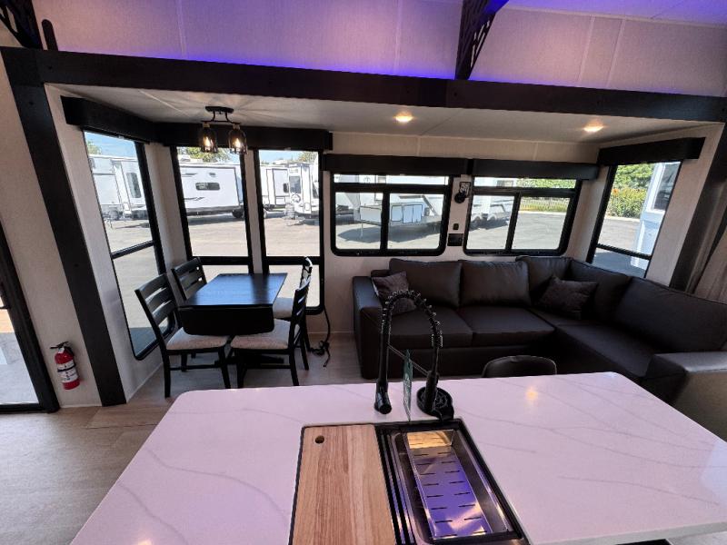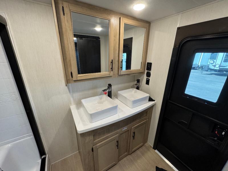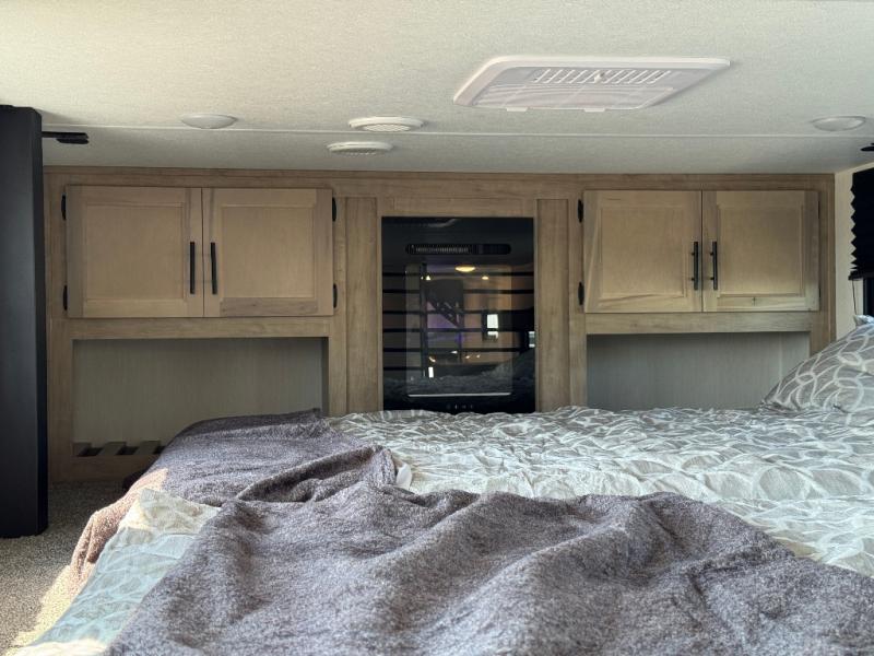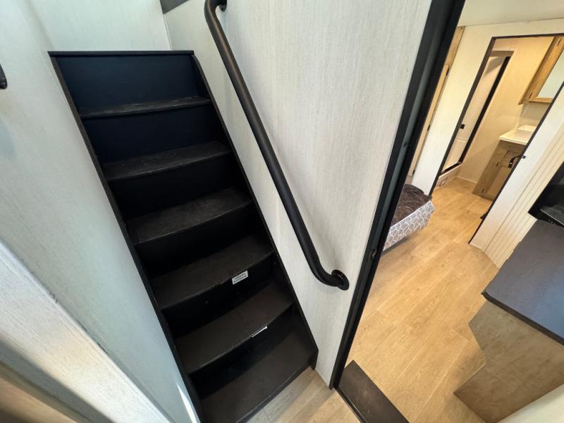 Choosing this destination trailer as your next RV won't be a hard decision! You can enter in through the front bath that includes dual bath sinks, a shower with a seat, and a medicine cabinet for your necessities. The master bedroom is connected to this bath for added convenience, and you're sure to enjoy the bedroom fireplace and king bed slide out. Just outside this room are the stairs that lead to the loft where you'll find two queen-size beds on one side and an open area where the kids can play or to use as storage. A second full bath is found next the stairs on the lower level, and there is a wardrobe with washer/dryer prep if you want to add these appliances. Everyone will love to join together and visit in the combined kitchen and living room. Here, you'll find a free-standing dinette, an L-shaped sofa, a kitchen island with two chairs, plus an entertainment center with a fireplace! The hidden pantry behind the fireplace will let you keep food stocked, and the rear patio doors will let natural light in!