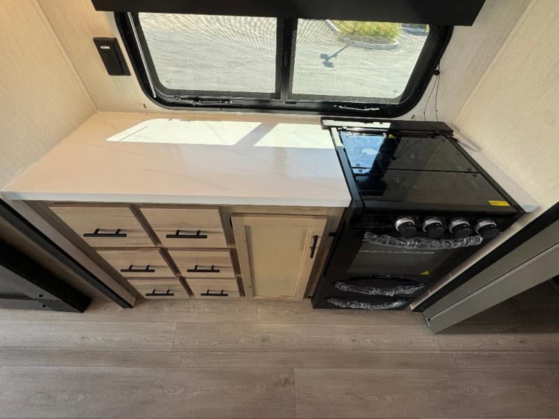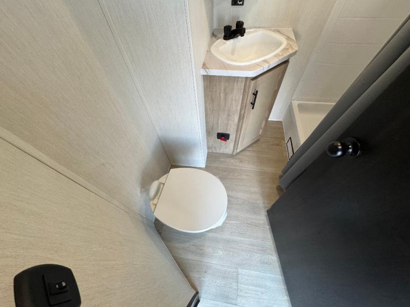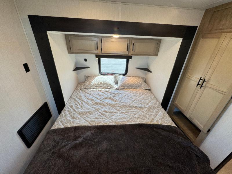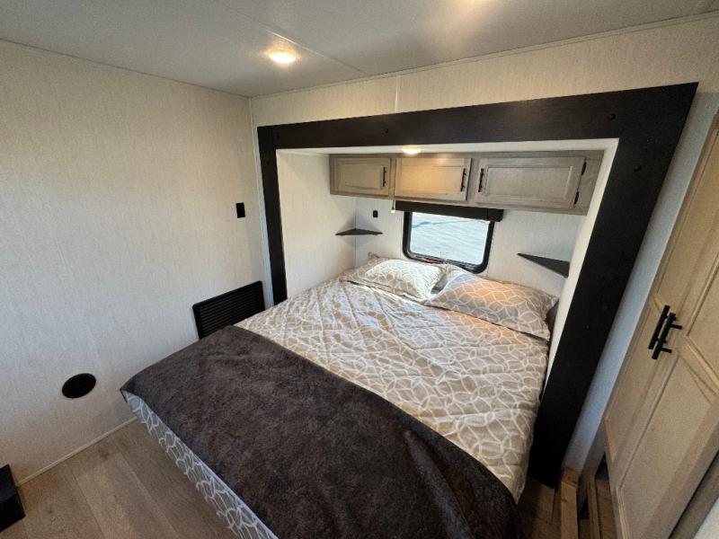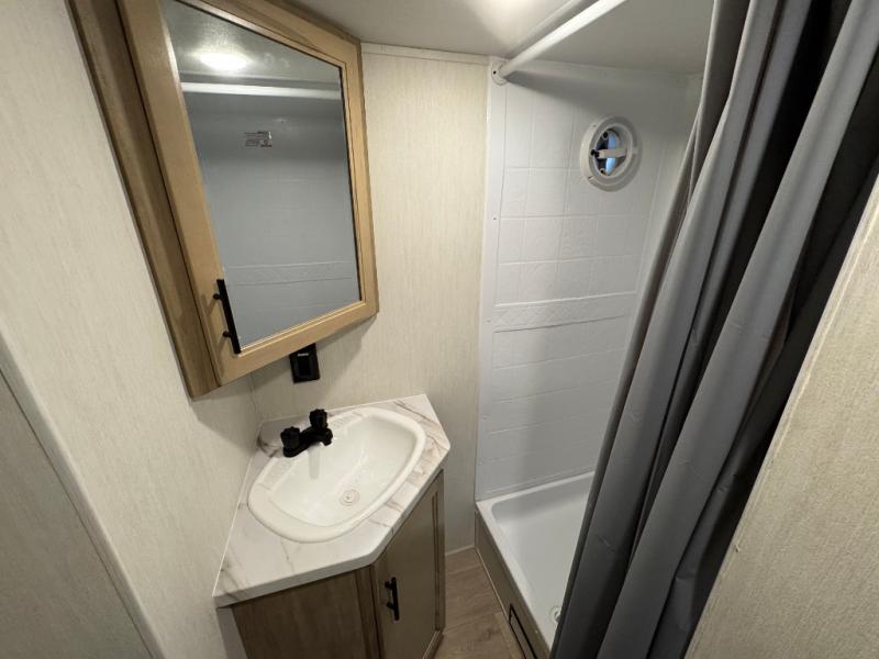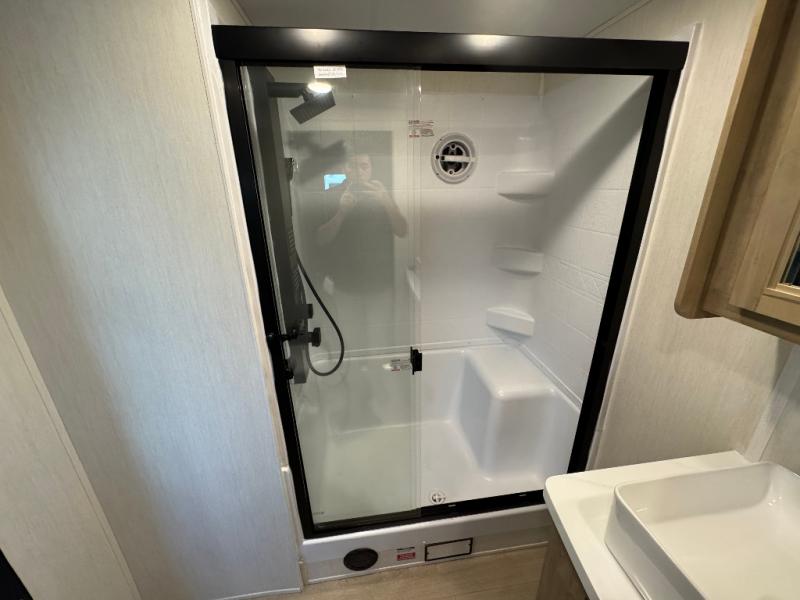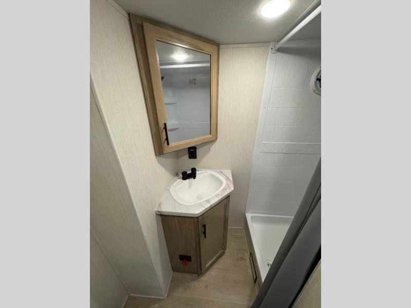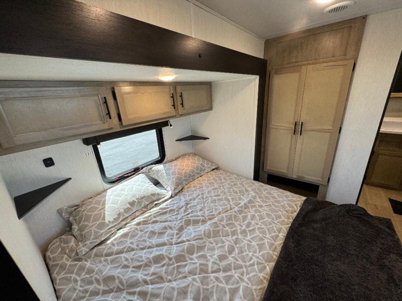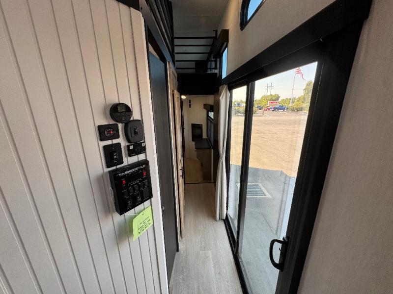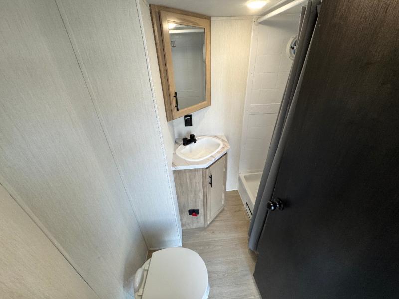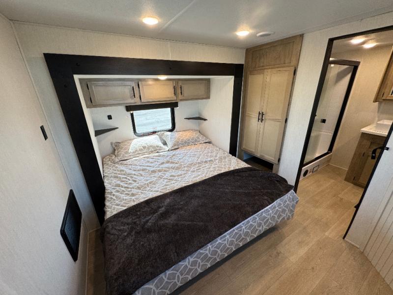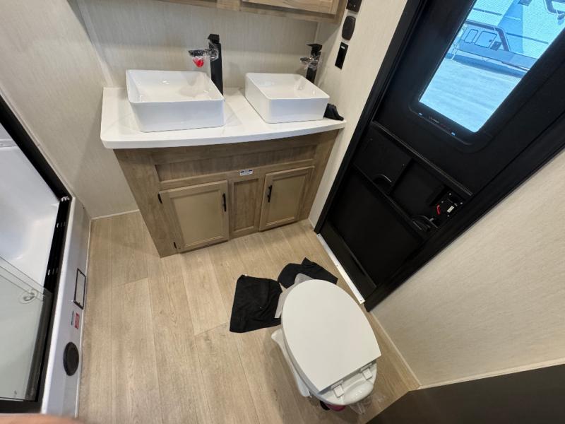 Choosing this destination trailer as your next RV won't be a hard decision! You can enter in through the front bath that includes dual bath sinks, a shower with a seat, and a medicine cabinet for your necessities. The master bedroom is connected to this bath for added convenience, and you're sure to enjoy the bedroom fireplace and king bed slide out. Just outside this room are the stairs that lead to the loft where you'll find two queen-size beds on one side and an open area where the kids can play or to use as storage. A second full bath is found next the stairs on the lower level, and there is a wardrobe with washer/dryer prep if you want to add these appliances. Everyone will love to join together and visit in the combined kitchen and living room. Here, you'll find a free-standing dinette, an L-shaped sofa, a kitchen island with two chairs, plus an entertainment center with a fireplace! The hidden pantry behind the fireplace will let you keep food stocked, and the rear patio doors will let natural light in!