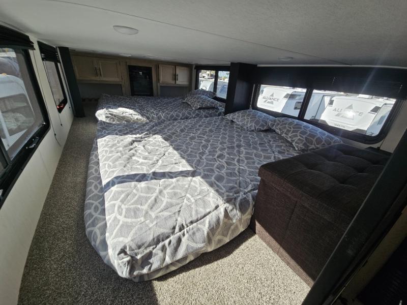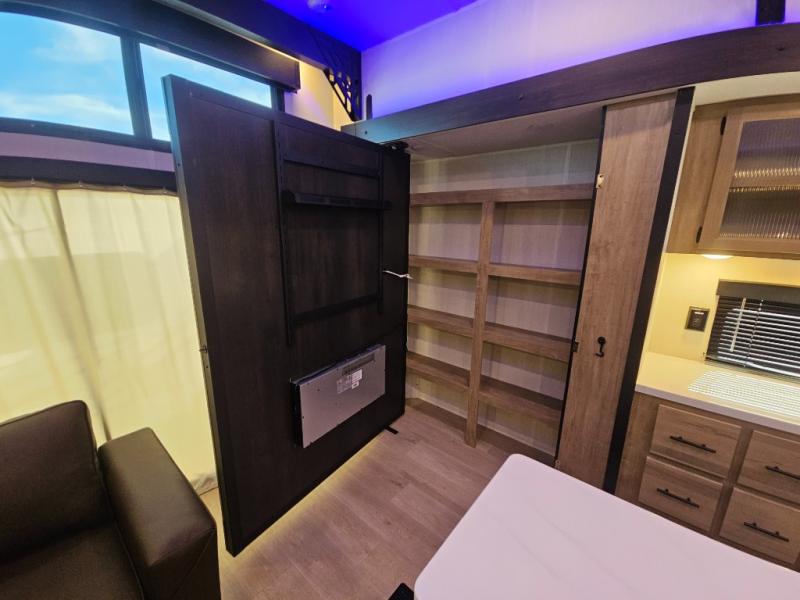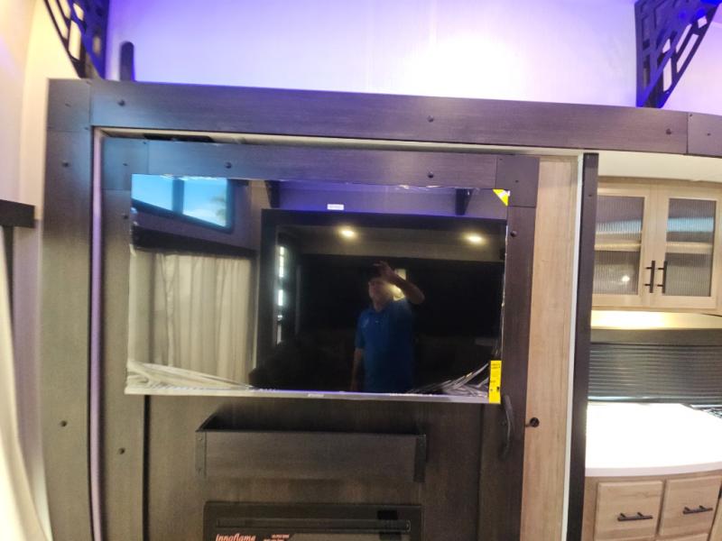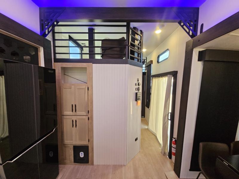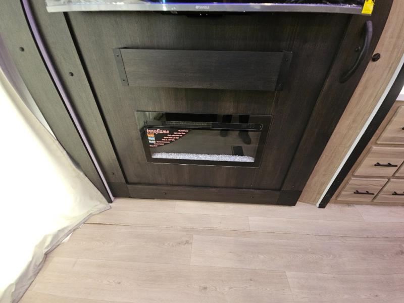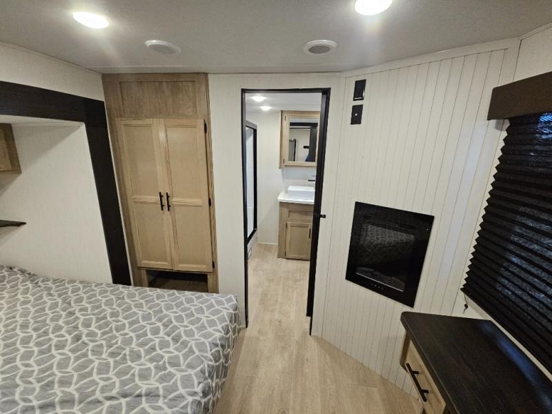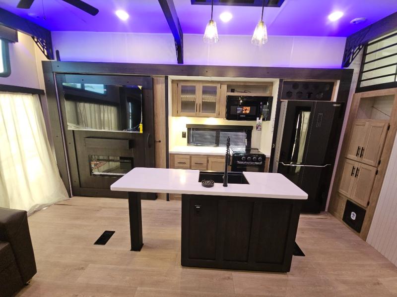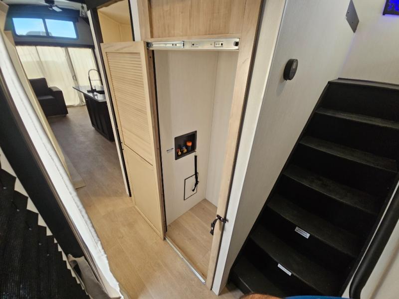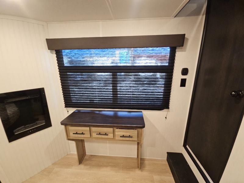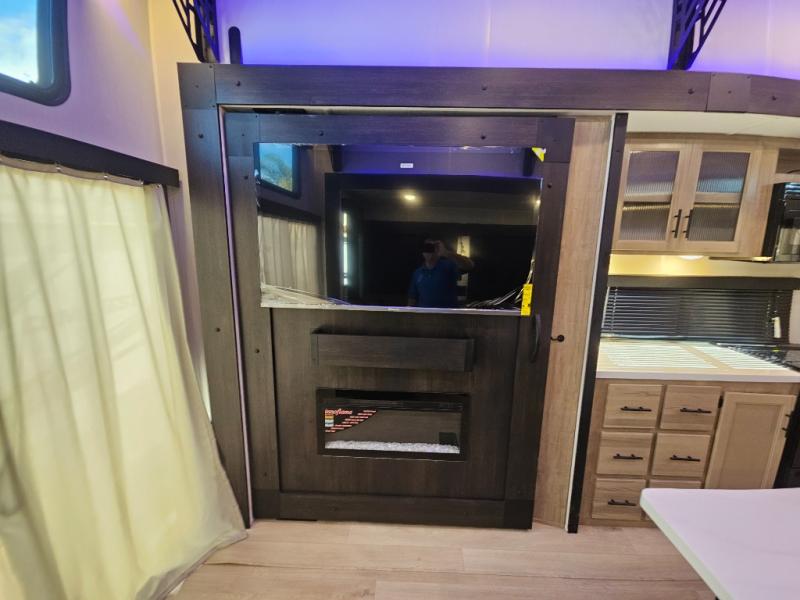 Choosing this destination trailer as your next RV won't be a hard decision! You can enter in through the front bath that includes dual bath sinks, a shower with a seat, and a medicine cabinet for your necessities. The master bedroom is connected to this bath for added convenience, and you're sure to enjoy the bedroom fireplace and king bed slide out. Just outside this room are the stairs that lead to the loft where you'll find two queen-size beds on one side and an open area where the kids can play or to use as storage. A second full bath is found next the stairs on the lower level, and there is a wardrobe with washer/dryer prep if you want to add these appliances. Everyone will love to join together and visit in the combined kitchen and living room. Here, you'll find a free-standing dinette, an L-shaped sofa, a kitchen island with two chairs, plus an entertainment center with a fireplace! The hidden pantry behind the fireplace will let you keep food stocked, and the rear patio doors will let natural light in!