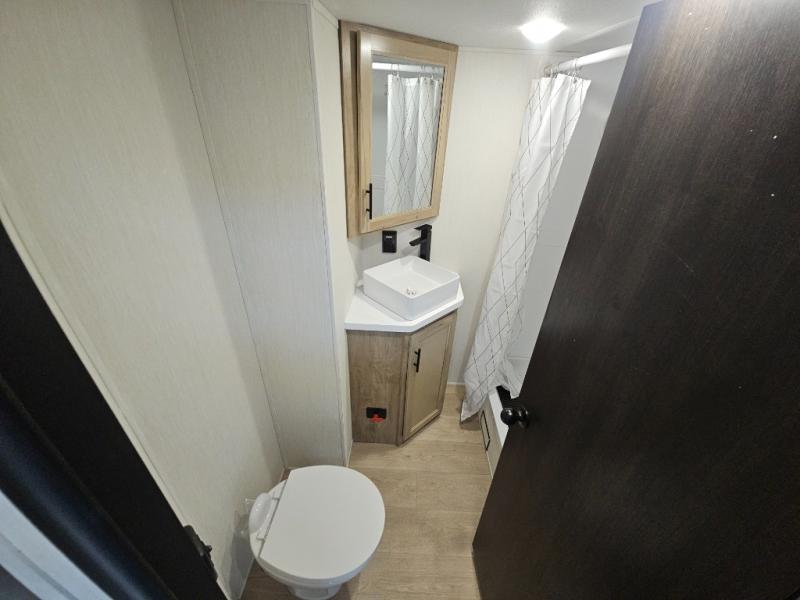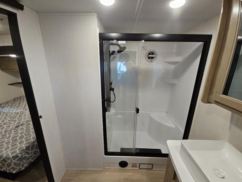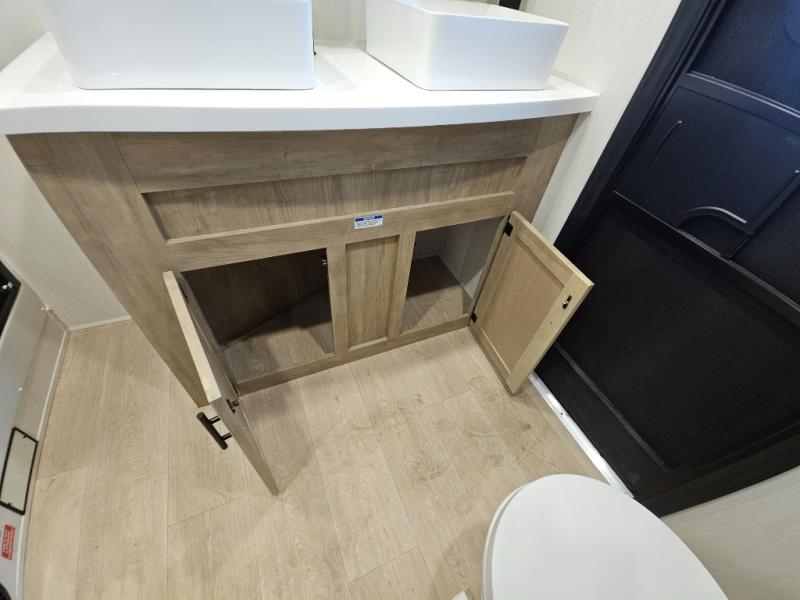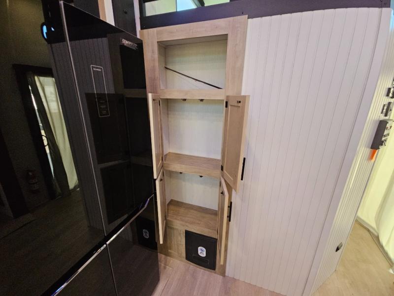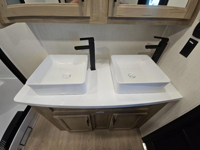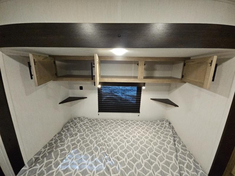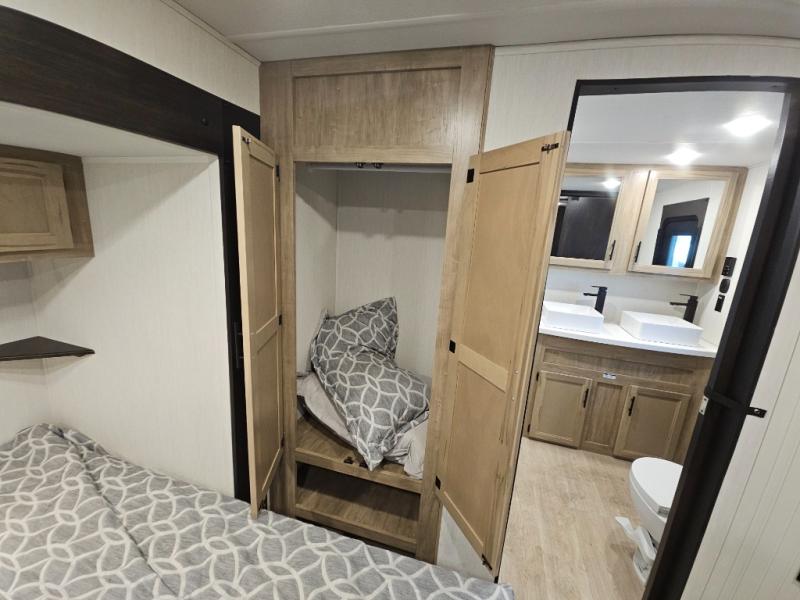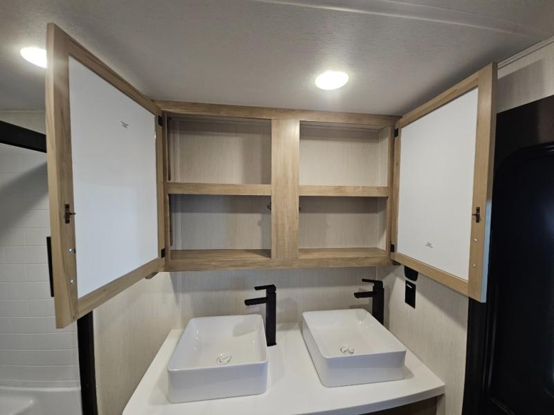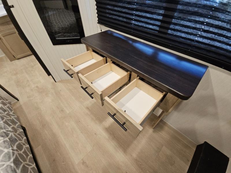 Choosing this destination trailer as your next RV won't be a hard decision! You can enter in through the front bath that includes dual bath sinks, a shower with a seat, and a medicine cabinet for your necessities. The master bedroom is connected to this bath for added convenience, and you're sure to enjoy the bedroom fireplace and king bed slide out. Just outside this room are the stairs that lead to the loft where you'll find two queen-size beds on one side and an open area where the kids can play or to use as storage. A second full bath is found next the stairs on the lower level, and there is a wardrobe with washer/dryer prep if you want to add these appliances. Everyone will love to join together and visit in the combined kitchen and living room. Here, you'll find a free-standing dinette, an L-shaped sofa, a kitchen island with two chairs, plus an entertainment center with a fireplace! The hidden pantry behind the fireplace will let you keep food stocked, and the rear patio doors will let natural light in!