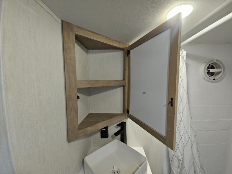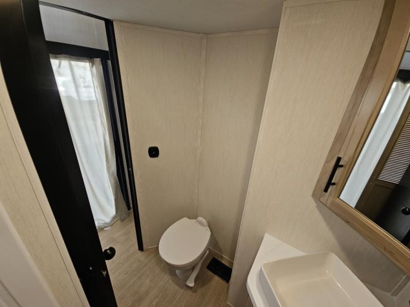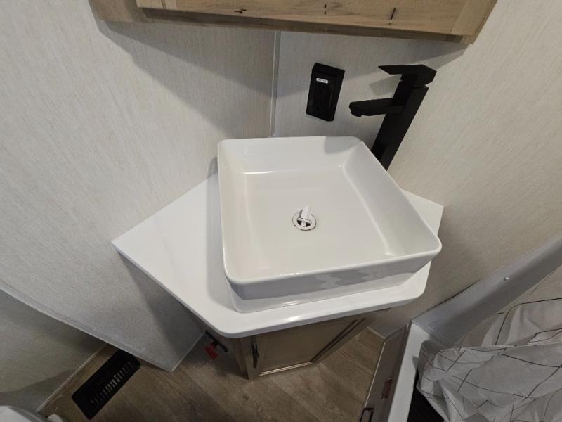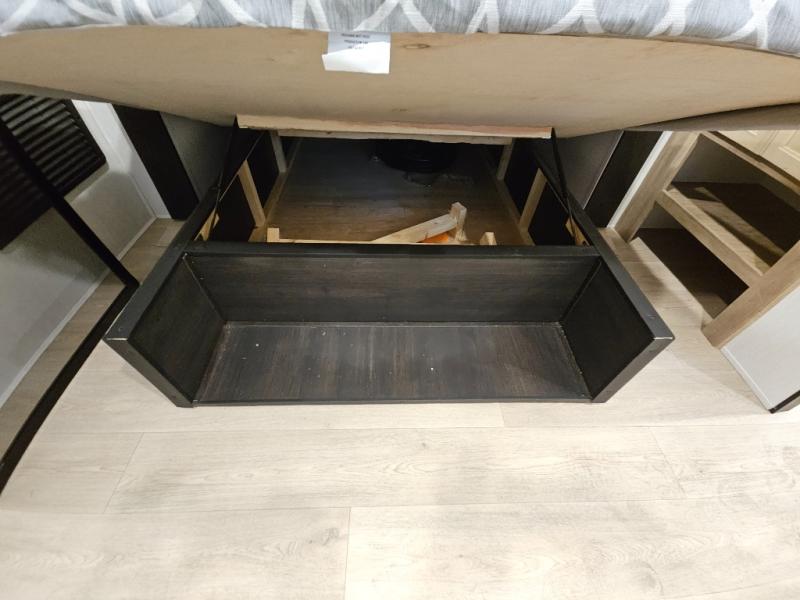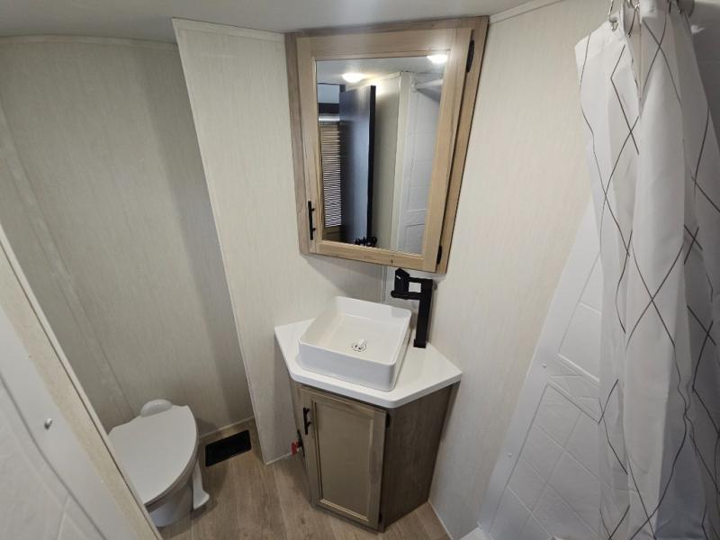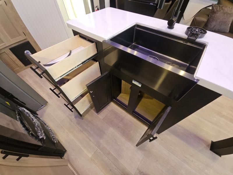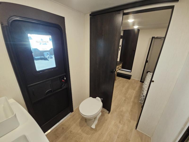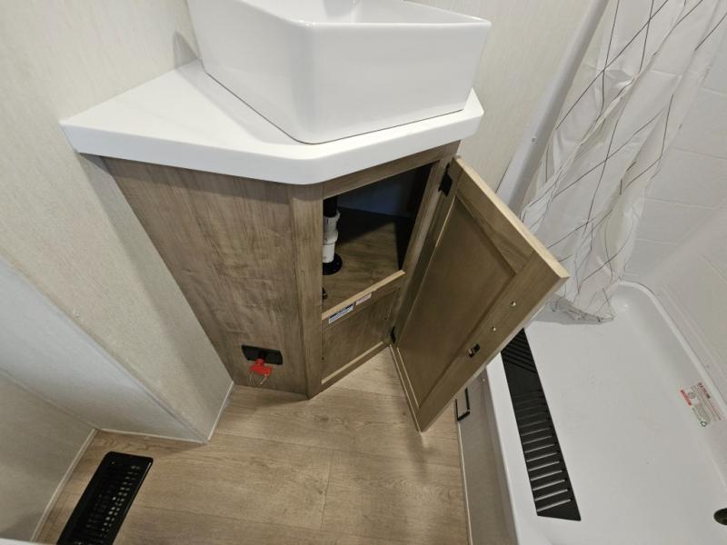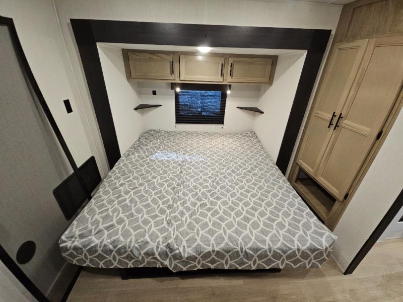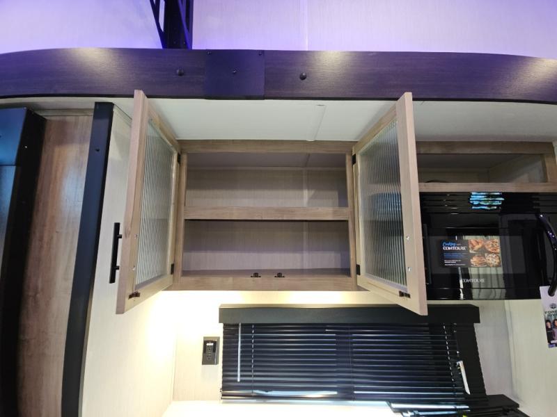 Choosing this destination trailer as your next RV won't be a hard decision! You can enter in through the front bath that includes dual bath sinks, a shower with a seat, and a medicine cabinet for your necessities. The master bedroom is connected to this bath for added convenience, and you're sure to enjoy the bedroom fireplace and king bed slide out. Just outside this room are the stairs that lead to the loft where you'll find two queen-size beds on one side and an open area where the kids can play or to use as storage. A second full bath is found next the stairs on the lower level, and there is a wardrobe with washer/dryer prep if you want to add these appliances. Everyone will love to join together and visit in the combined kitchen and living room. Here, you'll find a free-standing dinette, an L-shaped sofa, a kitchen island with two chairs, plus an entertainment center with a fireplace! The hidden pantry behind the fireplace will let you keep food stocked, and the rear patio doors will let natural light in!