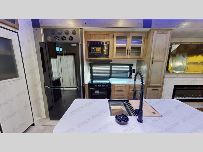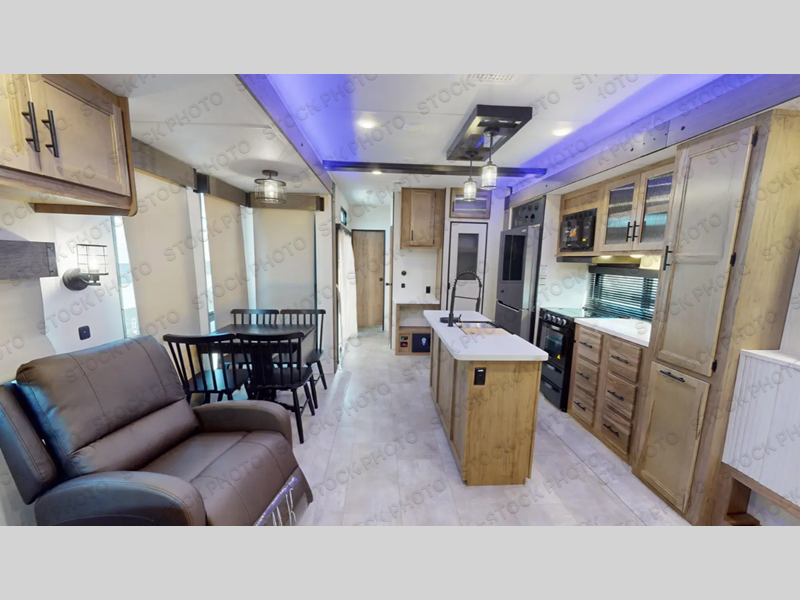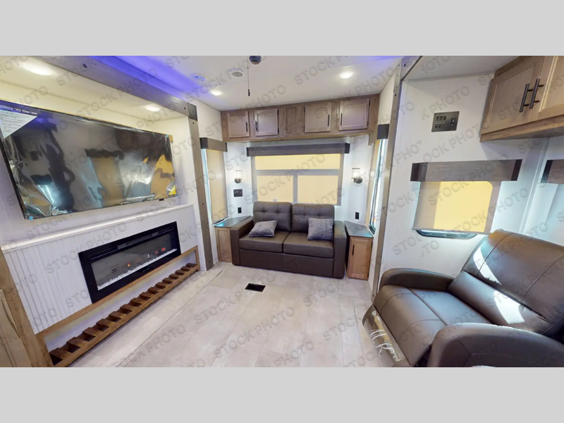 Spacious and comfortable describe this destination travel trailer featuring triple slides with dual opposing slides in the living area which creates a wide open space for a dinette with chairs, two lounge chairs, an entertainment center with a fireplace, and a hide-a-bed sofa along the very front wall. The roadside slide also houses the kitchen appliances which include a refrigerator, stove and microwave oven. There is a pantry and a hutch adjacent to the slide, and a kitchen island for more food prep space. A centrally located half bath is convenient just inside the main patio door entry. Towards the rear of the coach, a private bedroom featuring comfortable sleeping along with storage space for your clothing. In the very back, a master suite bath featuring a vanity with dual sinks, a shower with a seat, linen storage, and a wardrobe with washer and dryer prep.