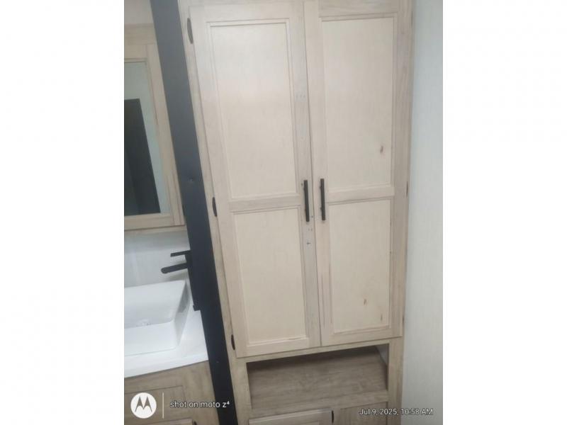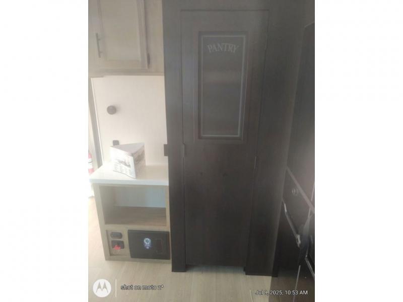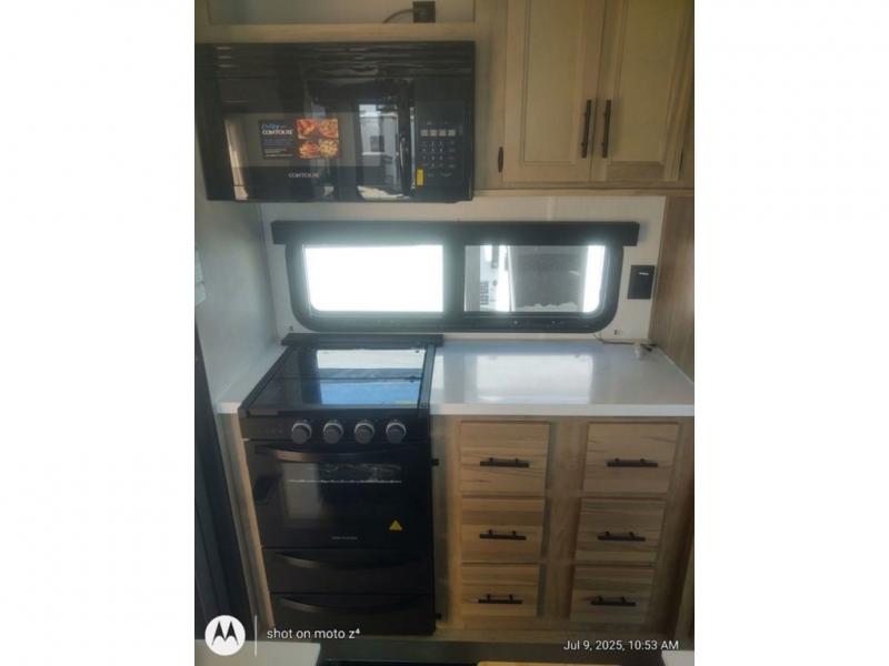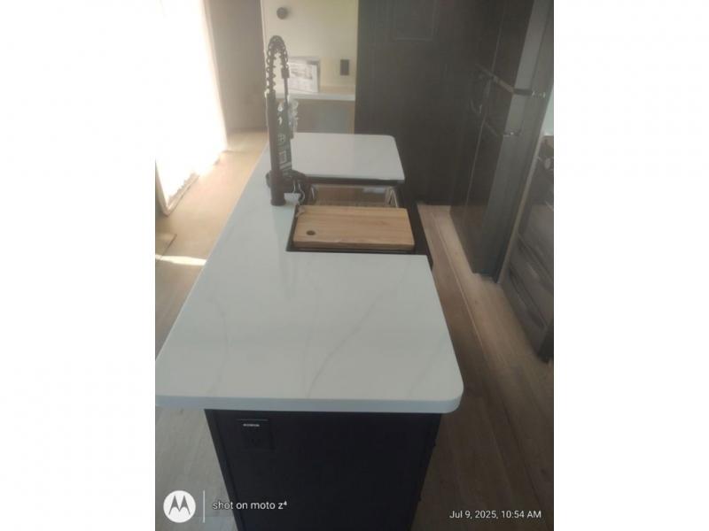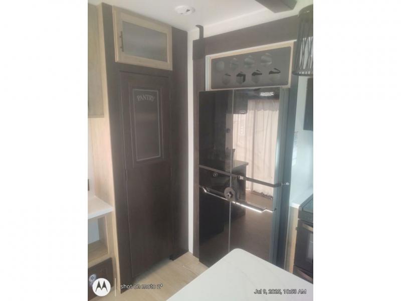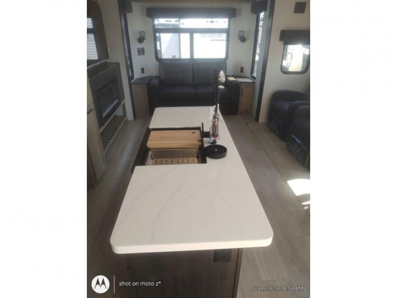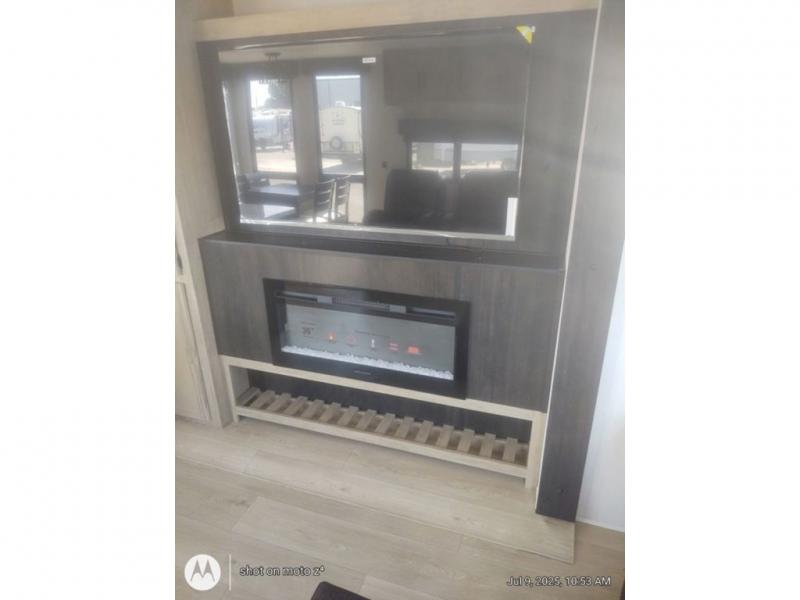 Spacious and comfortable describe this destination travel trailer featuring triple slides with dual opposing slides in the living area which creates a wide open space for a dinette with chairs, two lounge chairs, an entertainment center with a fireplace, and a hide-a-bed sofa along the very front wall. The roadside slide also houses the kitchen appliances which include a refrigerator, stove and microwave oven. There is a pantry and a hutch adjacent to the slide, and a kitchen island for more food prep space. A centrally located half bath is convenient just inside the main patio door entry. Towards the rear of the coach, a private bedroom featuring comfortable sleeping along with storage space for your clothing. In the very back, a master suite bath featuring a vanity with dual sinks, a shower with a seat, linen storage, and a wardrobe with washer and dryer prep.