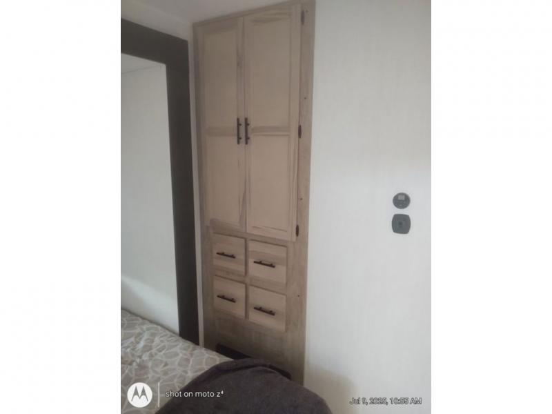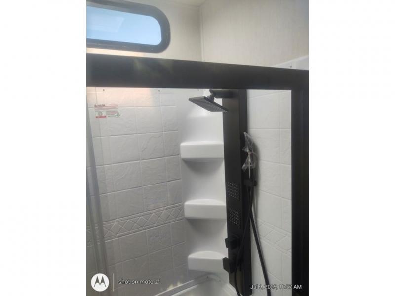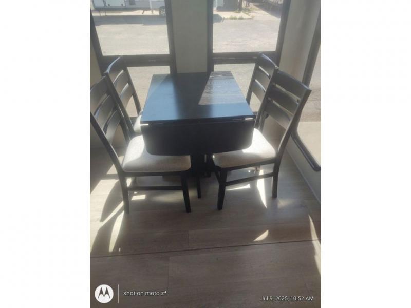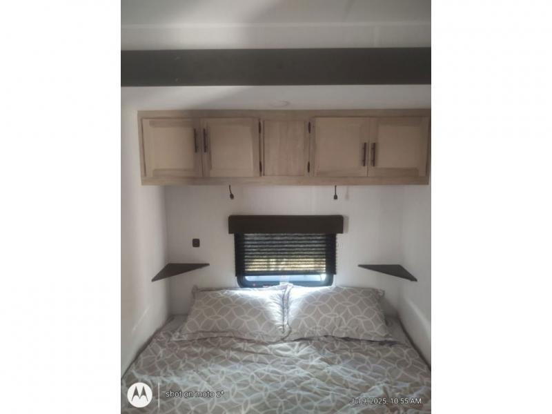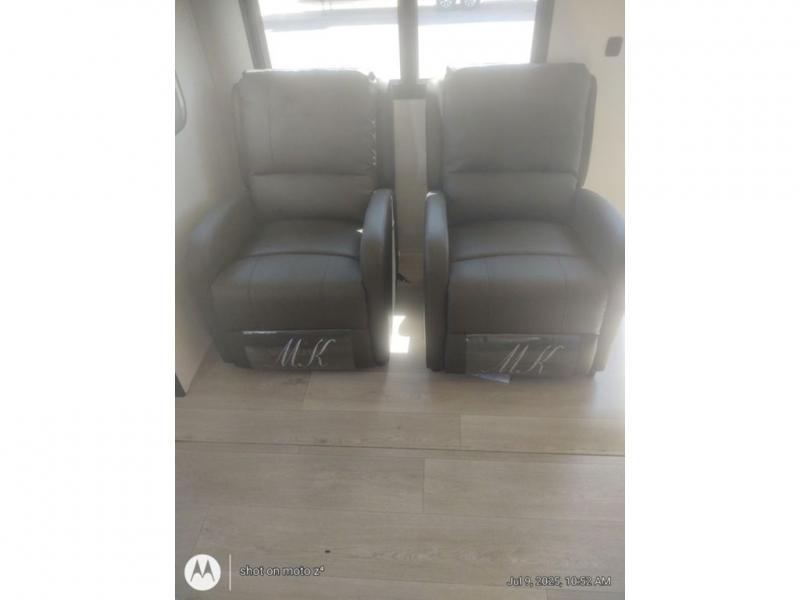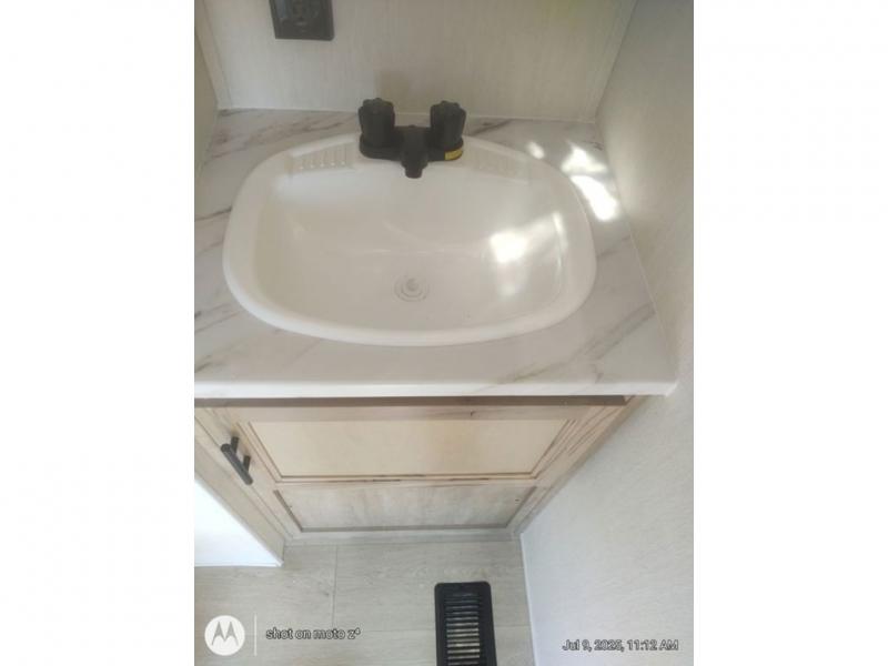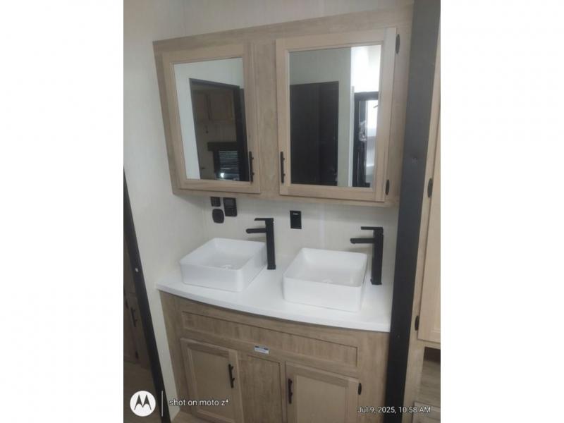Spacious and comfortable describe this destination travel trailer featuring triple slides with dual opposing slides in the living area which creates a wide open space for a dinette with chairs, two lounge chairs, an entertainment center with a fireplace, and a hide-a-bed sofa along the very front wall. The roadside slide also houses the kitchen appliances which include a refrigerator, stove and microwave oven. There is a pantry and a hutch adjacent to the slide, and a kitchen island for more food prep space. A centrally located half bath is convenient just inside the main patio door entry. Towards the rear of the coach, a private bedroom featuring comfortable sleeping along with storage space for your clothing. In the very back, a master suite bath featuring a vanity with dual sinks, a shower with a seat, linen storage, and a wardrobe with washer and dryer prep.