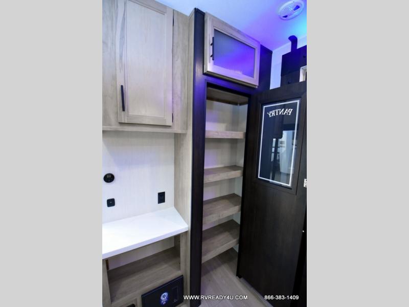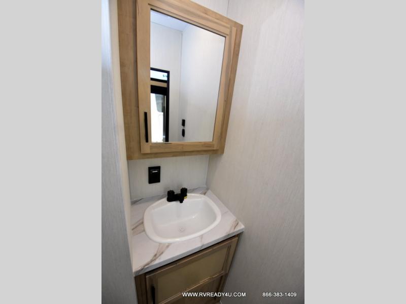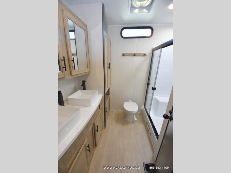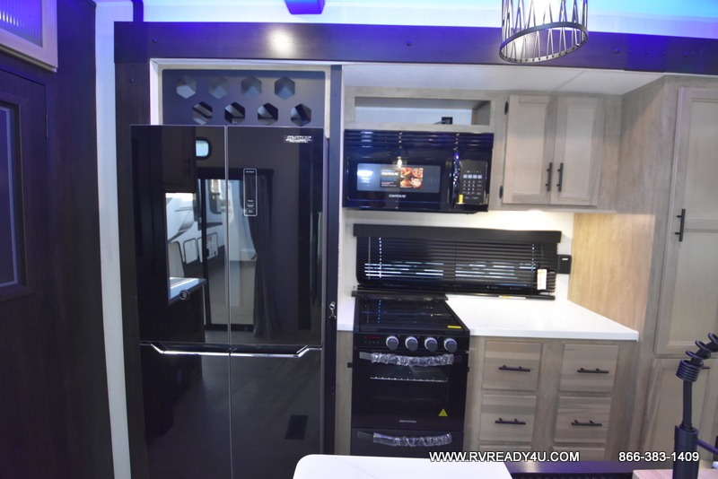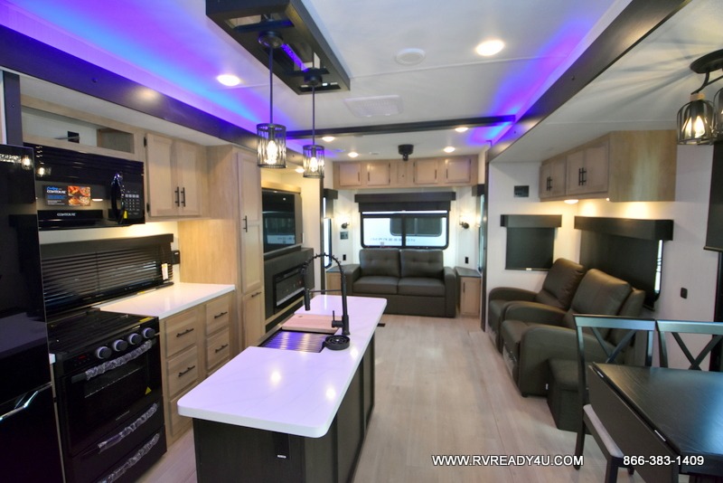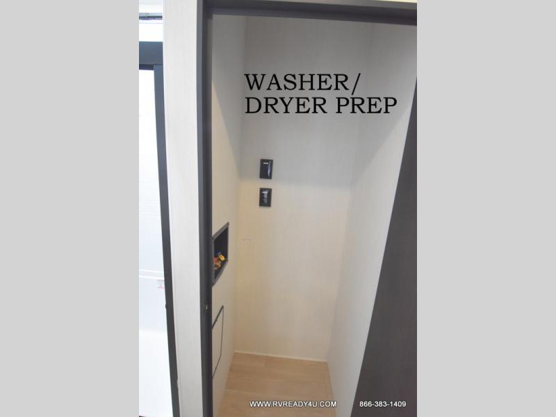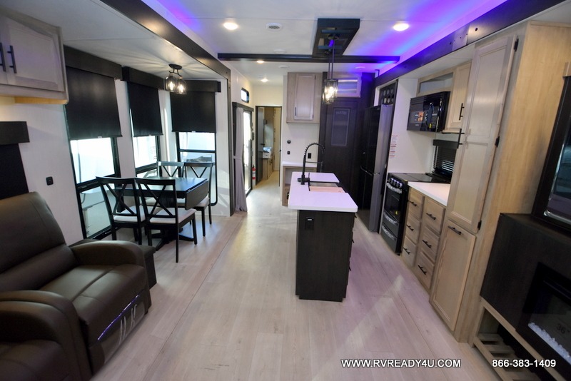 Spacious and comfortable describe this destination travel trailer featuring triple slides with dual opposing slides in the living area which creates a wide open space for a dinette with chairs, two lounge chairs, an entertainment center with a fireplace, and a hide-a-bed sofa along the very front wall. The roadside slide also houses the kitchen appliances which include a refrigerator, stove and microwave oven. There is a pantry and a hutch adjacent to the slide, and a kitchen island for more food prep space. A centrally located half bath is convenient just inside the main patio door entry. Towards the rear of the coach, a private bedroom featuring comfortable sleeping along with storage space for your clothing. In the very back, a master suite bath featuring a vanity with dual sinks, a shower with a seat, linen storage, and a wardrobe with washer and dryer prep.