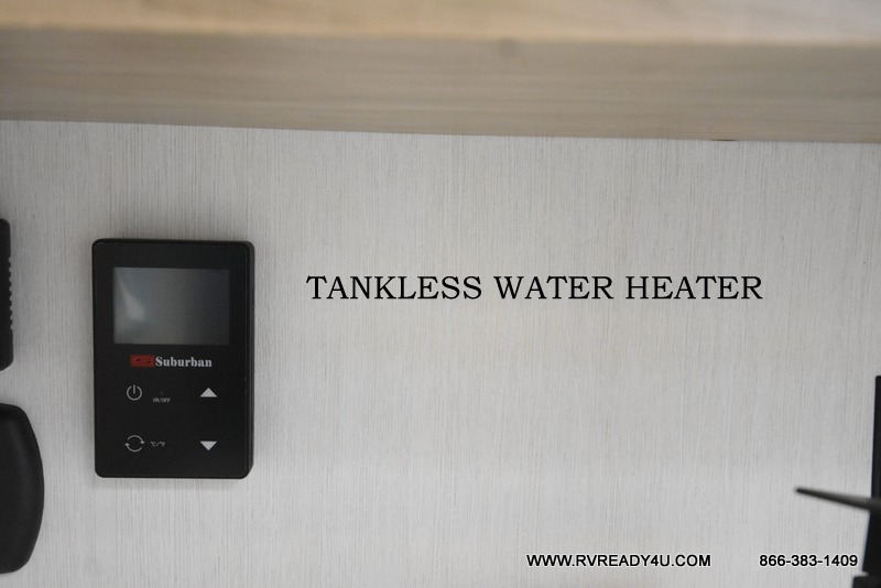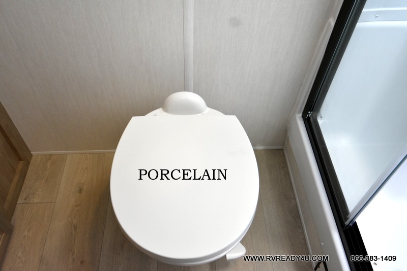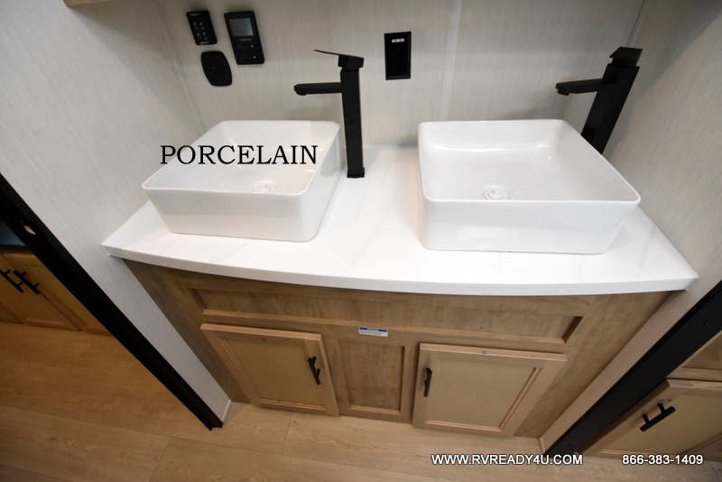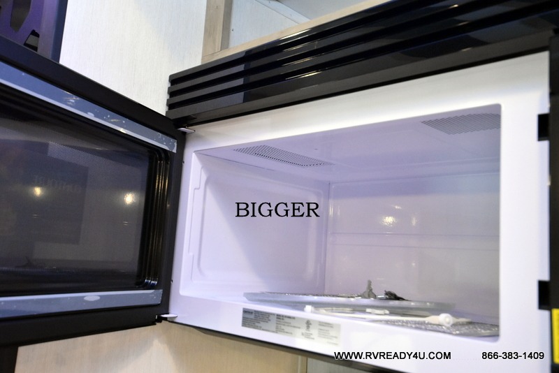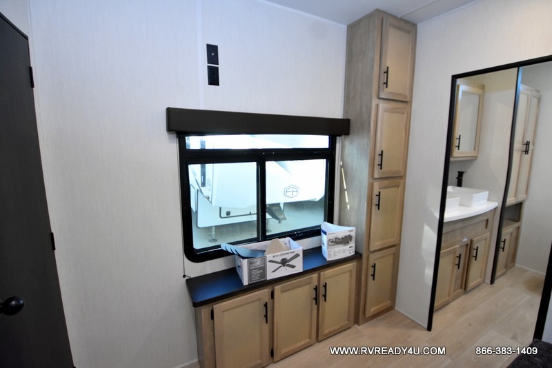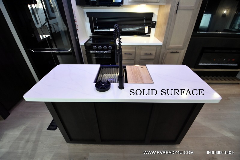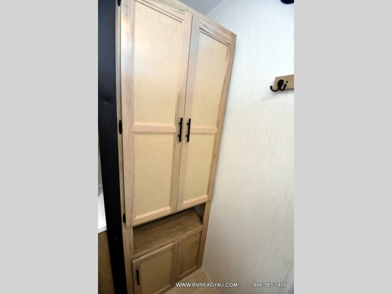Spacious and comfortable describe this destination travel trailer featuring triple slides with dual opposing slides in the living area which creates a wide open space for a dinette with chairs, two lounge chairs, an entertainment center with a fireplace, and a hide-a-bed sofa along the very front wall. The roadside slide also houses the kitchen appliances which include a refrigerator, stove and microwave oven. There is a pantry and a hutch adjacent to the slide, and a kitchen island for more food prep space. A centrally located half bath is convenient just inside the main patio door entry. Towards the rear of the coach, a private bedroom featuring comfortable sleeping along with storage space for your clothing. In the very back, a master suite bath featuring a vanity with dual sinks, a shower with a seat, linen storage, and a wardrobe with washer and dryer prep.