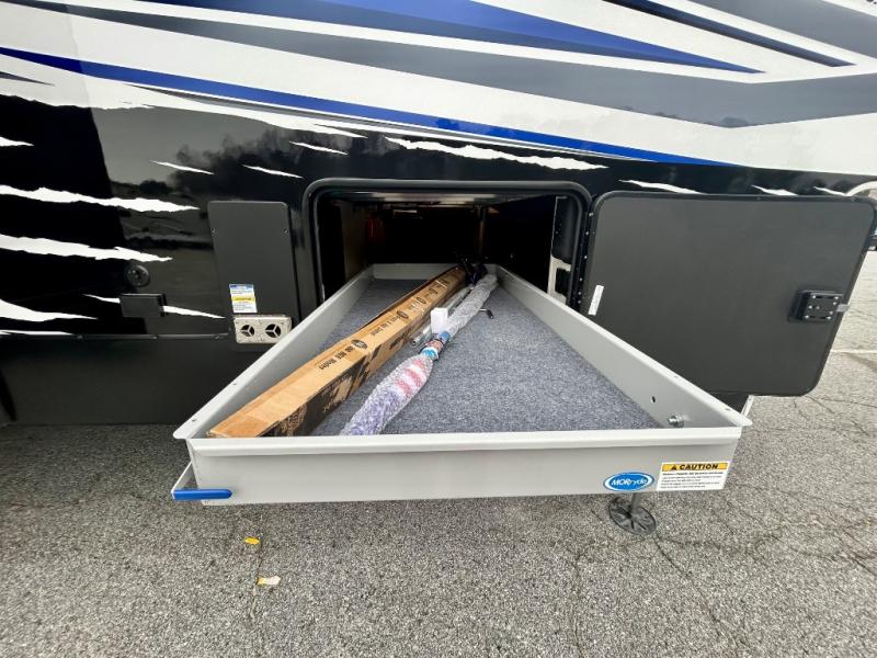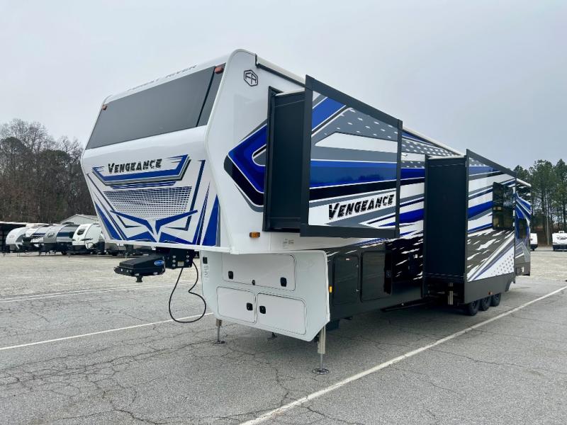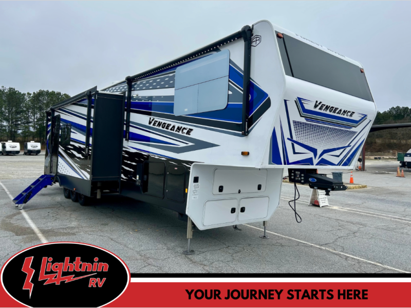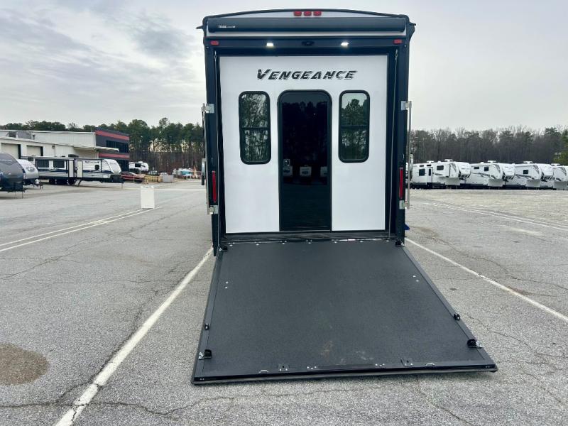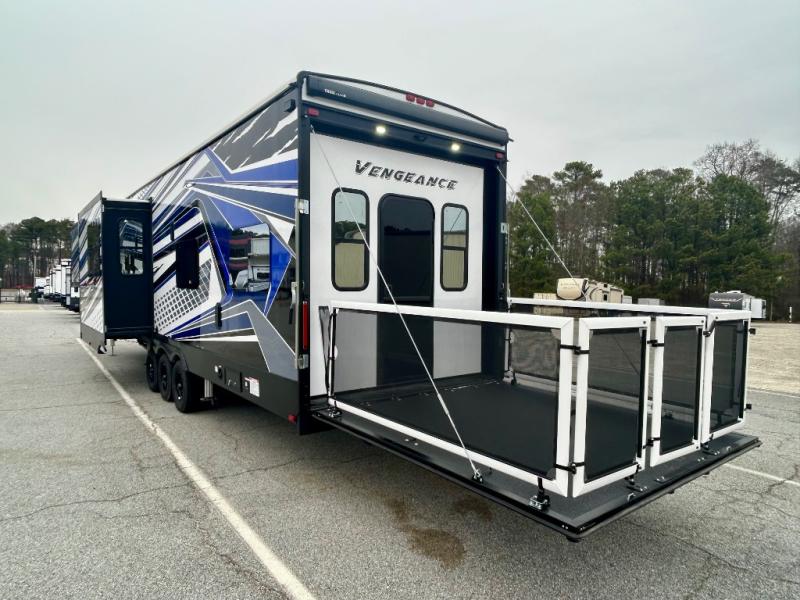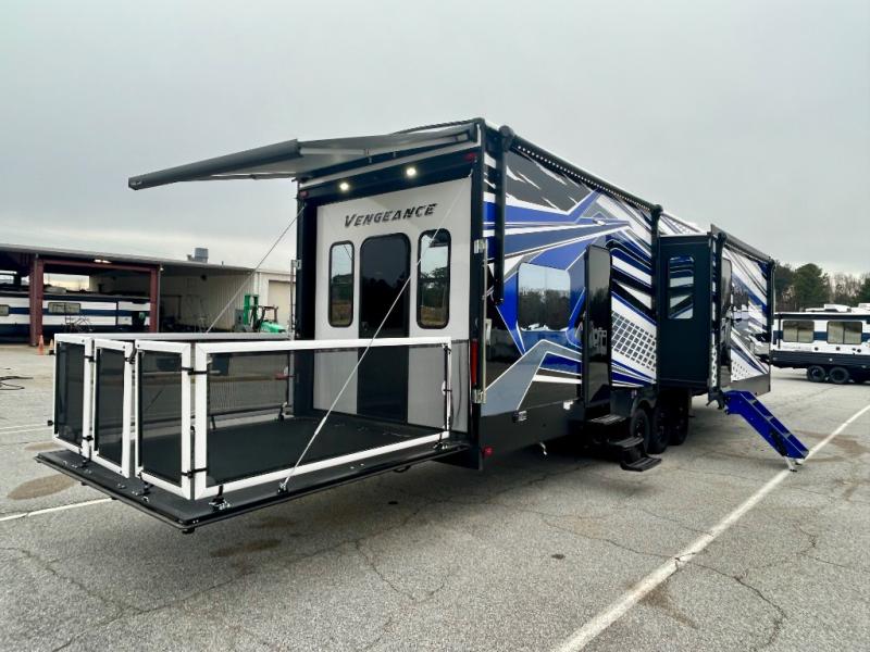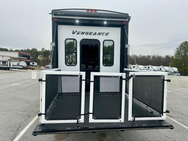With any Cherokee Vengeance toy hauler fifth wheel by Forest River, you will find functionality and refined comfort at every turn! Each model features an 8' 6" wide body construction, high-gloss gelcoat fiberglass, and NTXT composite substrate for added durability. The MORryde 3000 suspension will make towing easier than ever, and there are additional MORryde features such as a hitch, extended handrail at the garage and entry door, and a MORryde pull-out tray in the exterior compartment. The 5,000 lb. tie-downs will help keep your gear secure, and the 30-gallon fuel station will keep your toys ready to go. Each toy hauler also includes luxury solid surface countertops throughout, luxury upgraded furniture, dual roller day/night shades in the living room, a glass shower enclosure, and LED lighting throughout to name just a few luxury features!
