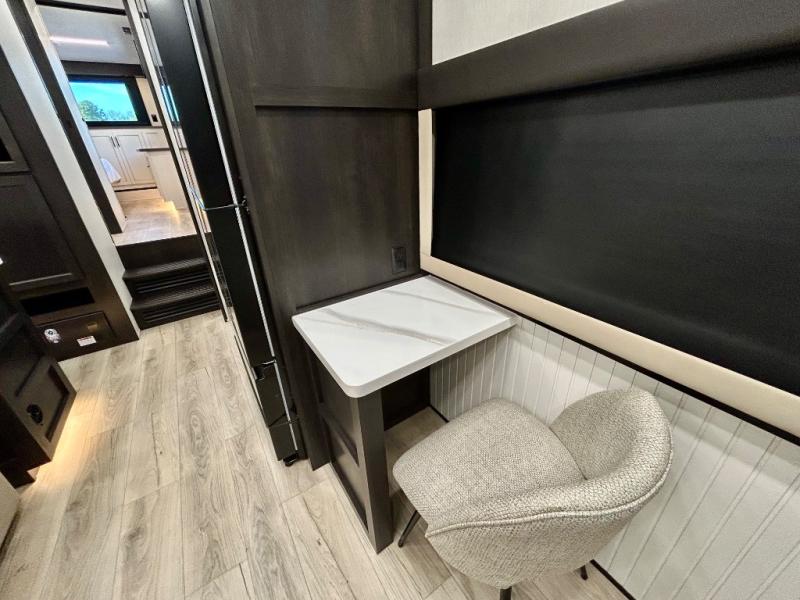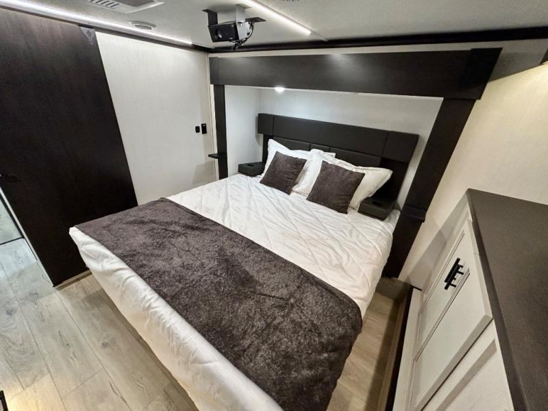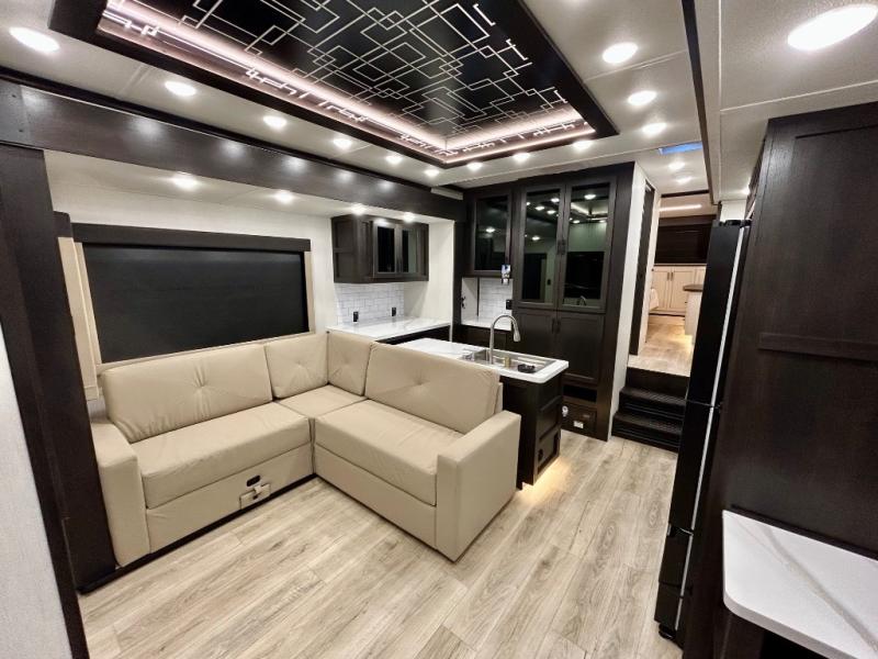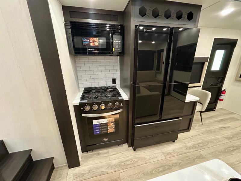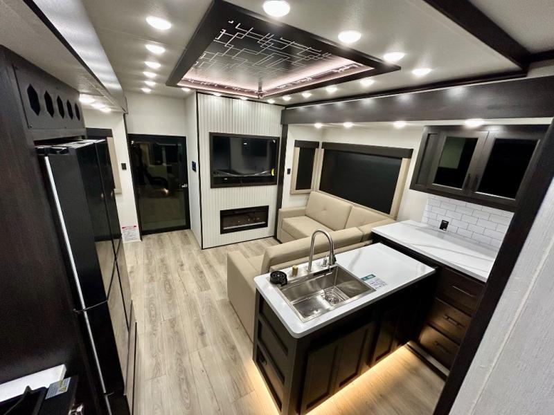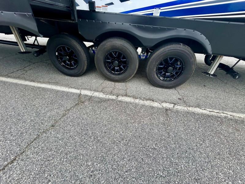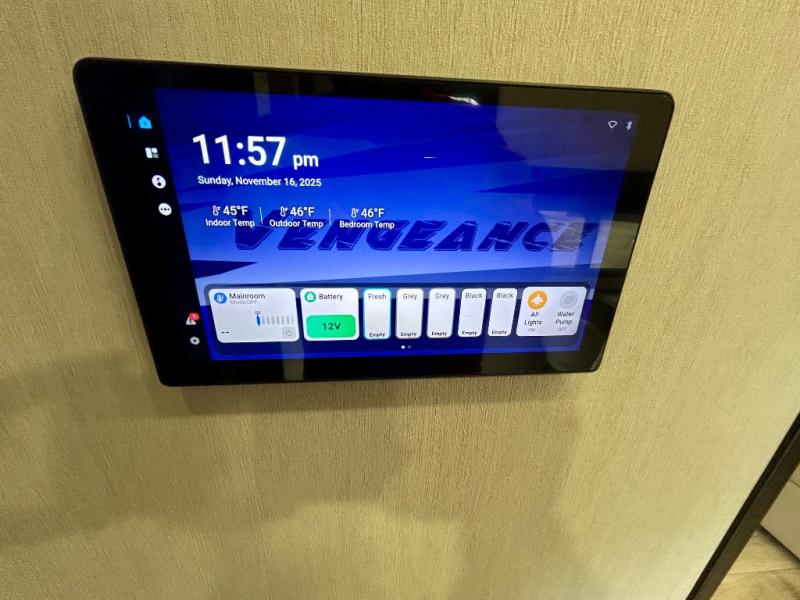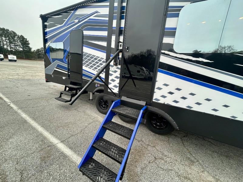 With any Cherokee Vengeance toy hauler fifth wheel by Forest River, you will find functionality and refined comfort at every turn! Each model features an 8' 6" wide body construction, high-gloss gelcoat fiberglass, and NTXT composite substrate for added durability. The MORryde 3000 suspension will make towing easier than ever, and there are additional MORryde features such as a hitch, extended handrail at the garage and entry door, and a MORryde pull-out tray in the exterior compartment. The 5,000 lb. tie-downs will help keep your gear secure, and the 30-gallon fuel station will keep your toys ready to go. Each toy hauler also includes luxury solid surface countertops throughout, luxury upgraded furniture, dual roller day/night shades in the living room, a glass shower enclosure, and LED lighting throughout to name just a few luxury features!