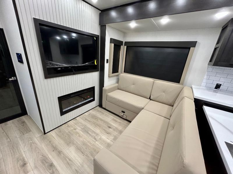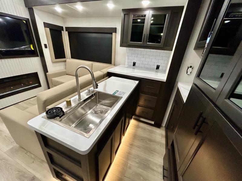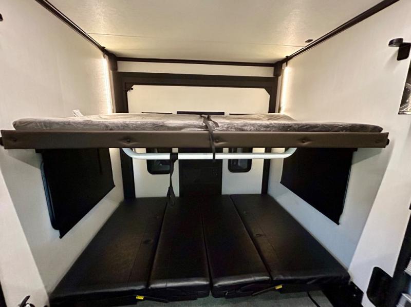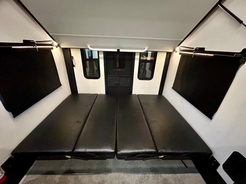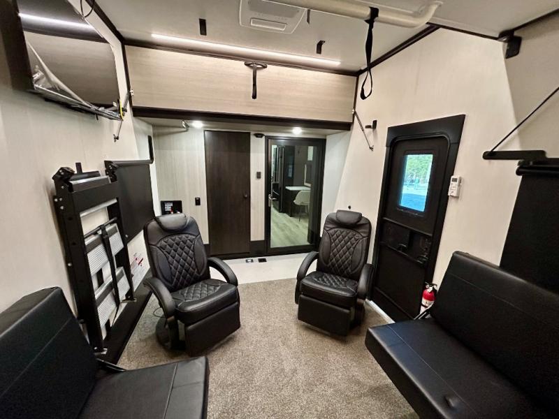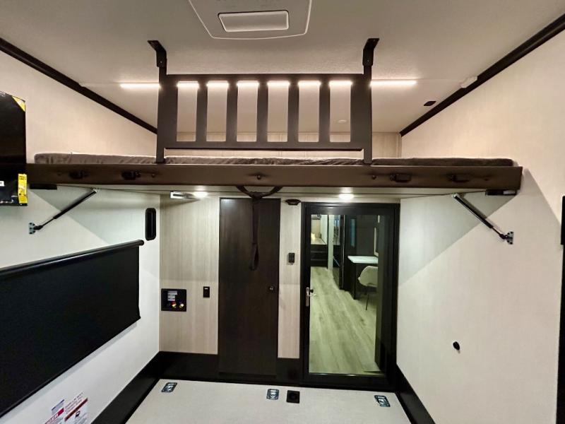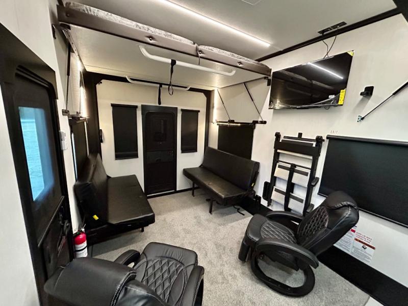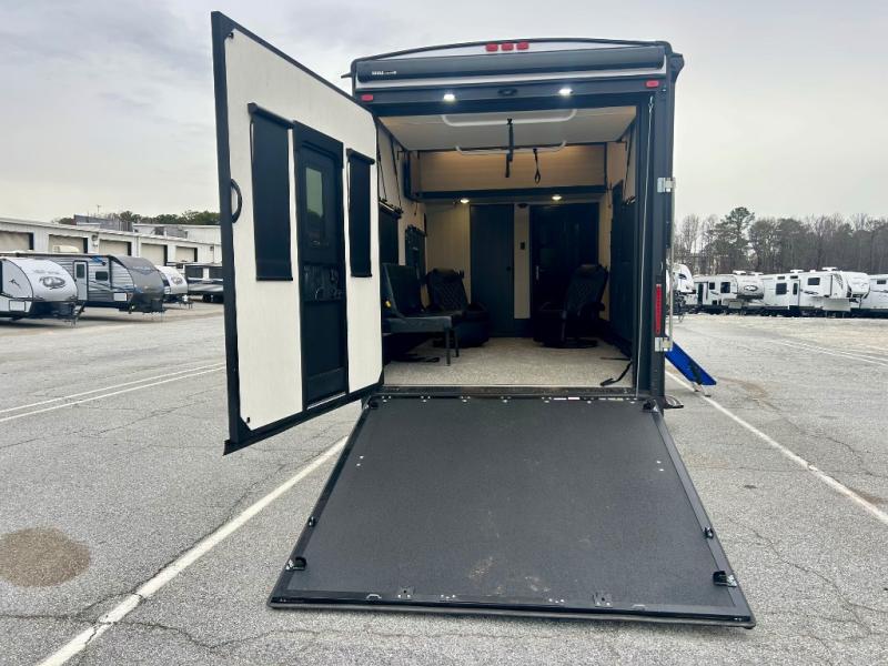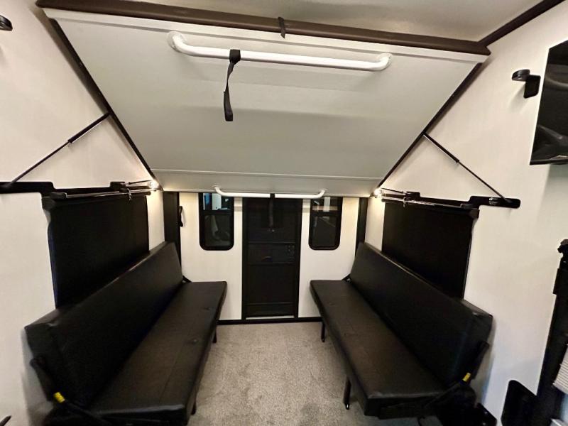 Make each adventure count in this spacious toy hauler for eight! Once you've unloaded the toys from the 13' separate garage, you can utilize the two flip-up sofas with a queen bed above. There is also a half bath here and a ladder leading to the loft! The main living area includes an L-shaped sofa across from the LED flatscreen TV and fireplace, allowing you to have movie nights, and the full kitchen includes ample counter space to set out snacks. A residential style four-burner range and residential size microwave will let you make meals for your crew every day, and there is a pantry plus 12V refrigerator for food storage. You're sure to appreciate the dual bath sinks in the full bath, and you'll feel right at home in the front private bedroom with a king bed slide, dresser, and front wardrobe.