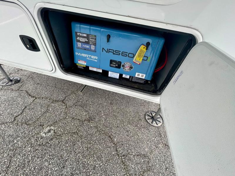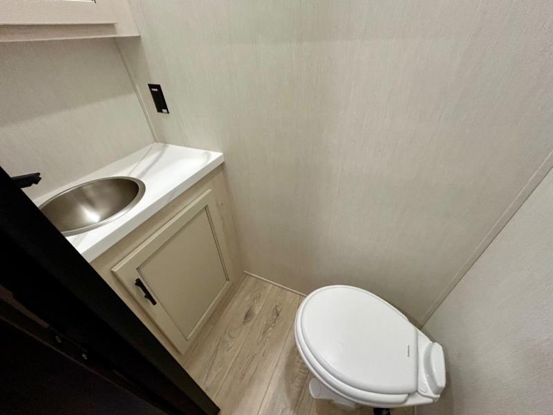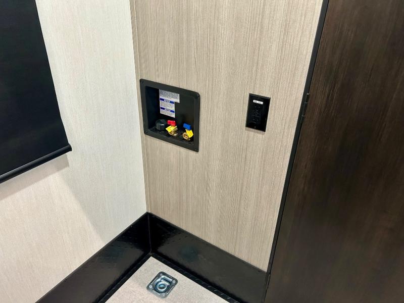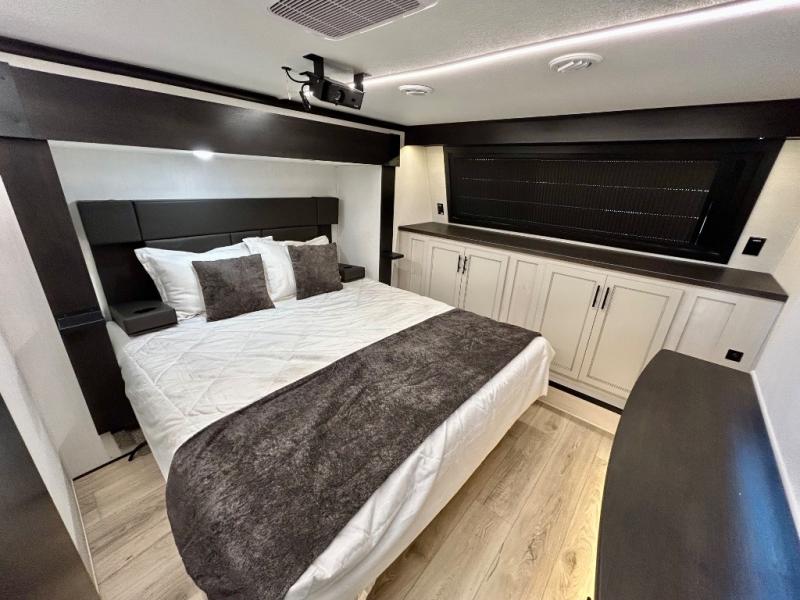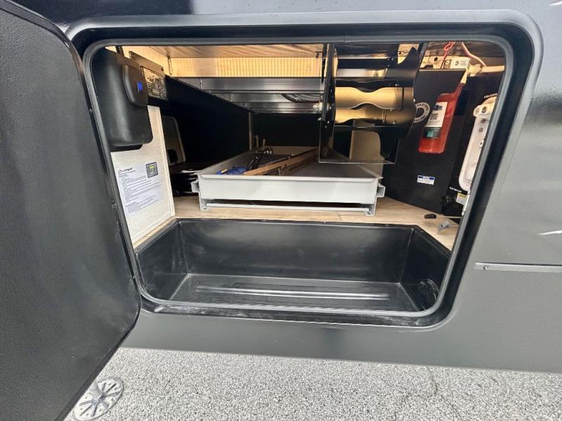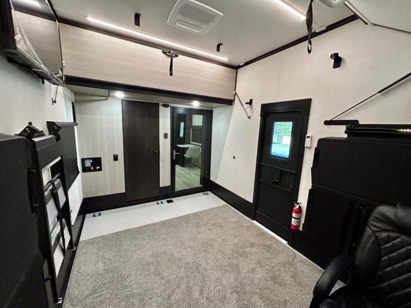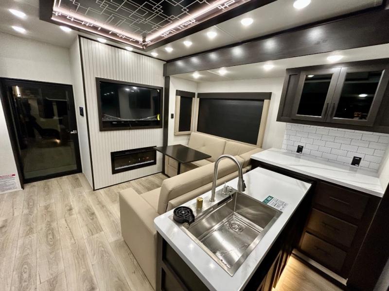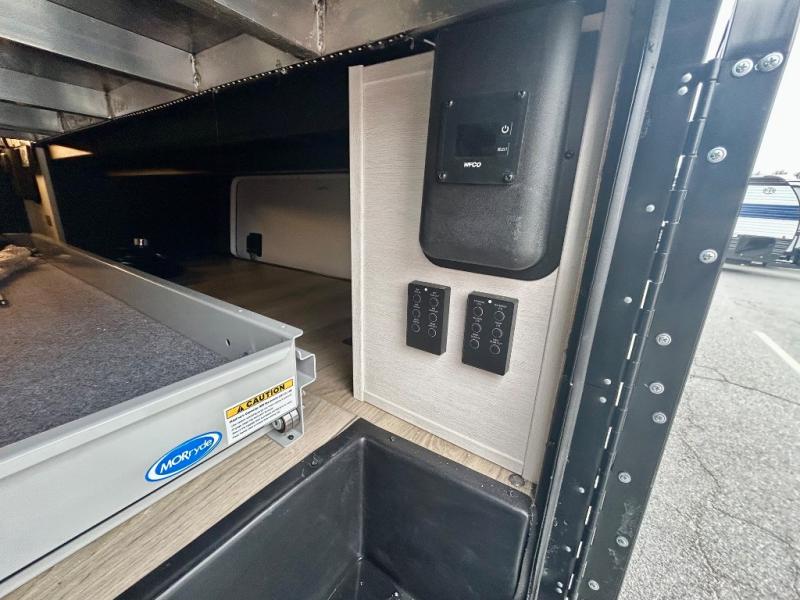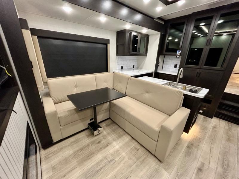 Make each adventure count in this spacious toy hauler for eight! Once you've unloaded the toys from the 13' separate garage, you can utilize the two flip-up sofas with a queen bed above. There is also a half bath here and a ladder leading to the loft! The main living area includes an L-shaped sofa across from the LED flatscreen TV and fireplace, allowing you to have movie nights, and the full kitchen includes ample counter space to set out snacks. A residential style four-burner range and residential size microwave will let you make meals for your crew every day, and there is a pantry plus 12V refrigerator for food storage. You're sure to appreciate the dual bath sinks in the full bath, and you'll feel right at home in the front private bedroom with a king bed slide, dresser, and front wardrobe.