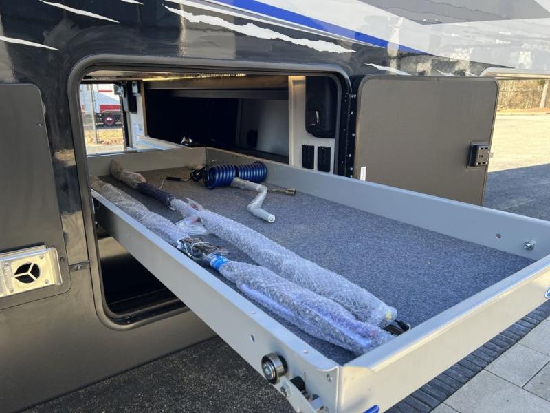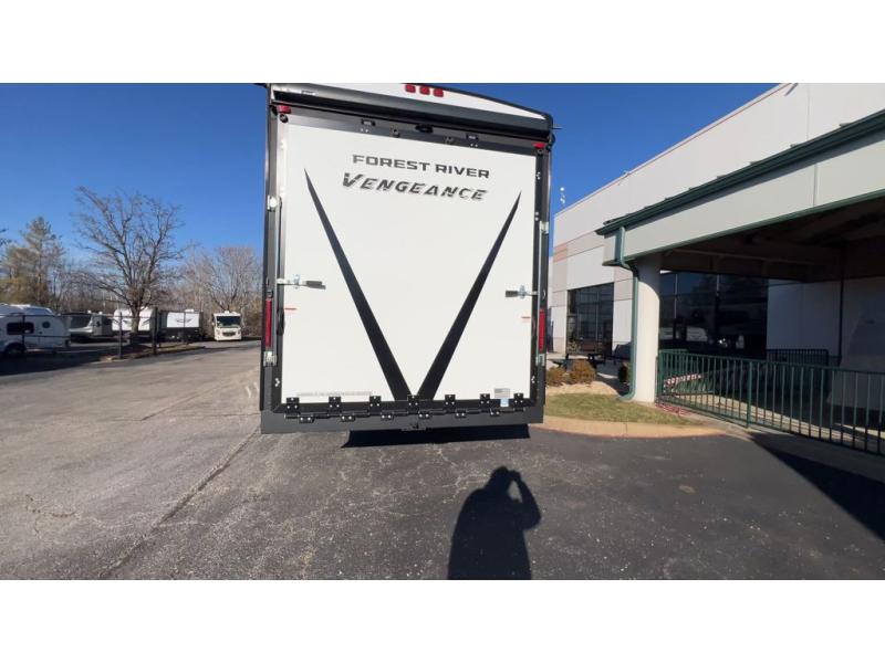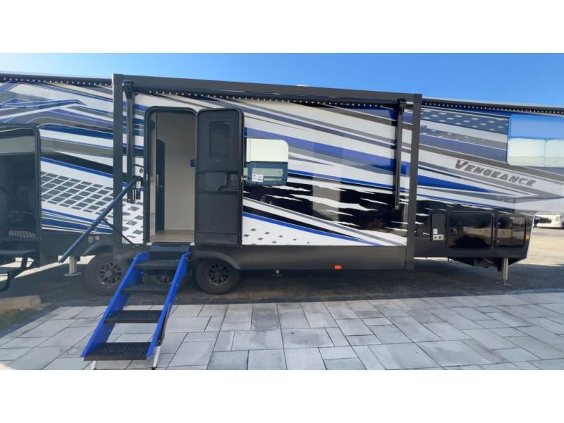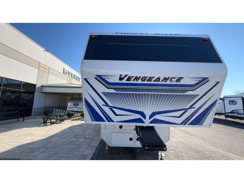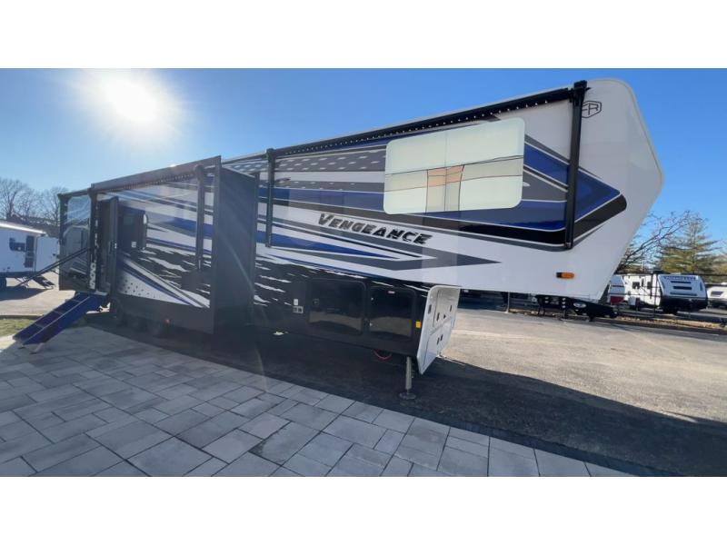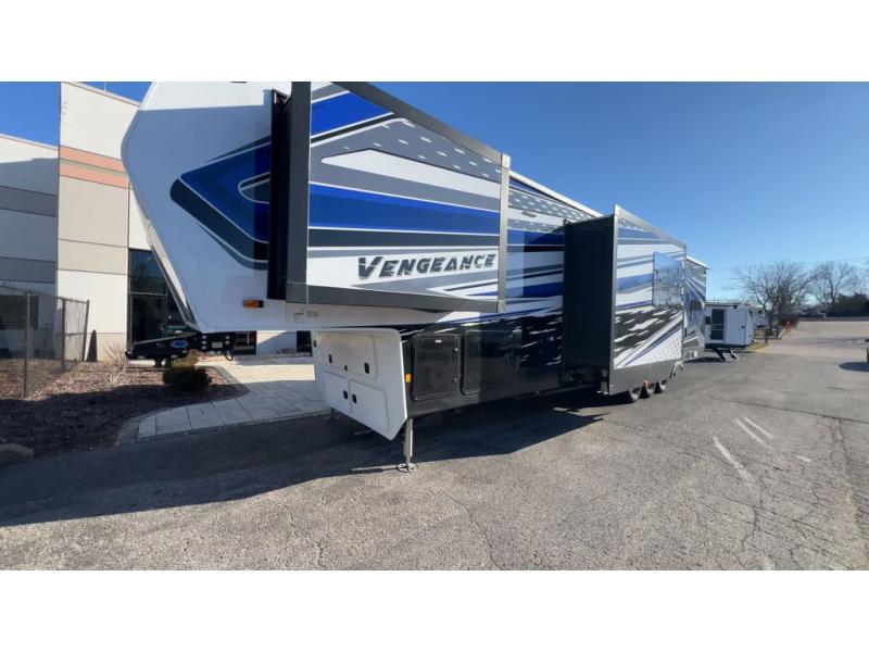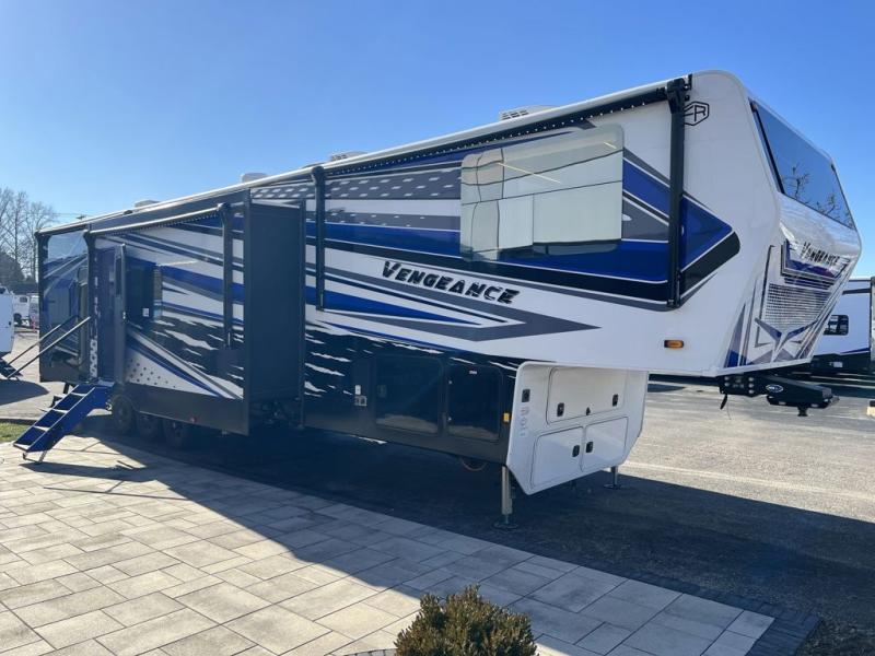 With any Cherokee Vengeance toy hauler fifth wheel by Forest River, you will find functionality and refined comfort at every turn! Each model features an 8' 6" wide body construction, high-gloss gelcoat fiberglass, and NTXT composite substrate for added durability. The MORryde 3000 suspension will make towing easier than ever, and there are additional MORryde features such as a hitch, extended handrail at the garage and entry door, and a MORryde pull-out tray in the exterior compartment. The 5,000 lb. tie-downs will help keep your gear secure, and the 30-gallon fuel station will keep your toys ready to go. Each toy hauler also includes luxury solid surface countertops throughout, luxury upgraded furniture, dual roller day/night shades in the living room, a glass shower enclosure, and LED lighting throughout to name just a few luxury features!