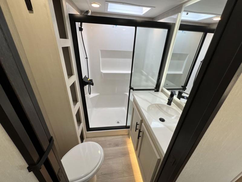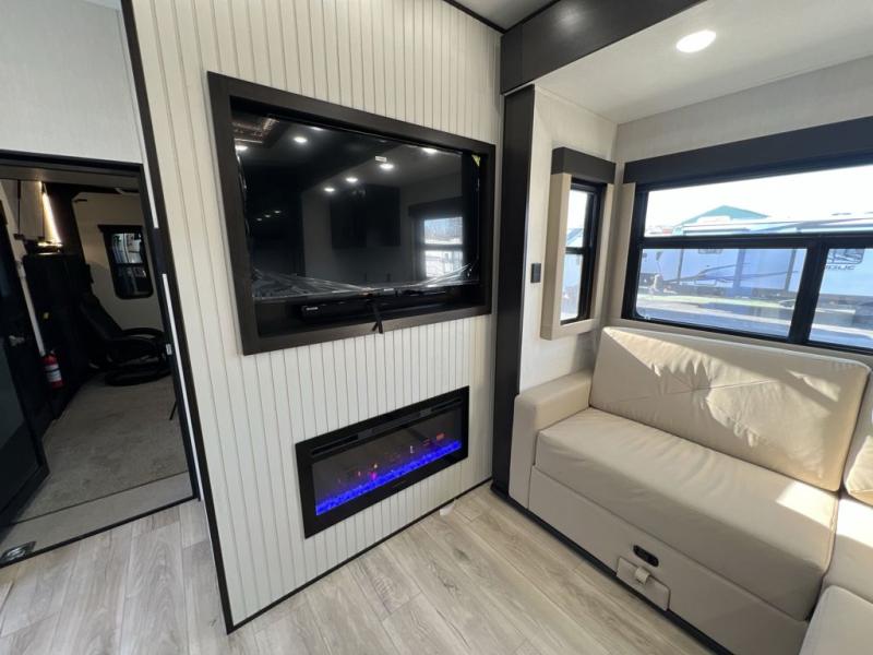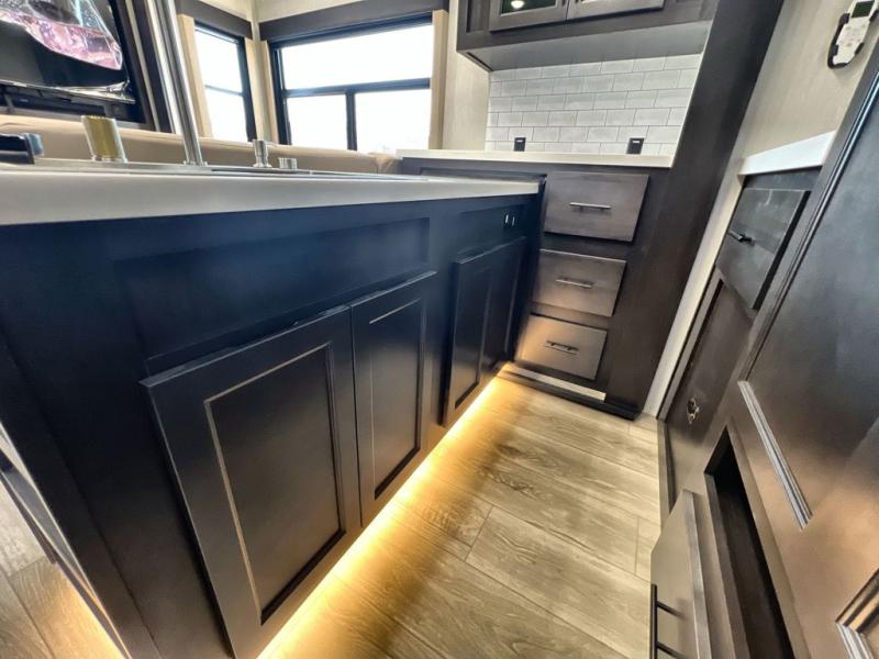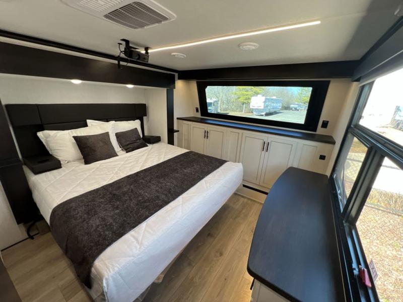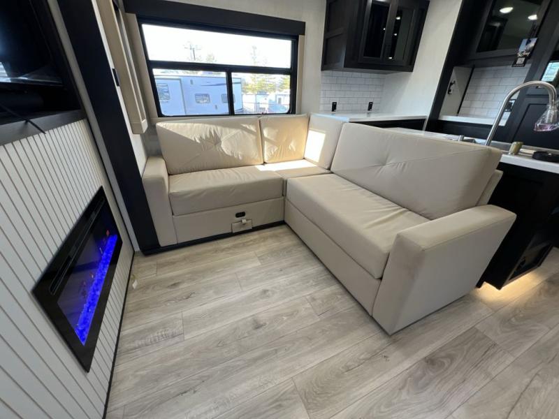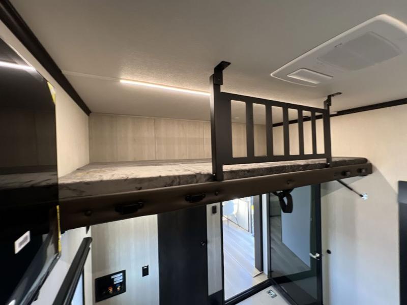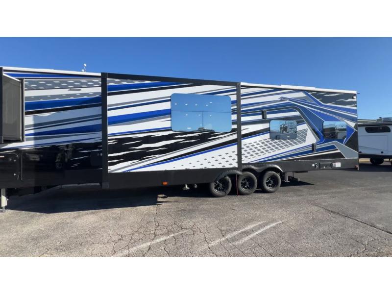 Make each adventure count in this spacious toy hauler for eight! Once you've unloaded the toys from the 13' separate garage, you can utilize the two flip-up sofas with a queen bed above. There is also a half bath here and a ladder leading to the loft! The main living area includes an L-shaped sofa across from the LED flatscreen TV and fireplace, allowing you to have movie nights, and the full kitchen includes ample counter space to set out snacks. A residential style four-burner range and residential size microwave will let you make meals for your crew every day, and there is a pantry plus 12V refrigerator for food storage. You're sure to appreciate the dual bath sinks in the full bath, and you'll feel right at home in the front private bedroom with a king bed slide, dresser, and front wardrobe.