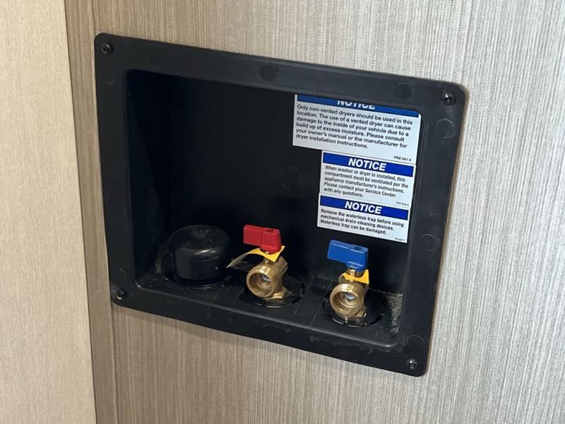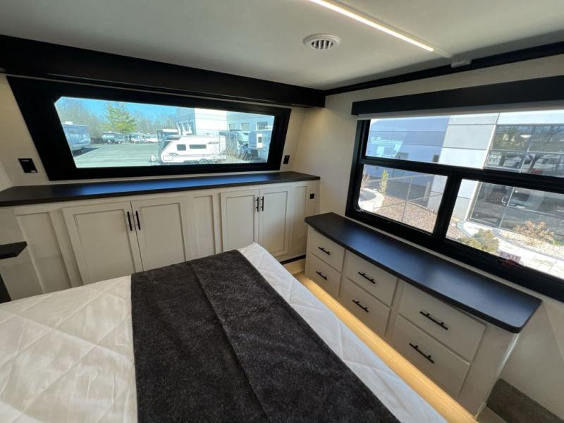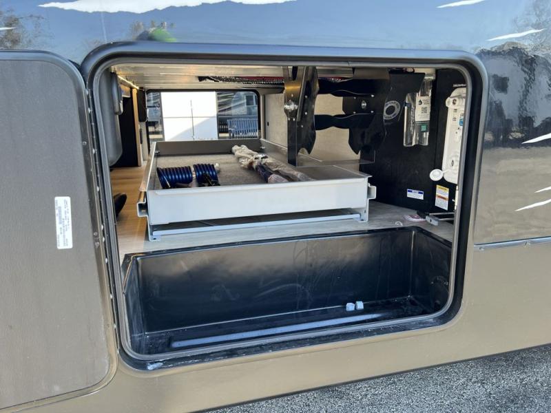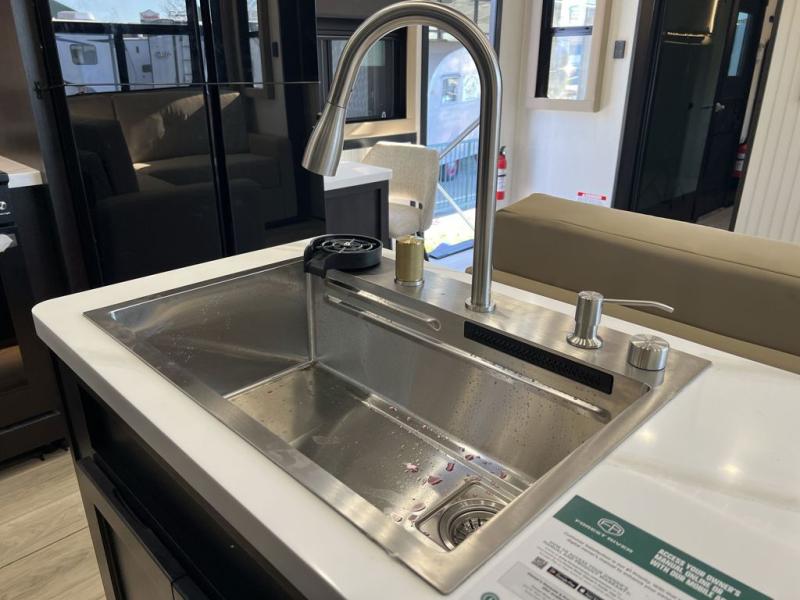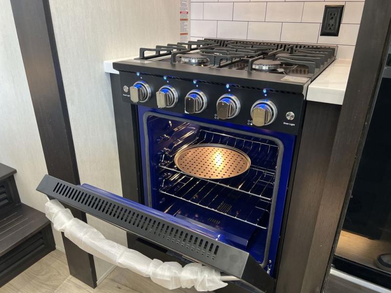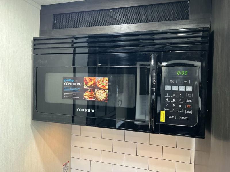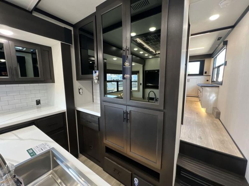Make each adventure count in this spacious toy hauler for eight! Once you've unloaded the toys from the 13' separate garage, you can utilize the two flip-up sofas with a queen bed above. There is also a half bath here and a ladder leading to the loft! The main living area includes an L-shaped sofa across from the LED flatscreen TV and fireplace, allowing you to have movie nights, and the full kitchen includes ample counter space to set out snacks. A residential style four-burner range and residential size microwave will let you make meals for your crew every day, and there is a pantry plus 12V refrigerator for food storage. You're sure to appreciate the dual bath sinks in the full bath, and you'll feel right at home in the front private bedroom with a king bed slide, dresser, and front wardrobe.