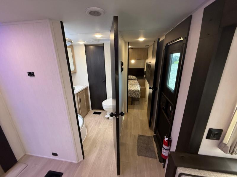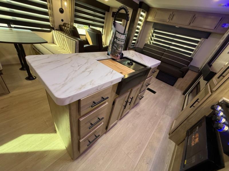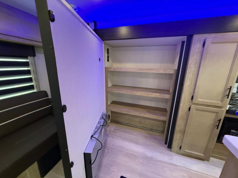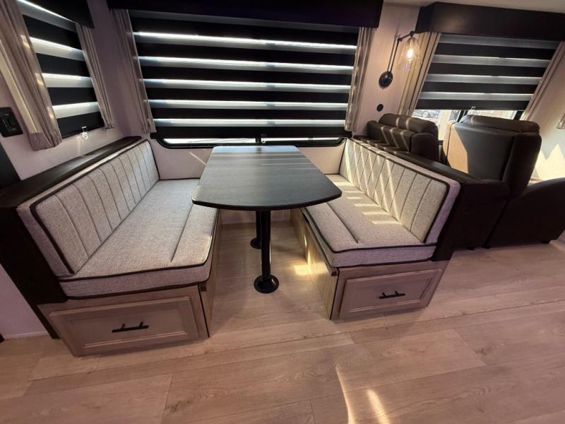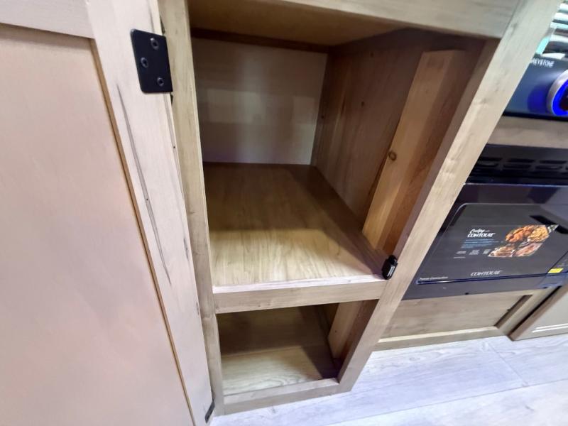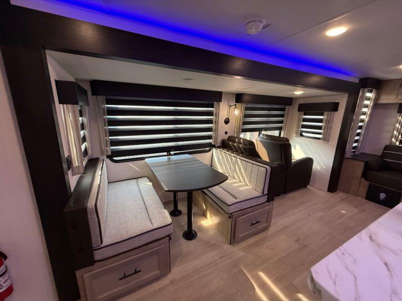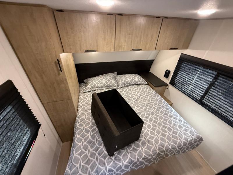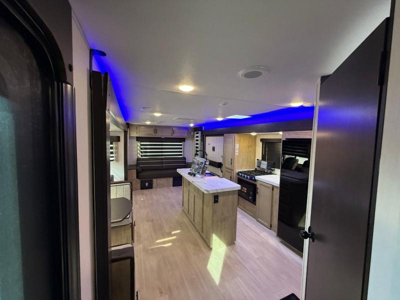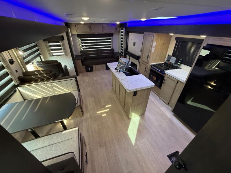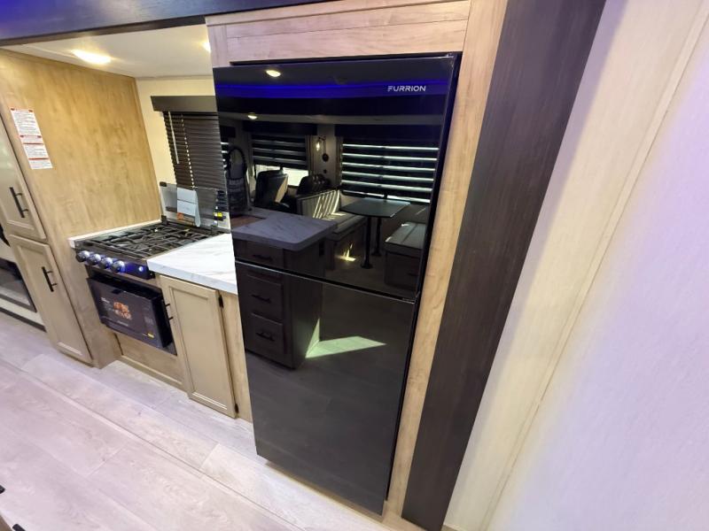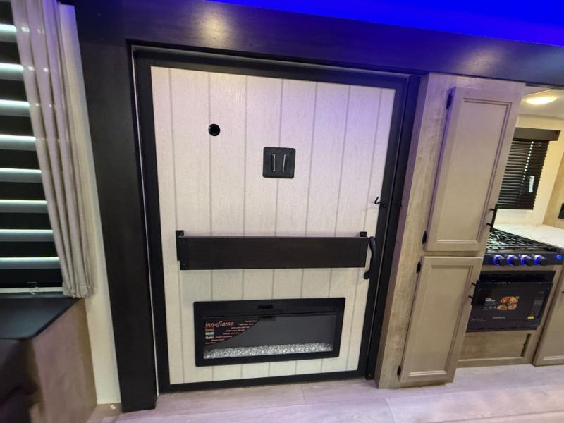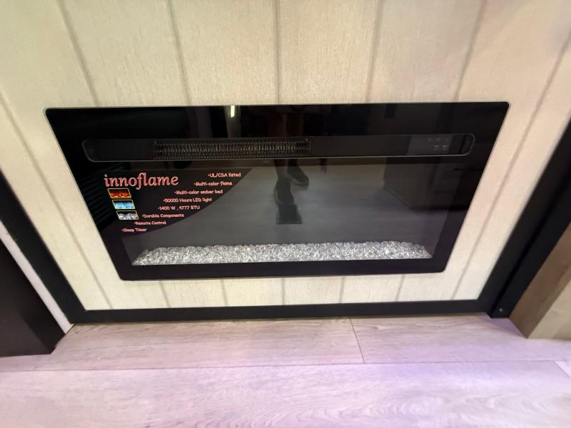 You'll love every minute spent in this double slide out travel trailer. You can relax on the rear sofa or dual lounge chairs, play a game at the booth dinette, and enjoy the glow of the fireplace. The chef of your group will appreciate the kitchen island, air fryer, plus refrigerator and pantry for food storage. A dual entry bath will create a front master bedroom, complete with an RV king bed and a bedside wardrobe to keep your space tidy.
