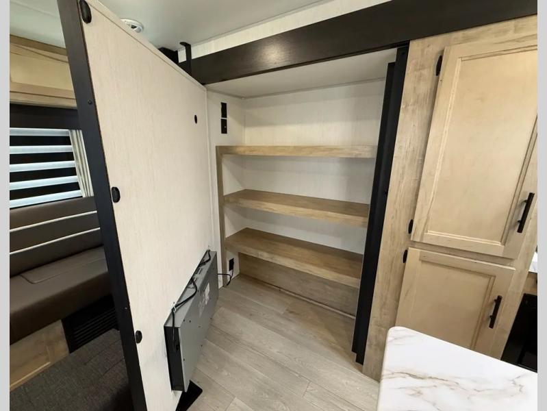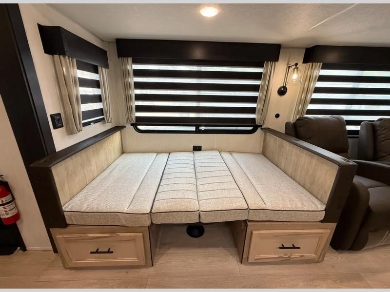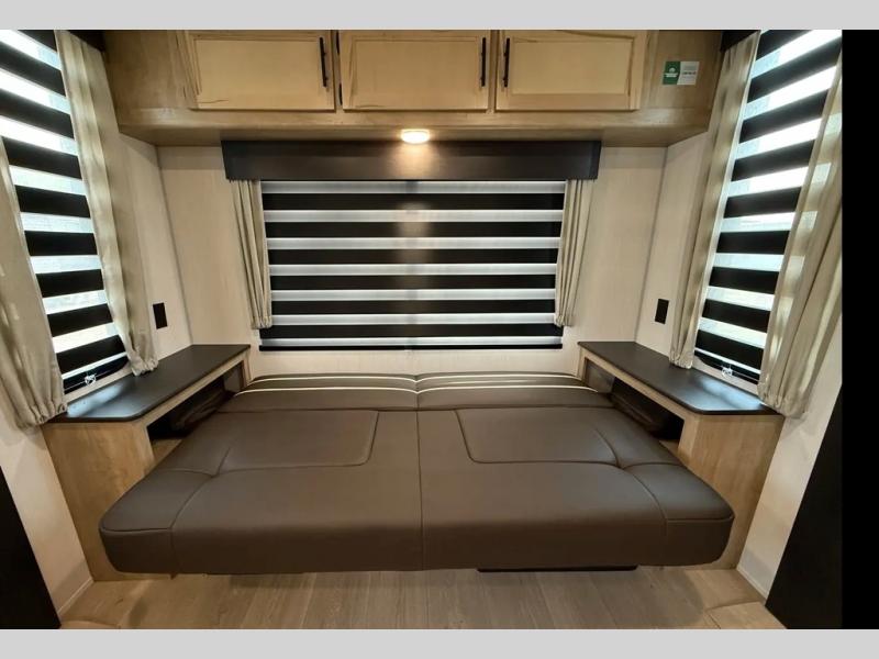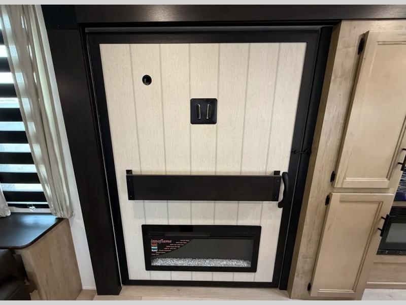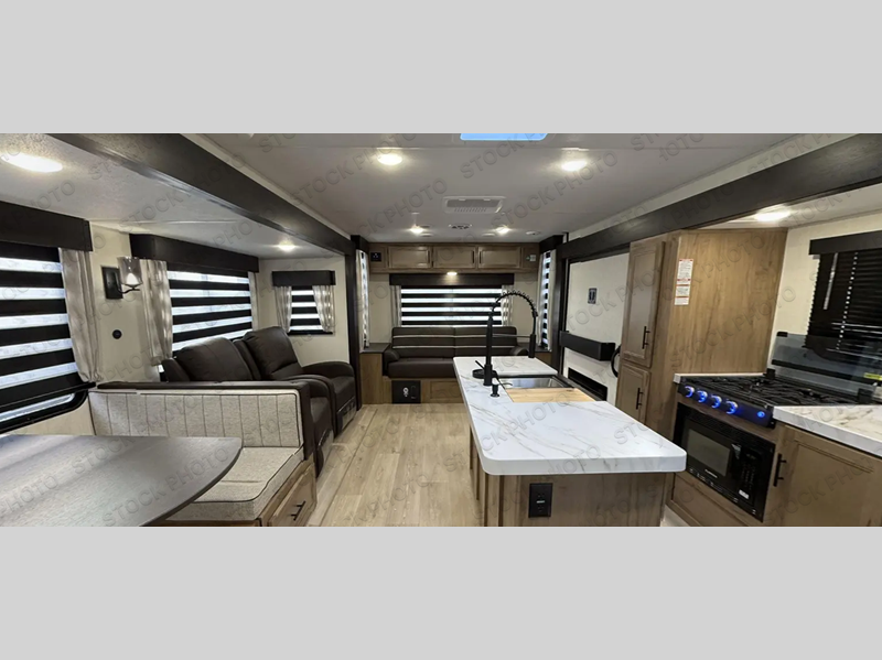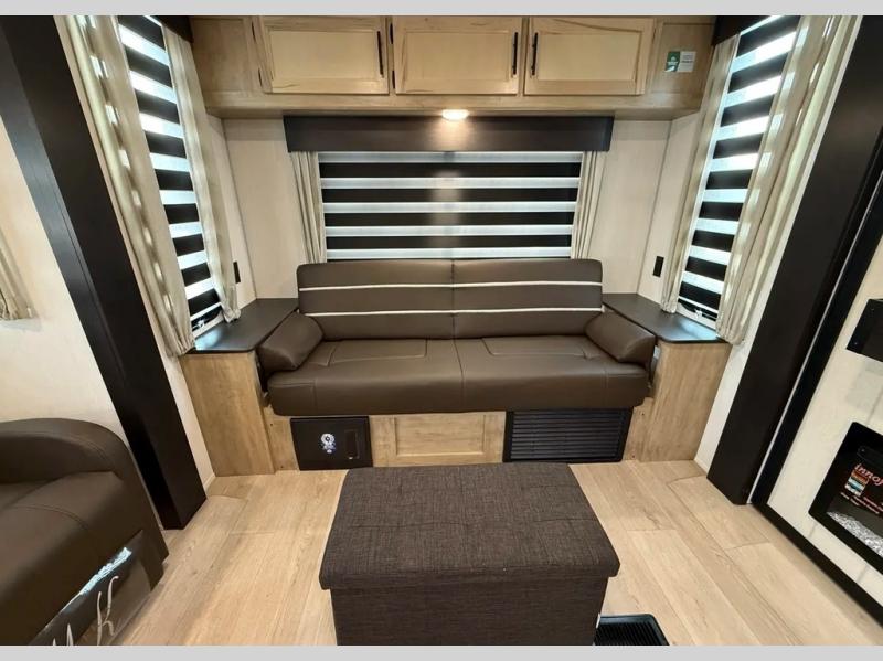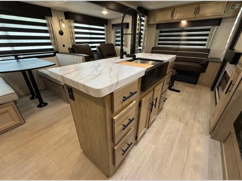 You'll love every minute spent in this double slide out travel trailer. You can relax on the rear sofa or dual lounge chairs, play a game at the booth dinette, and enjoy the glow of the fireplace. The chef of your group will appreciate the kitchen island, air fryer, plus 12V refrigerator and pantry for food storage. A dual entry bath will create a front master bedroom, complete with an RV king bed and dual wardrobes to keep your space tidy.