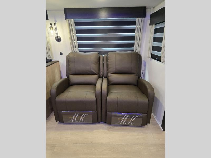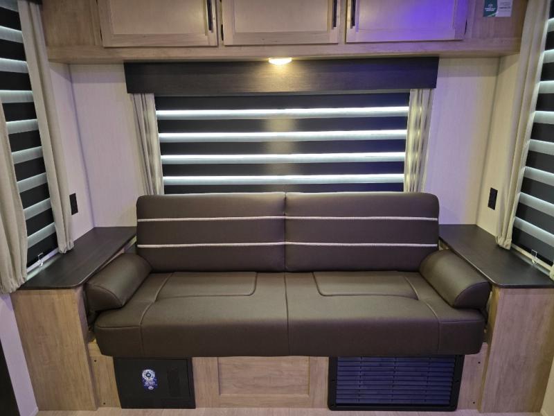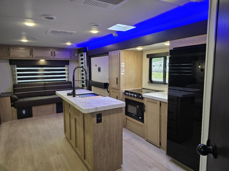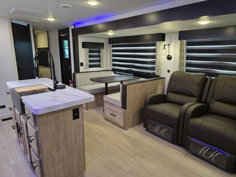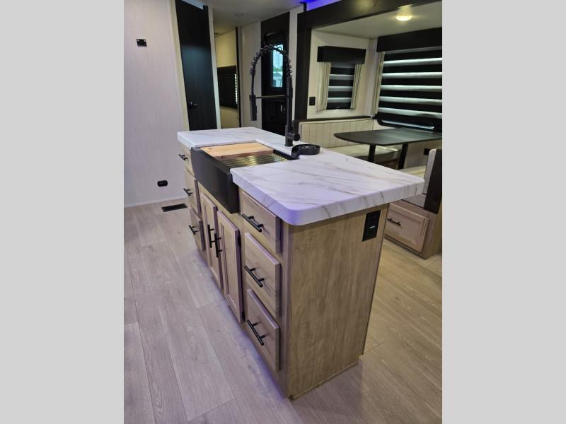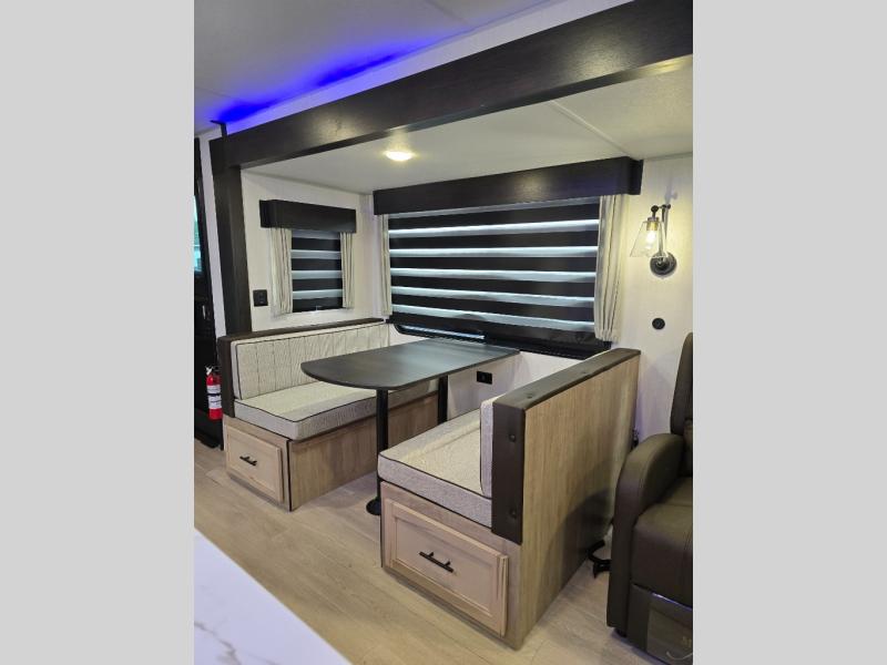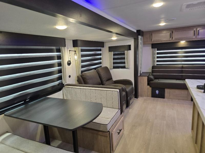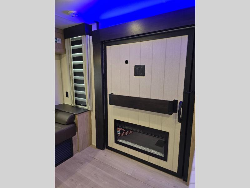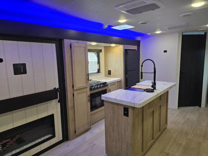 You'll love every minute spent in this double slide out travel trailer. You can relax on the rear sofa or dual lounge chairs, play a game at the booth dinette, and enjoy the glow of the fireplace. The chef of your group will appreciate the kitchen island, air fryer, plus 12V refrigerator and pantry for food storage. A dual entry bath will create a front master bedroom, complete with an RV king bed and dual wardrobes to keep your space tidy.