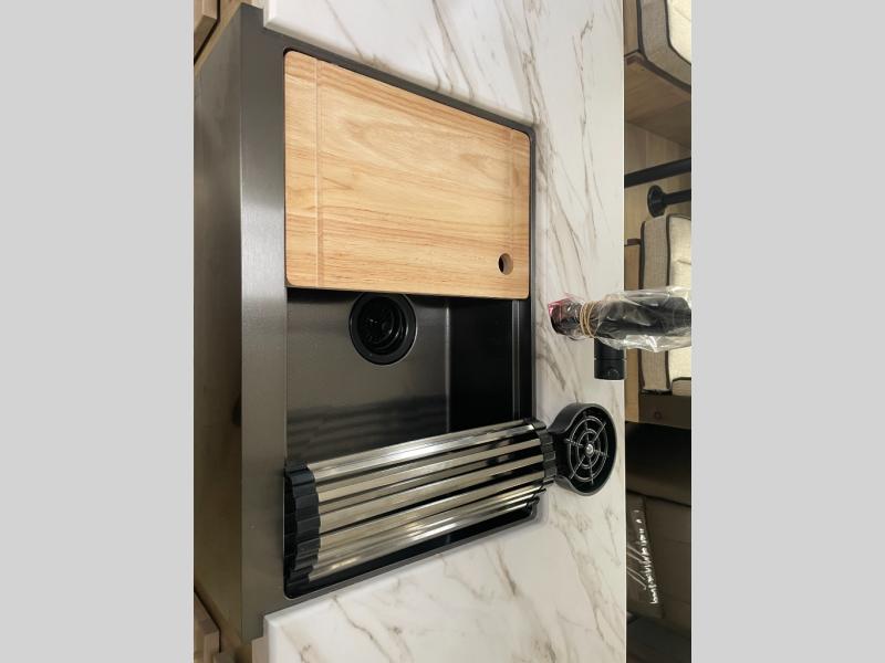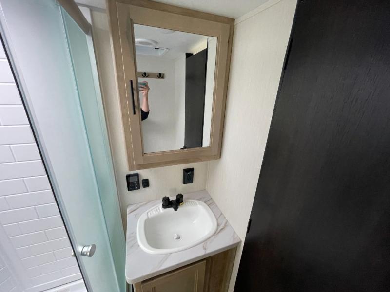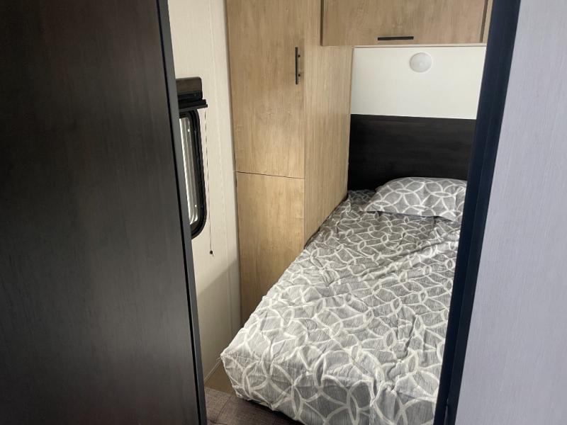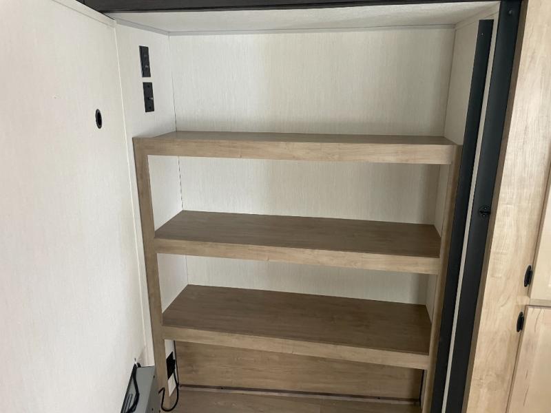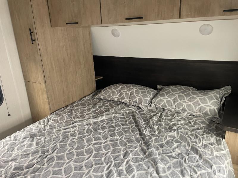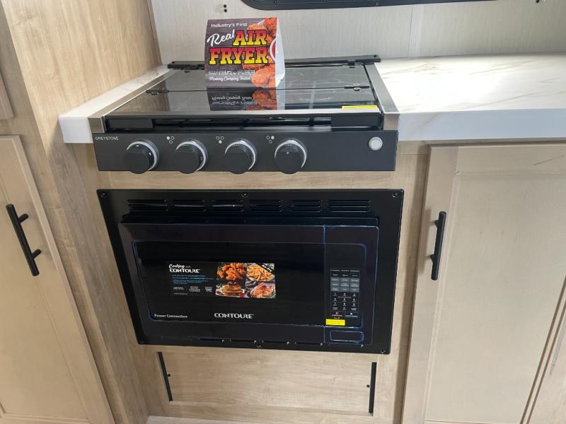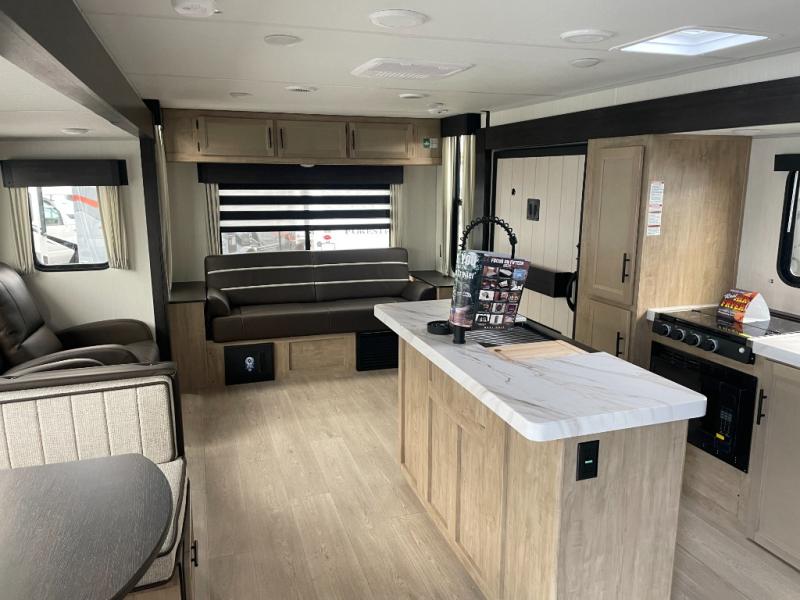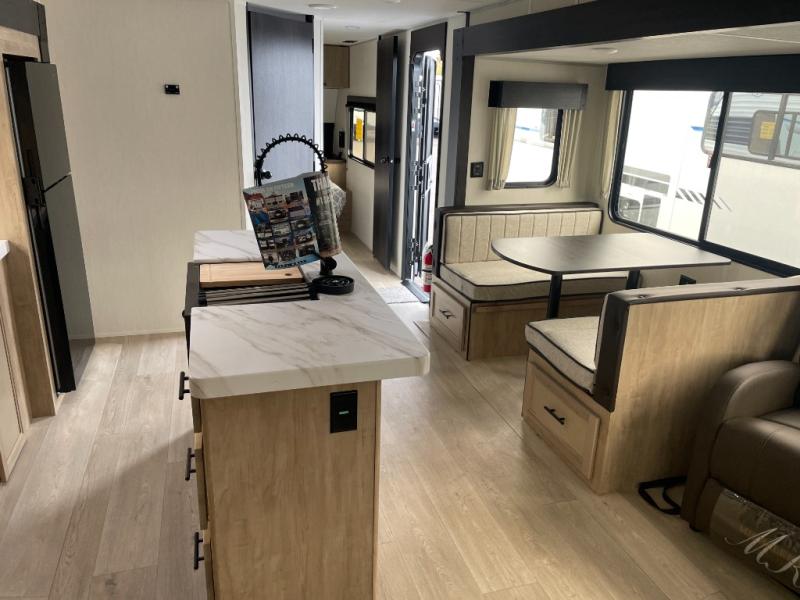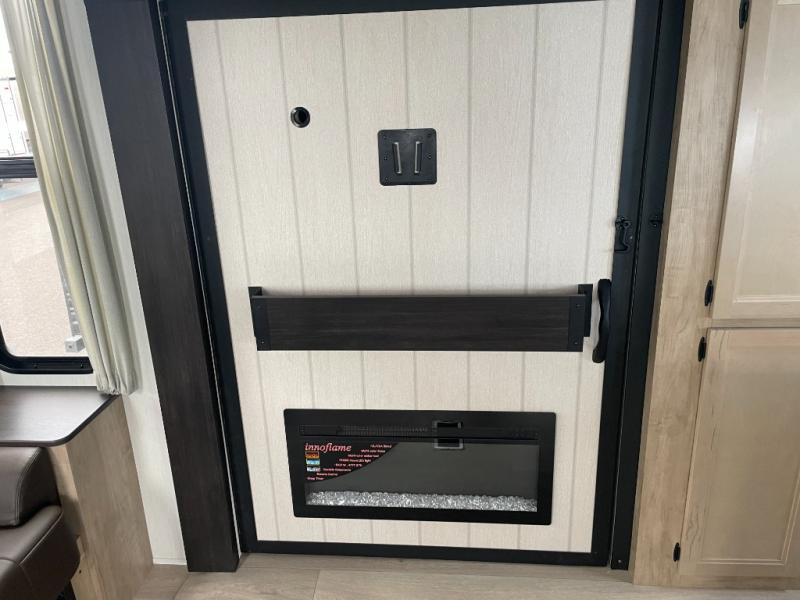 You'll love every minute spent in this double slide out travel trailer. You can relax on the rear sofa or dual lounge chairs, play a game at the booth dinette, and enjoy the glow of the fireplace. The chef of your group will appreciate the kitchen island, air fryer, plus refrigerator and pantry for food storage. A dual entry bath will create a front master bedroom, complete with an RV king bed and a bedside wardrobe to keep your space tidy.
