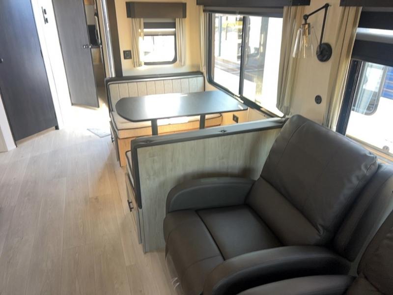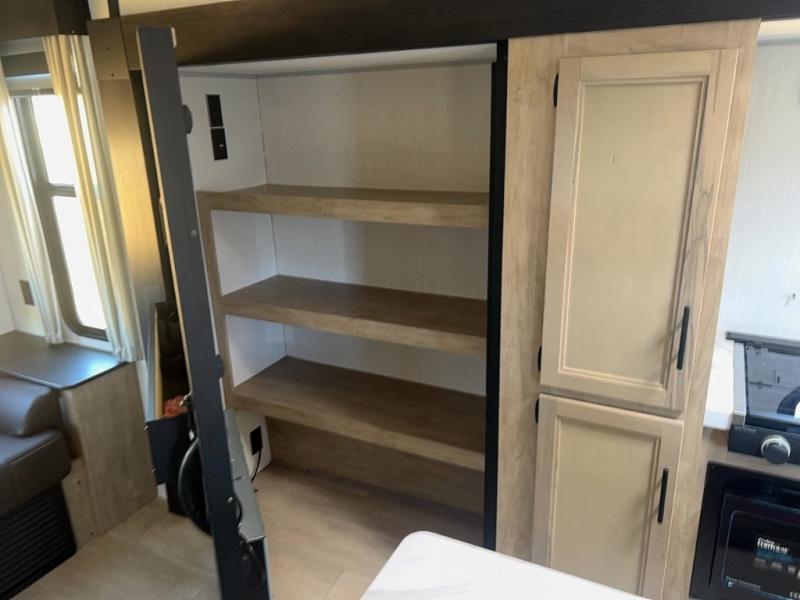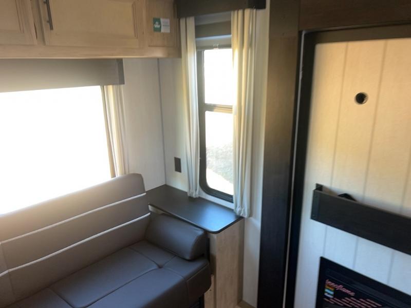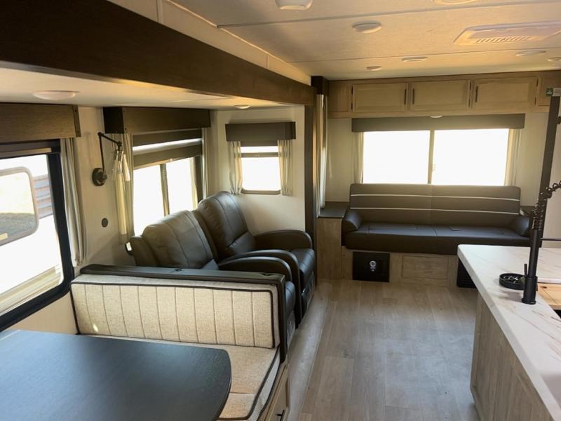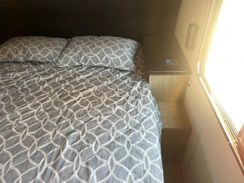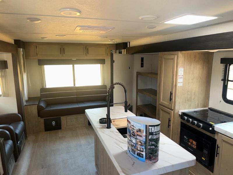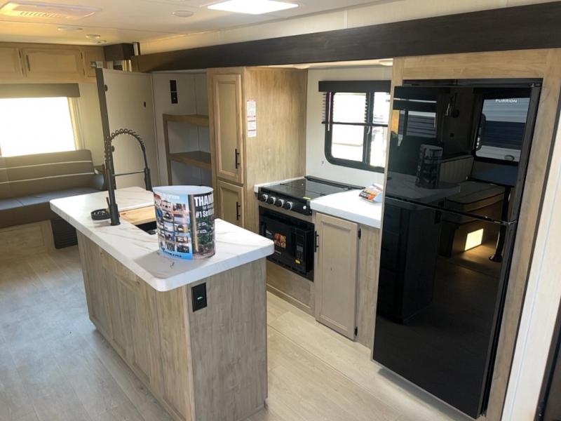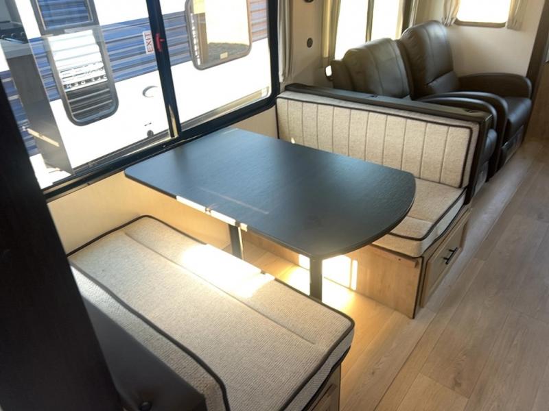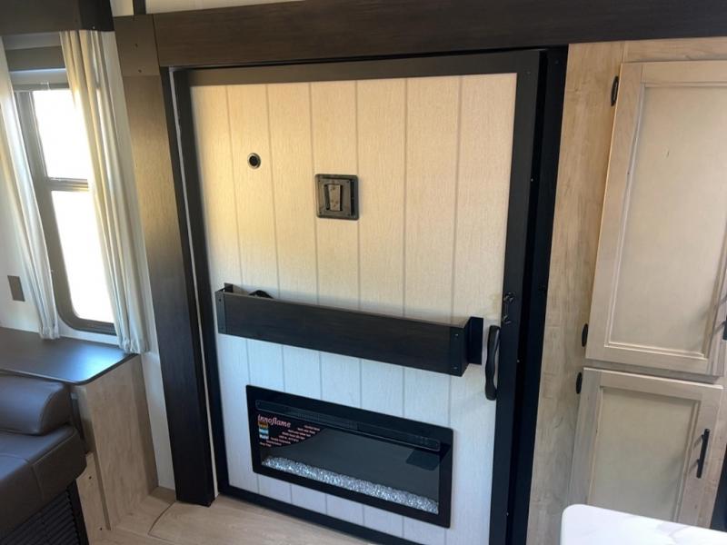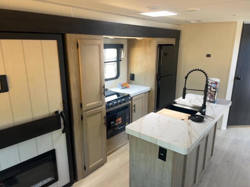 You'll love every minute spent in this double slide out travel trailer. You can relax on the rear sofa or dual lounge chairs, play a game at the booth dinette, and enjoy the glow of the fireplace. The chef of your group will appreciate the kitchen island, air fryer, plus refrigerator and pantry for food storage. A dual entry bath will create a front master bedroom, complete with an RV king bed and a bedside wardrobe to keep your space tidy.