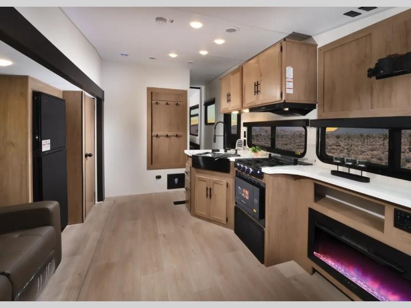 Escape your ordinary life with this innovative travel trailer! It features 64" top bunk bed above a 36" bottom bunk with wardrobes on either side of them, plus there is a wall at the foot of the beds with a fireplace on the other side. You will have your own privacy with the front private bedroom that has a walk-around RV king bed with wardrobes on either side and an entrance into the dual entry bathroom which has a neo-angled shower to freshen up in each morning plus one of the dual entry doors to the unit. The sofa and U-shaped dinette can also transform into extra sleeping spaces when you aren't using them to enjoy a meal or relax in front of the TV mount. The outdoor bar and grill comes with a 5.6 cu. ft. outdoor refrigerator and everything you need to prepare delicious meals outdoors. You even have a rear storage rack and outside storage areas to store your outdoor gear!