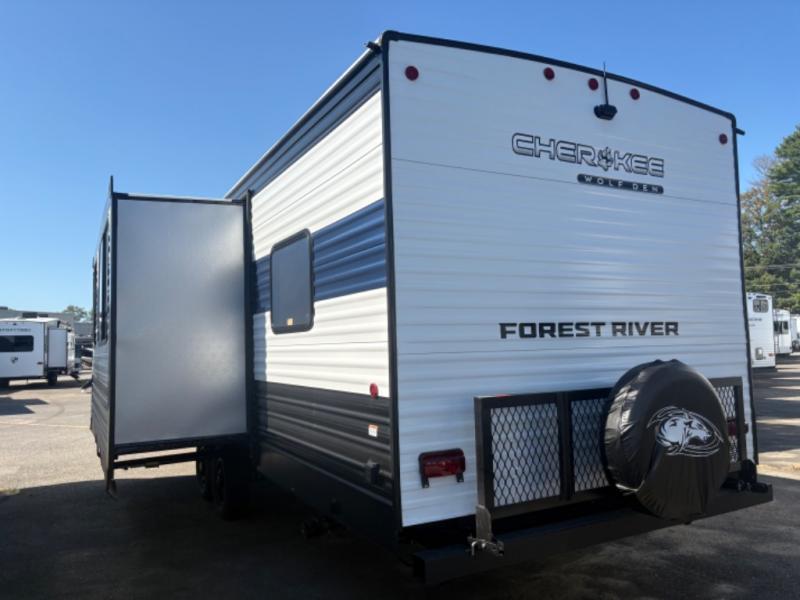If the open road is calling your name, then answer it with one of these Forest River Cherokee Wolf Den travel trailers! You'll find better comfort, style and value in these trailers, giving you more freedom to enjoy the camping lifestyle. Like with all Forest River products, the Wolf Den features durable construction materials and convenient amenities, such as outdoor storage and battery disconnect. With at least one slide in each model, you'll enjoy open living spaces, along with full bath and kitchen amenities, and comfortable sleeping arrangements.