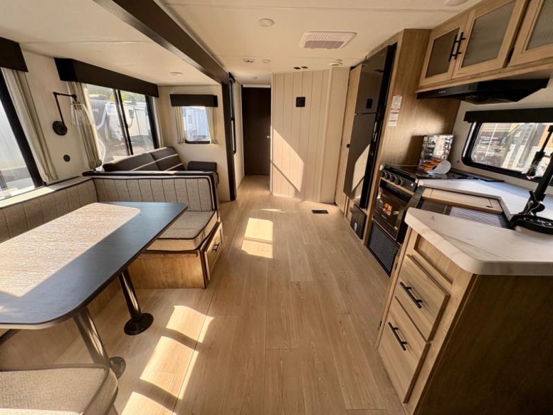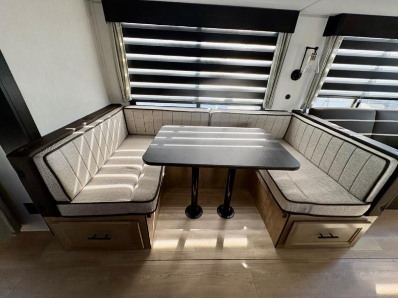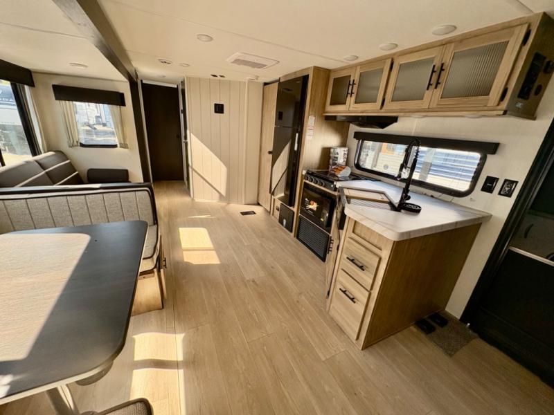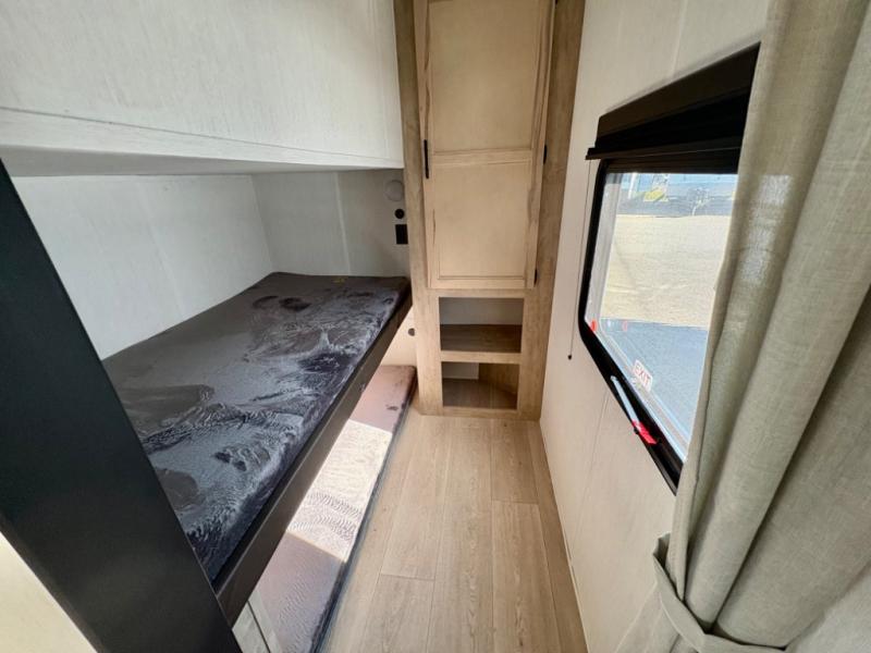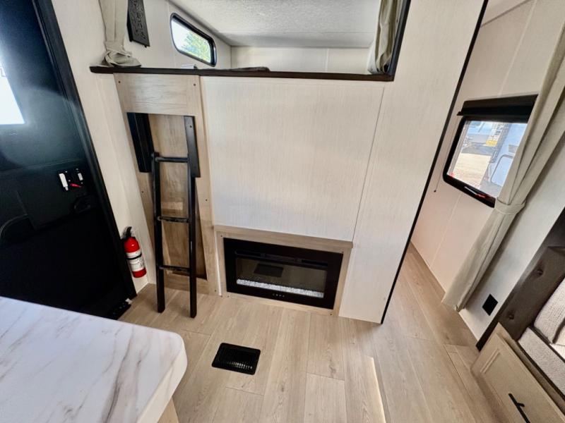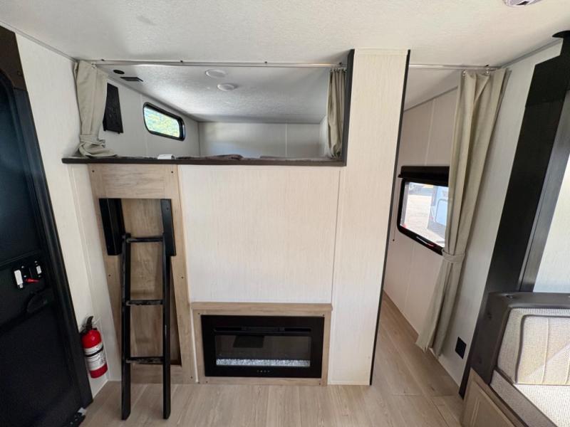 Escape your ordinary life with this innovative travel trailer! It features 64" top bunk bed above a 36" bottom bunk with wardrobes on either side of them, plus there is a wall at the foot of the beds with a fireplace on the other side. You will have your own privacy with the front private bedroom that has a walk-around RV king bed with a bedside wardrobe and an entrance into the dual entry bathroom which has a neo-angled shower to freshen up in each morning plus one of the dual entry doors to the unit. The sofa and U-shaped dinette can also transform into extra sleeping spaces when you aren't using them to enjoy a meal or relax. The outdoor bar and grill will let you grill up your best burger recipe, and you even have a rear storage rack and outside storage areas to store your outdoor gear!