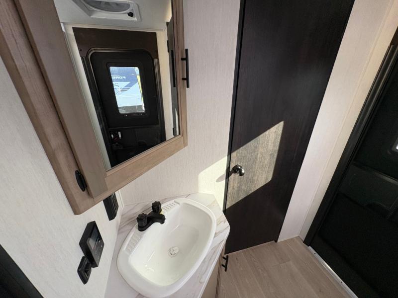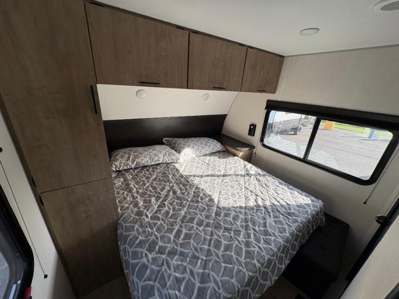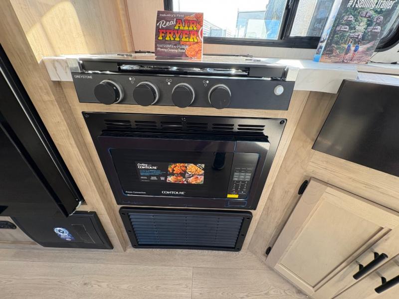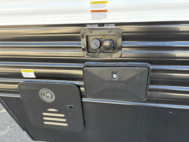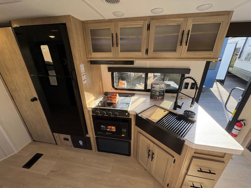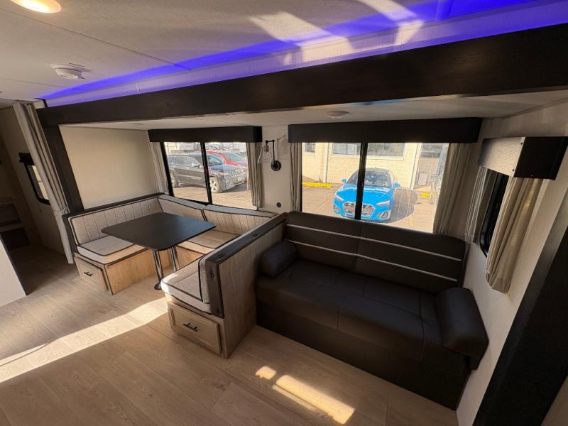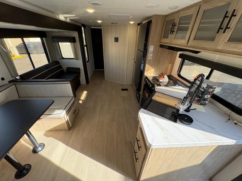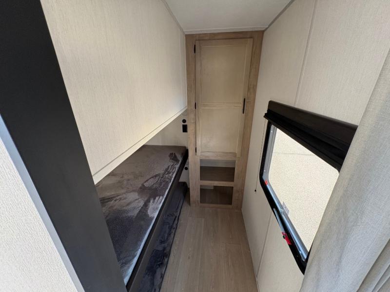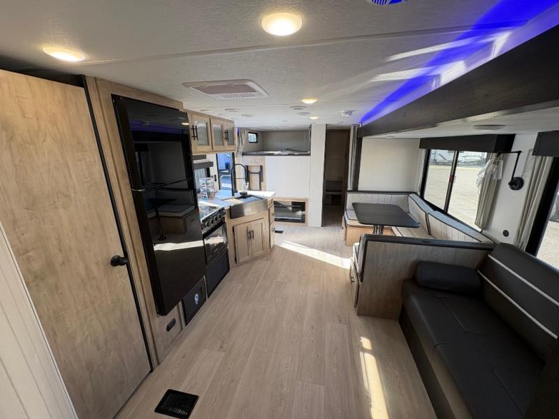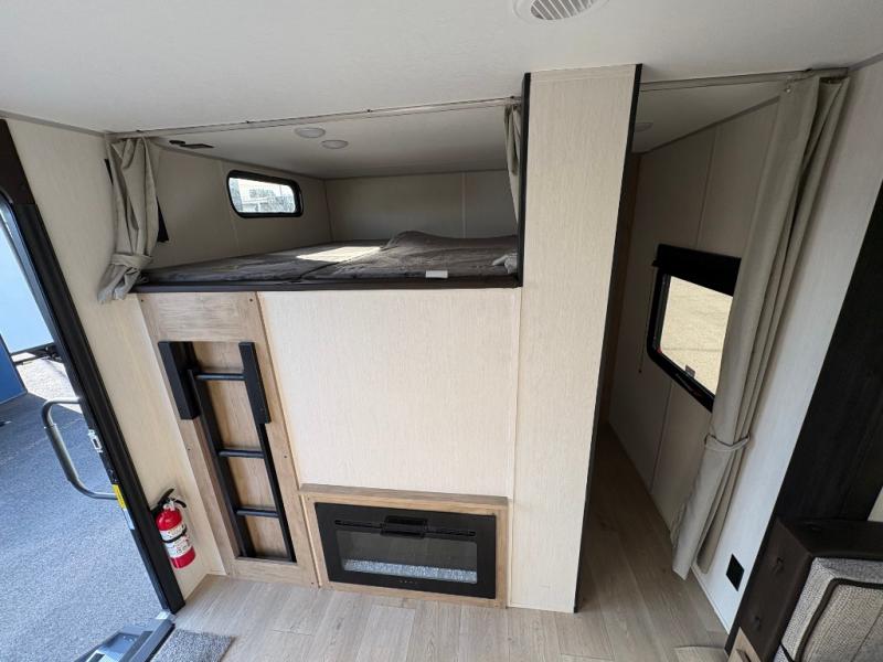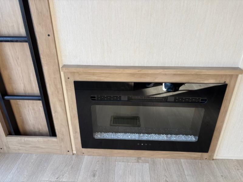 Escape your ordinary life with this innovative travel trailer! It features 64" top bunk bed above a 36" bottom bunk with wardrobes on either side of them, plus there is a wall at the foot of the beds with a fireplace on the other side. You will have your own privacy with the front private bedroom that has a walk-around RV king bed with a bedside wardrobe and an entrance into the dual entry bathroom which has a neo-angled shower to freshen up in each morning plus one of the dual entry doors to the unit. The sofa and U-shaped dinette can also transform into extra sleeping spaces when you aren't using them to enjoy a meal or relax. The outdoor bar and grill will let you grill up your best burger recipe, and you even have a rear storage rack and outside storage areas to store your outdoor gear!