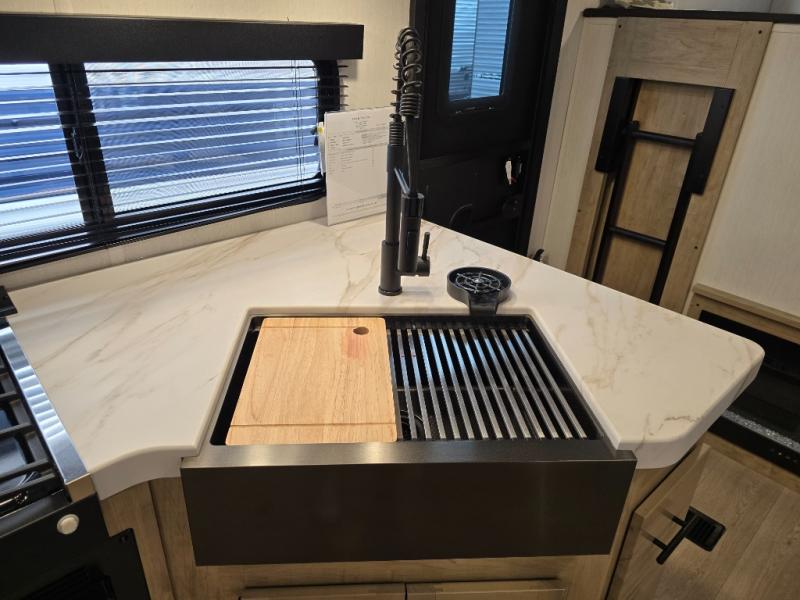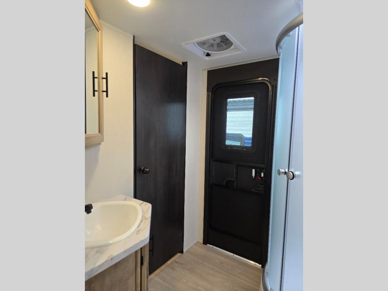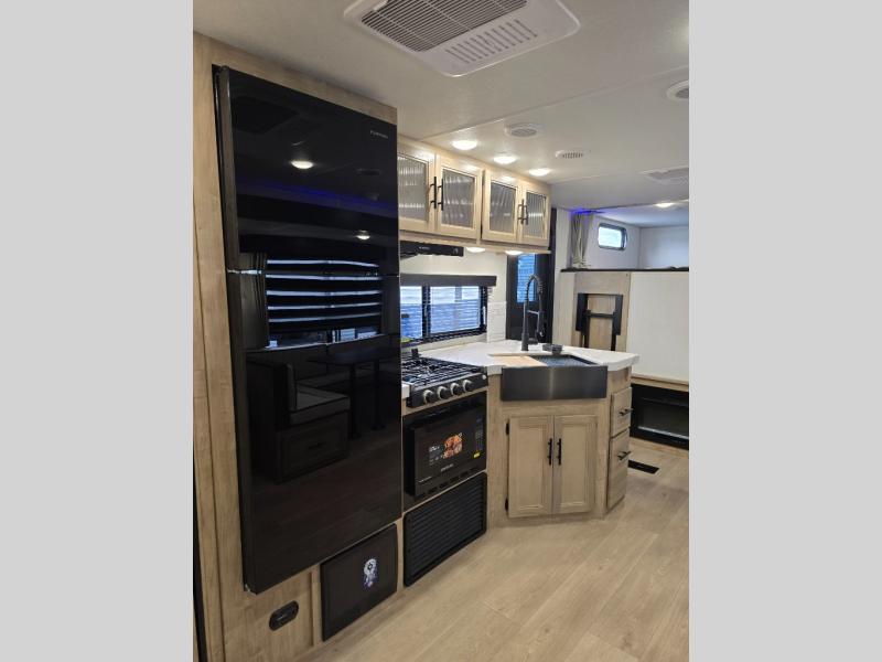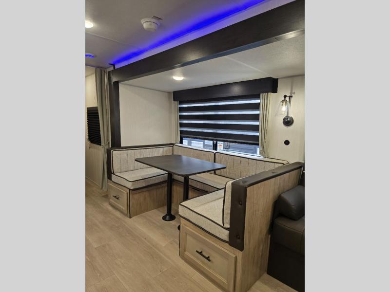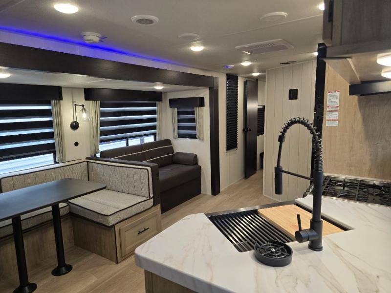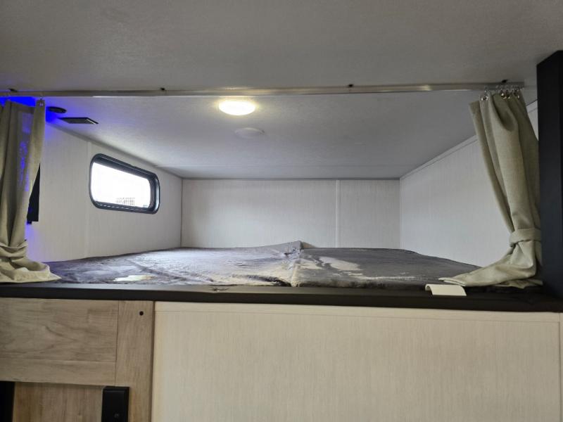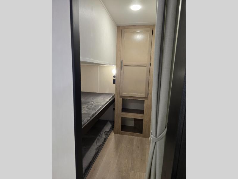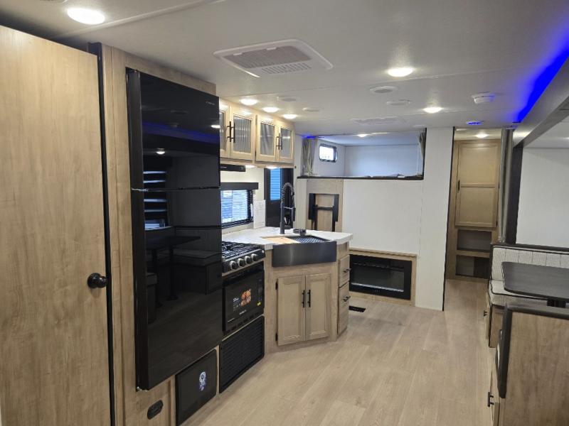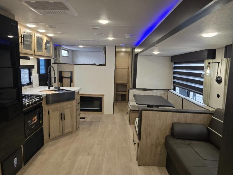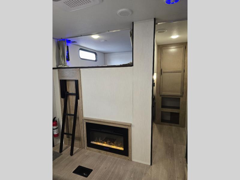 Escape your ordinary life with this innovative travel trailer! It features 64" top bunk bed above a 36" bottom bunk with wardrobes on either side of them, plus there is a wall at the foot of the beds with a fireplace on the other side. You will have your own privacy with the front private bedroom that has a walk-around RV king bed with a bedside wardrobe and an entrance into the dual entry bathroom which has a neo-angled shower to freshen up in each morning plus one of the dual entry doors to the unit. The sofa and U-shaped dinette can also transform into extra sleeping spaces when you aren't using them to enjoy a meal or relax. The outdoor bar and grill will let you grill up your best burger recipe, and you even have a rear storage rack and outside storage areas to store your outdoor gear!
