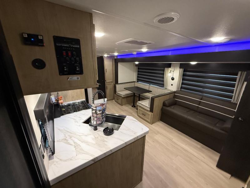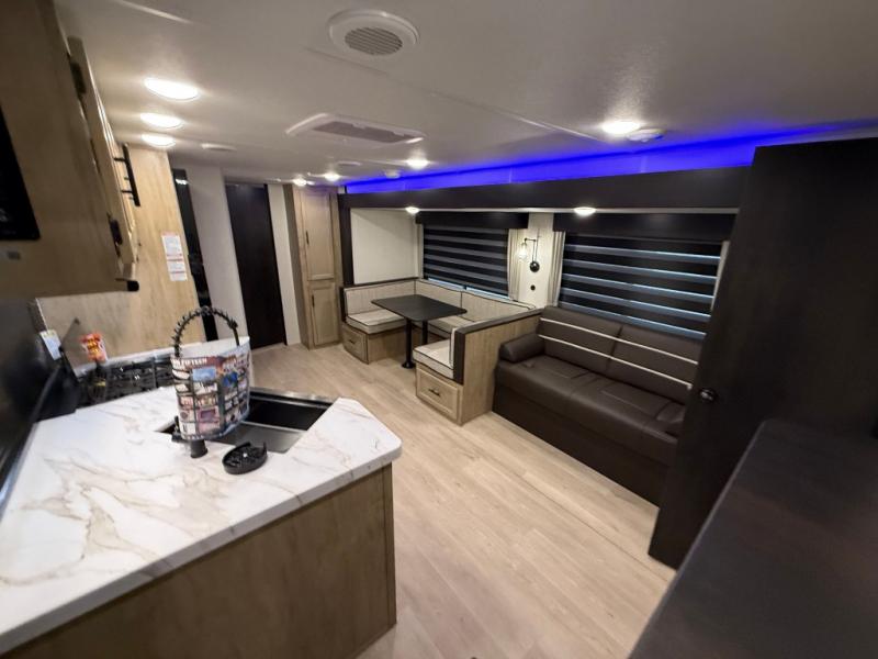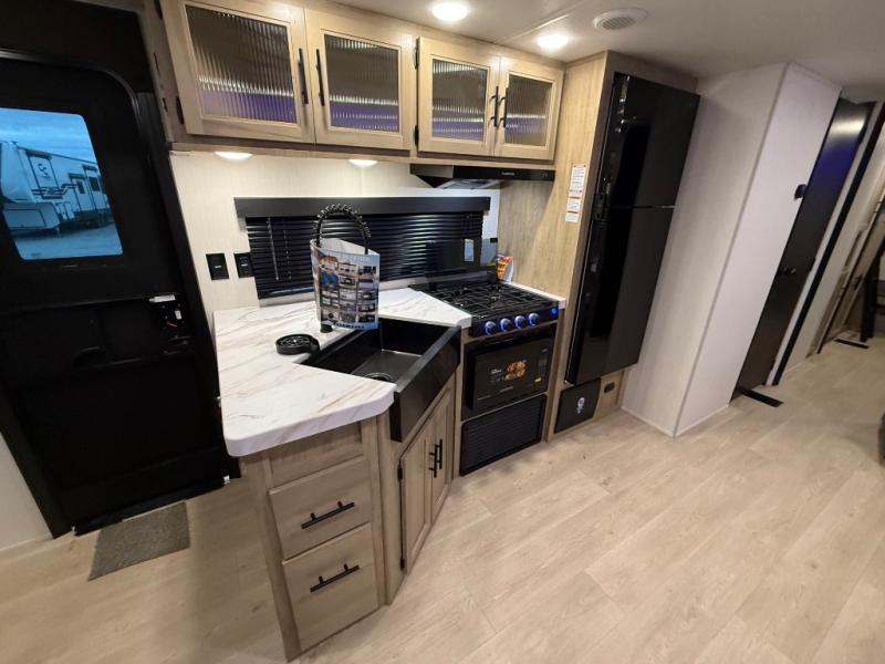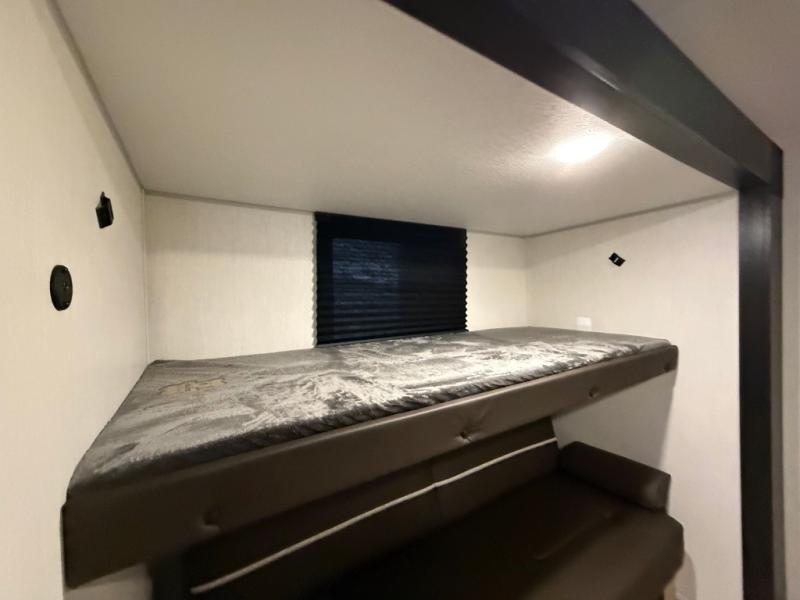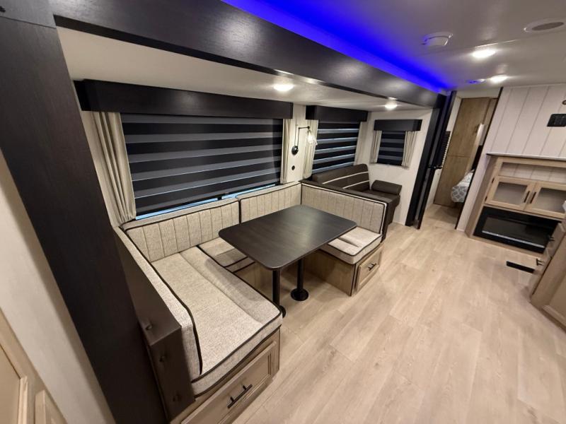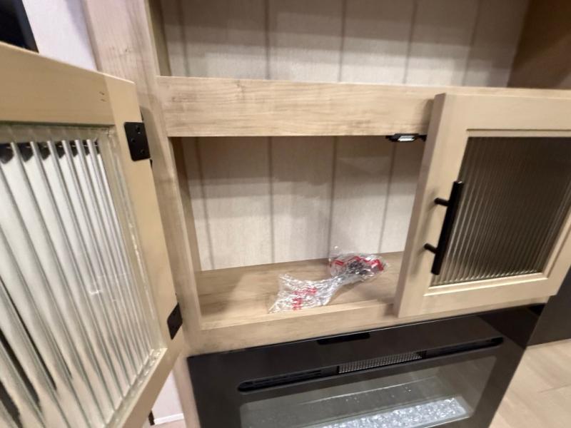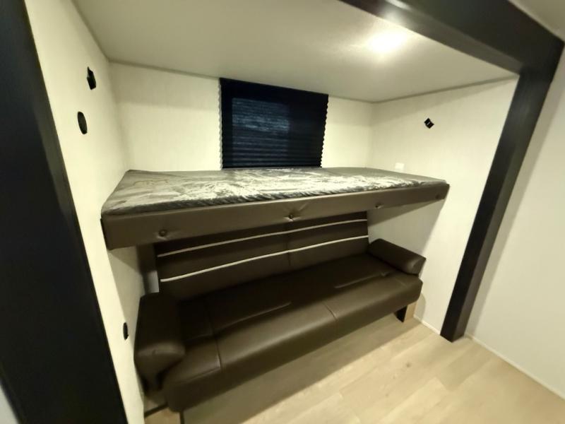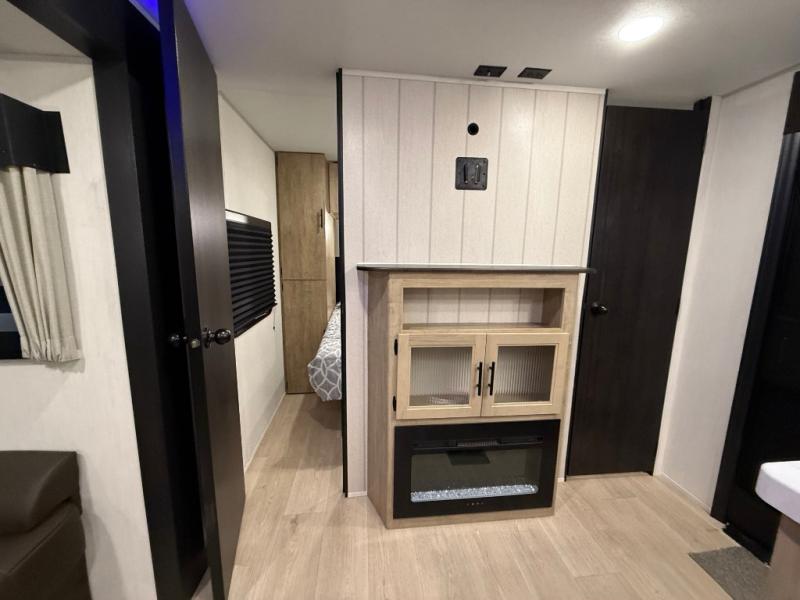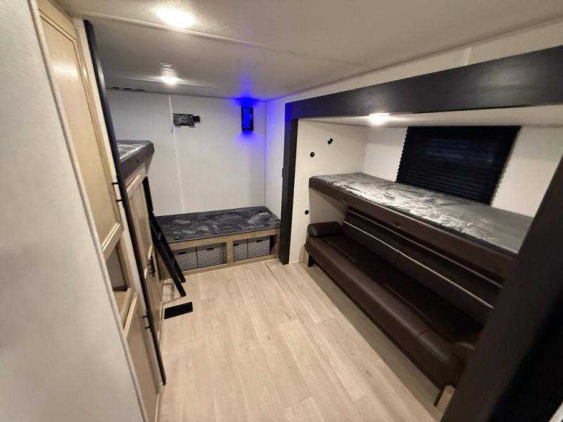 Double slides create spacious living areas in this travel trailer! The chef can prepare their best meals either indoors with the three burner cooktop and air fryer microwave, or at the outdoor kitchen. The kids or guests can sleep in the rear private bunkhouse with a bunk, double bunk, and flip-up bunk above a sofa. The front private bedroom has a walk around RV king bed for a great night's rest plus dual closets to keep your things organized. In the morning, everyone can meet in the combined kitchen and living room around the U-shaped dinette and sofa, and the fireplace here will make it feel more like home.