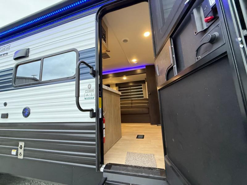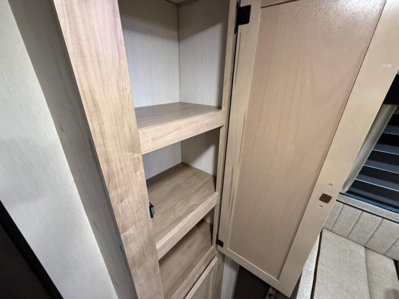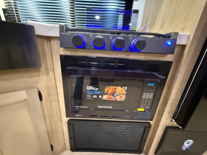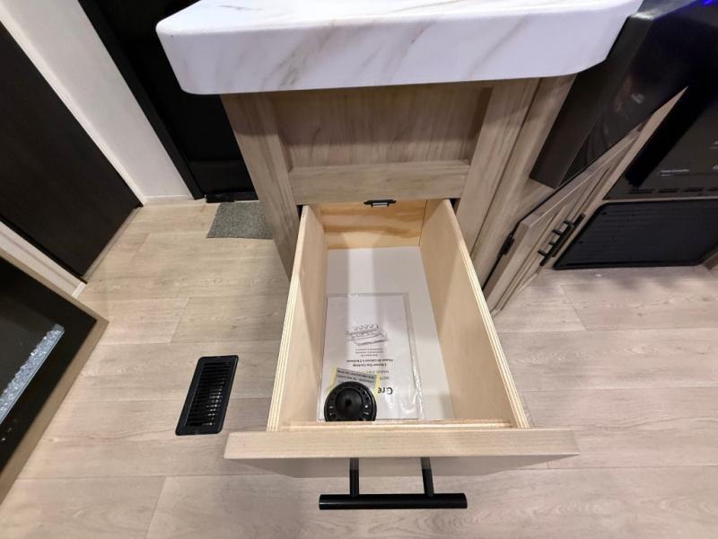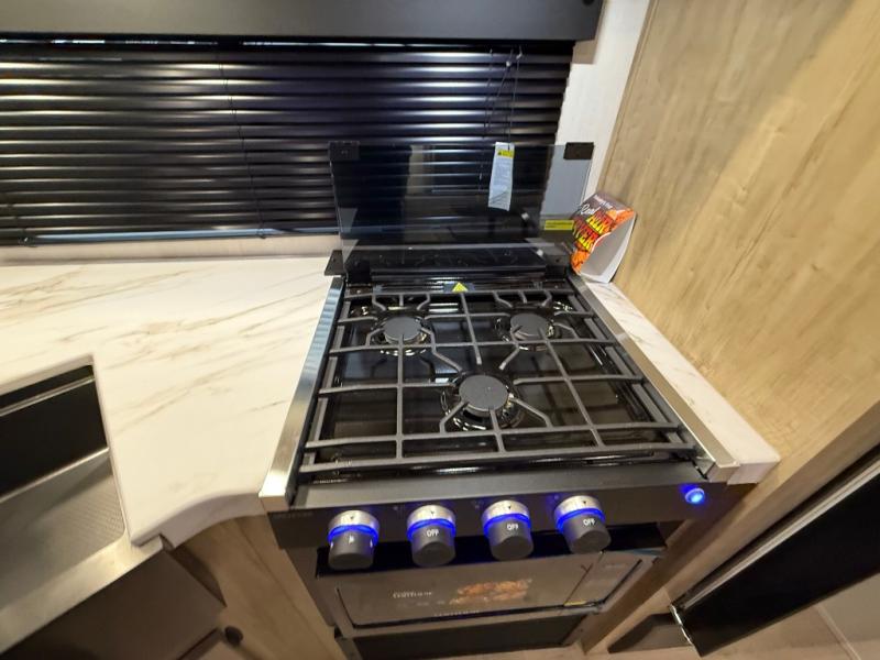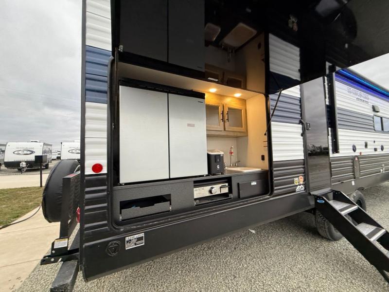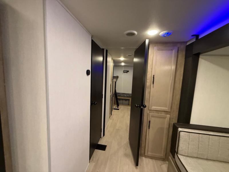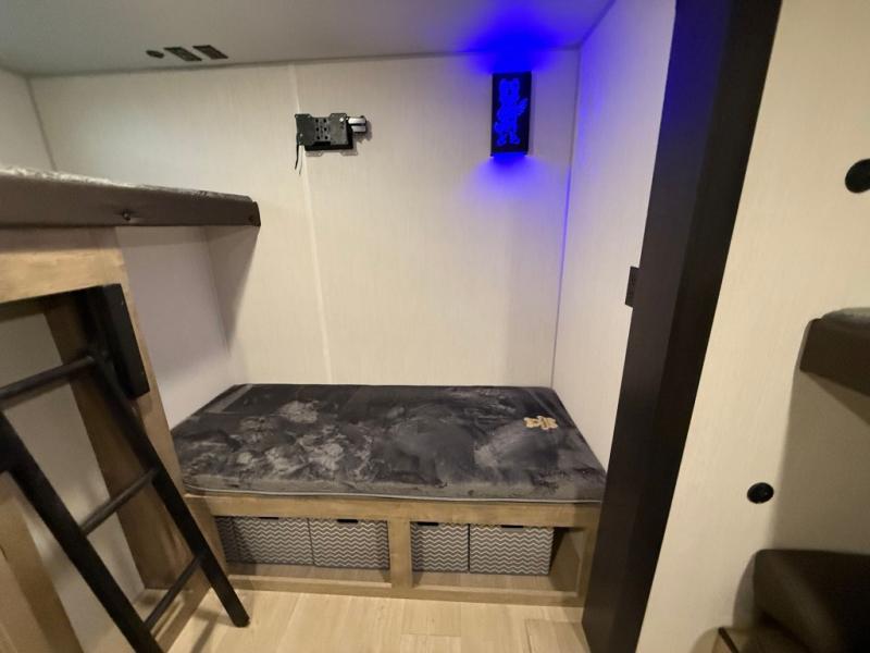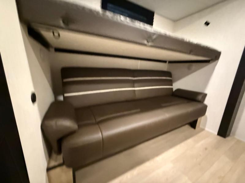 Double slides create spacious living areas in this travel trailer! The chef can prepare their best meals either indoors with the three burner cooktop and air fryer microwave, or at the outdoor kitchen. The kids or guests can sleep in the rear private bunkhouse with a bunk, double bunk, and flip-up bunk above a sofa. The front private bedroom has a walk around RV king bed for a great night's rest plus dual closets to keep your things organized. In the morning, everyone can meet in the combined kitchen and living room around the U-shaped dinette and sofa, and the fireplace here will make it feel more like home.