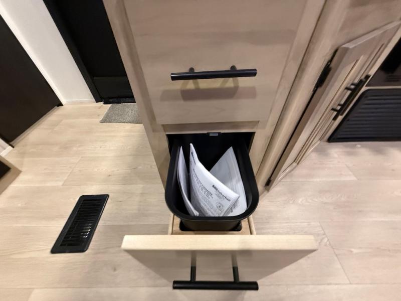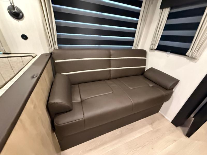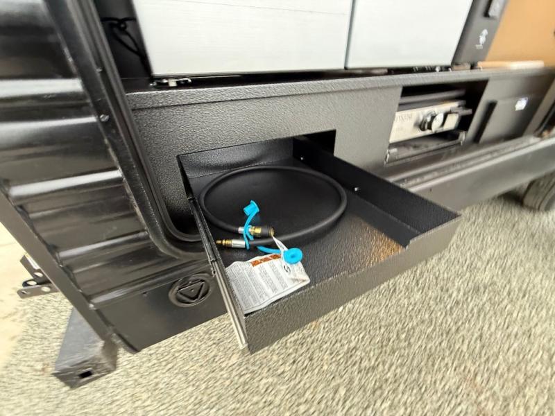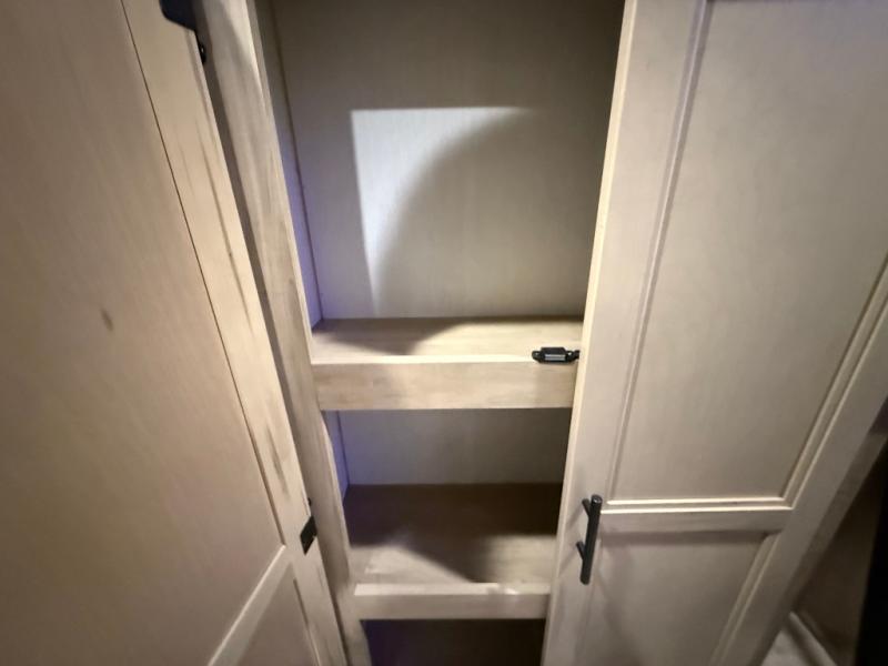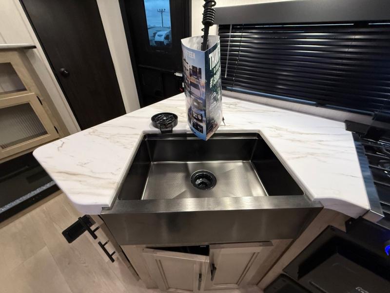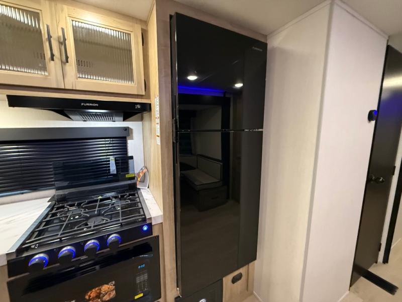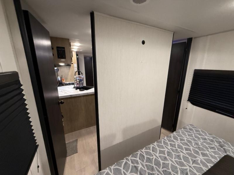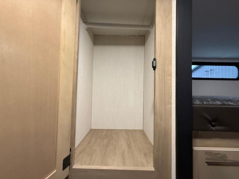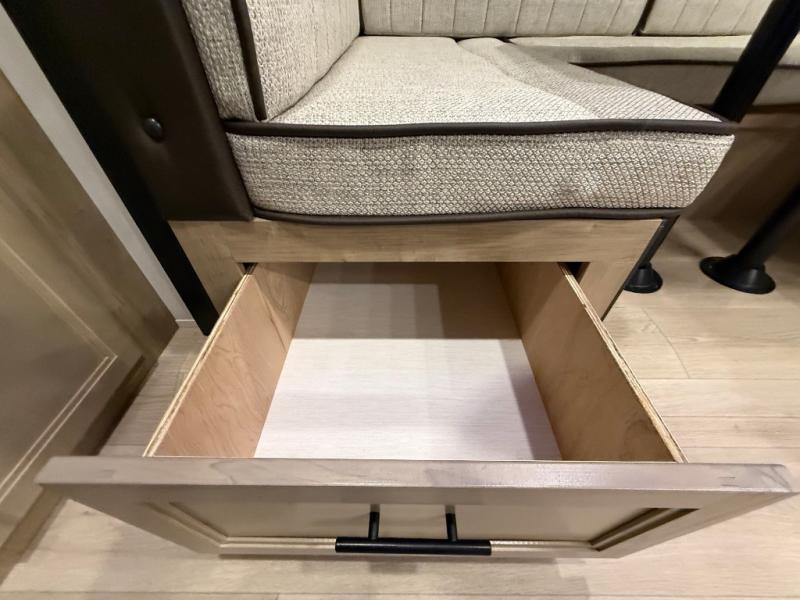 Double slides create spacious living areas in this travel trailer! The chef can prepare their best meals either indoors with the three burner cooktop and air fryer microwave, or at the outdoor kitchen. The kids or guests can sleep in the rear private bunkhouse with a bunk, double bunk, and flip-up bunk above a sofa. The front private bedroom has a walk around RV king bed for a great night's rest plus dual closets to keep your things organized. In the morning, everyone can meet in the combined kitchen and living room around the U-shaped dinette and sofa, and the fireplace here will make it feel more like home.