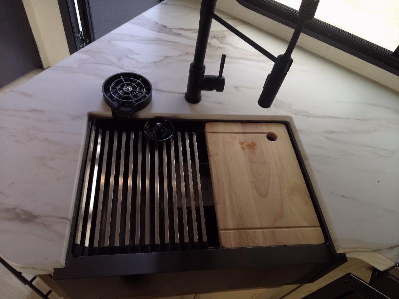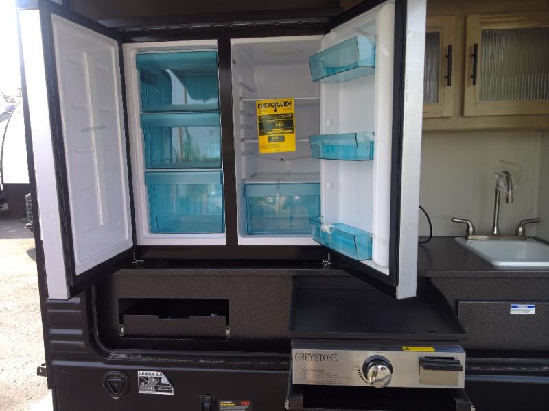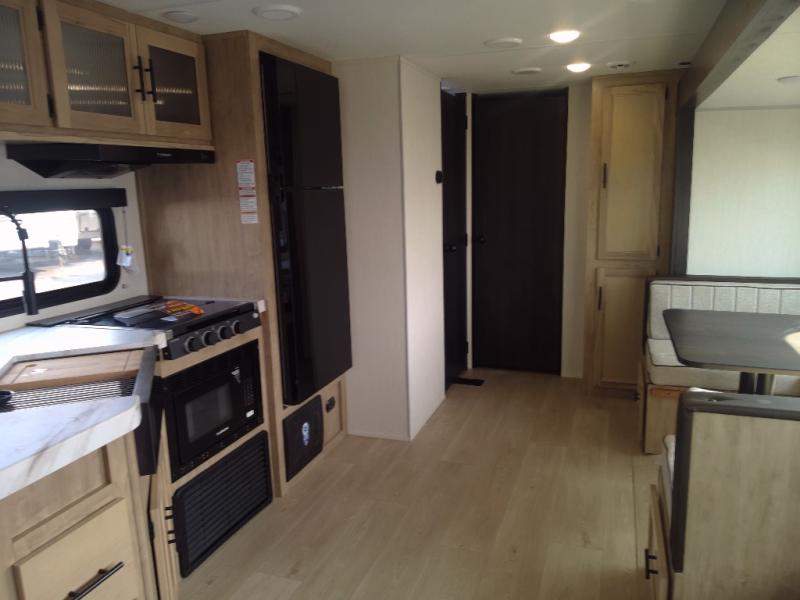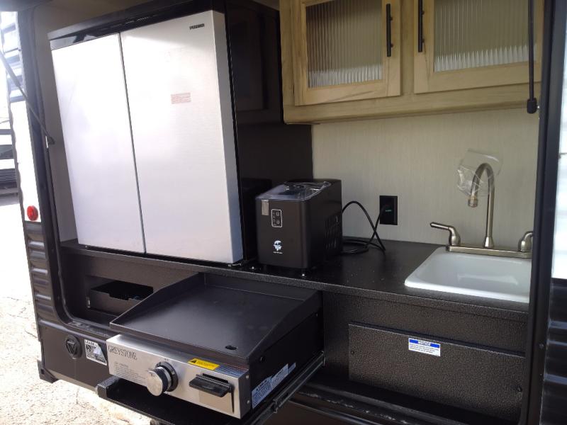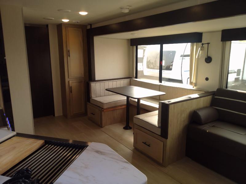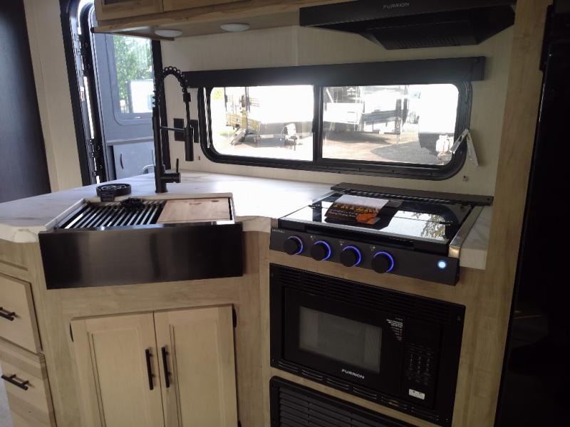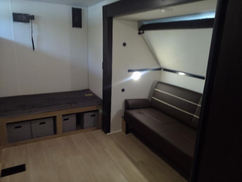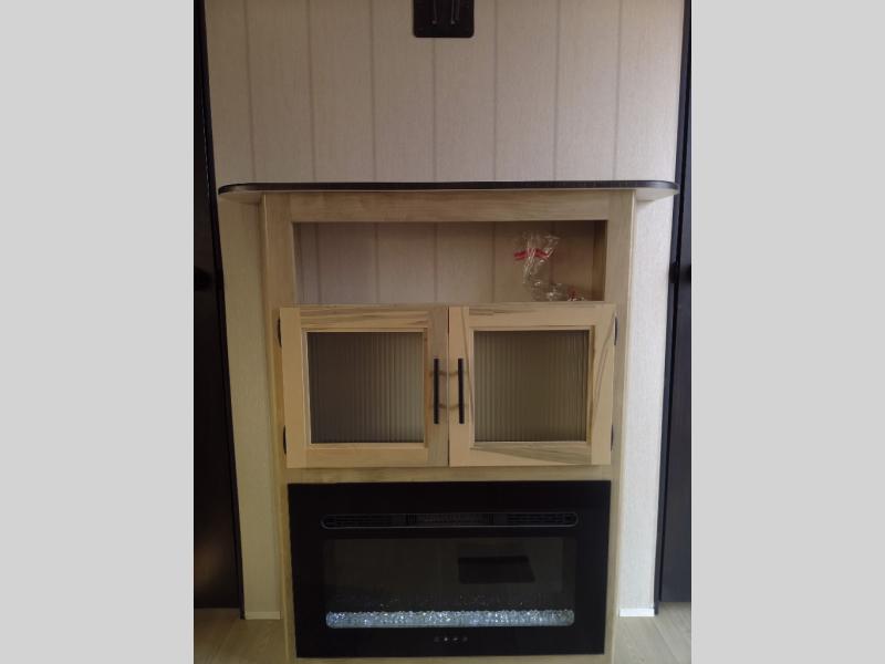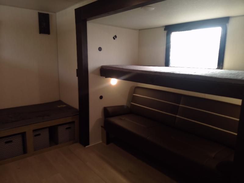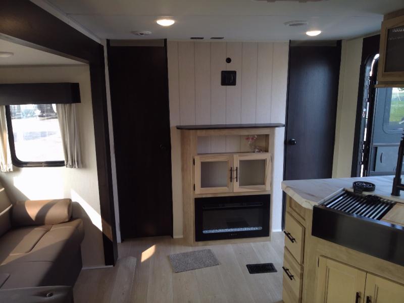 Double slides create spacious living areas in this travel trailer! The chef can prepare their best meals either indoors with the three burner cooktop and air fryer microwave, or at the outdoor kitchen. The kids or guests can sleep in the rear private bunkhouse with a bunk, double bunk, and flip-up bunk above a sofa. The front private bedroom has a walk around RV king bed for a great night's rest plus dual closets to keep your things organized. In the morning, everyone can meet in the combined kitchen and living room around the U-shaped dinette and sofa, and the fireplace here will make it feel more like home.