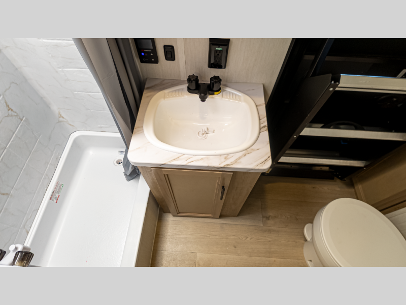 - Bath & Utilities: Full bath with tub/shower, 52 gal fresh / 38 gal grey / 38 gal black; tankless water heater