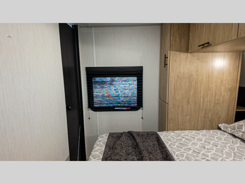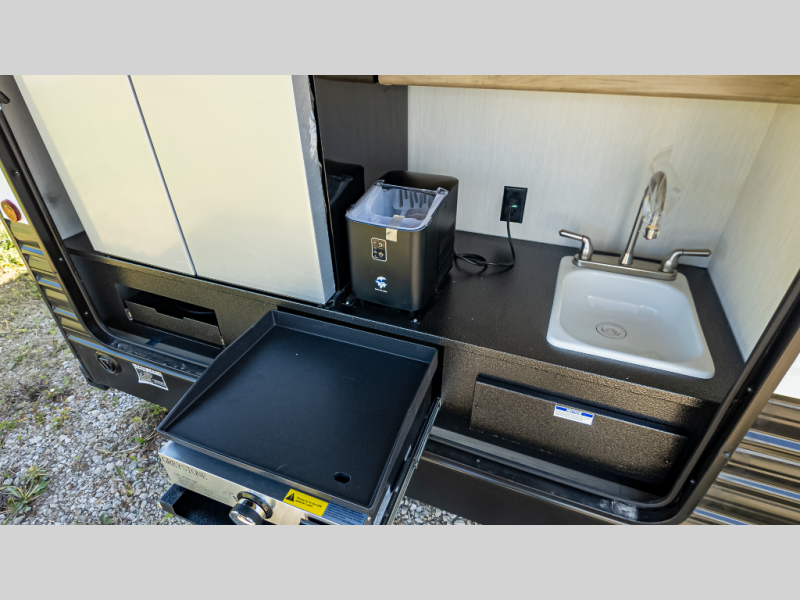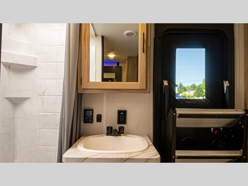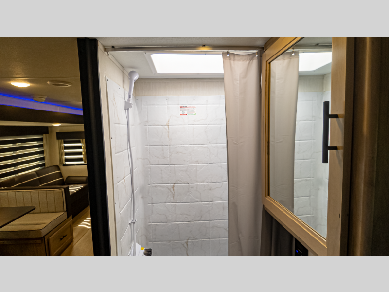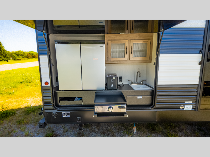 - Exterior & Extras: Outside kitchen, power awning with LED strip, solar prep, tinted windows, stable step entry, exterior storage