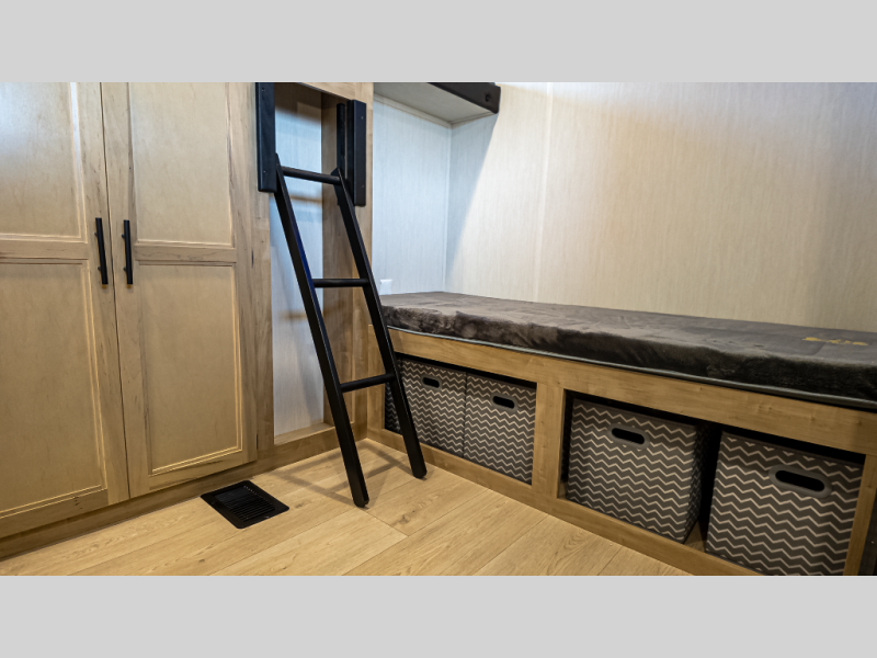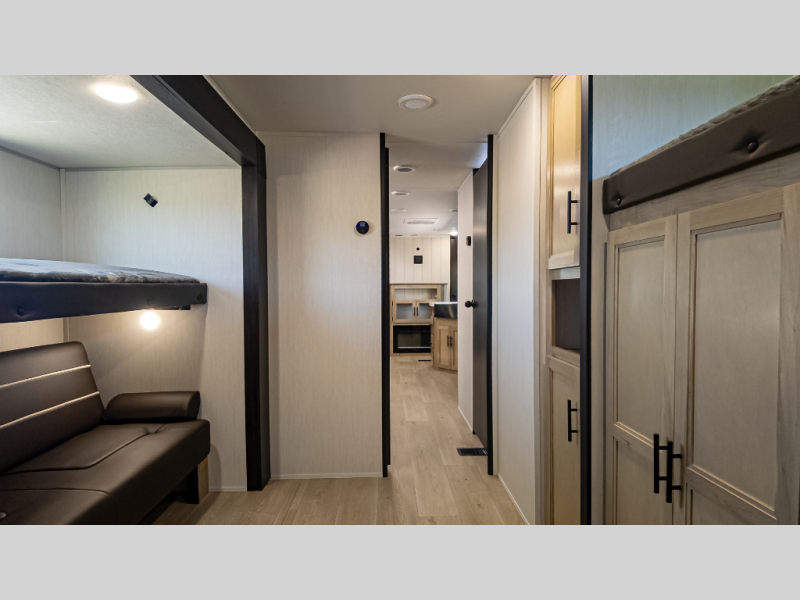 Spacious bunkhouse design with dual slides, full kitchen, and luxury touches