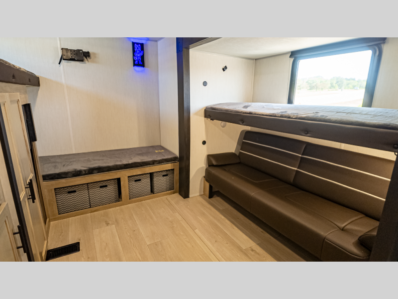 - Sleeping Layout: Bunkhouse with multiple bunk beds + flip-up, sofa, plus front king suite—sleeps up to 10