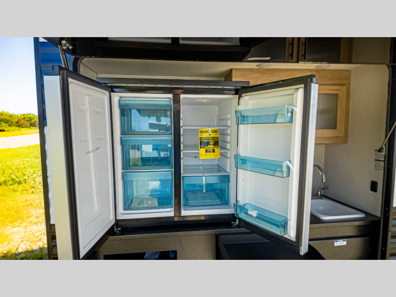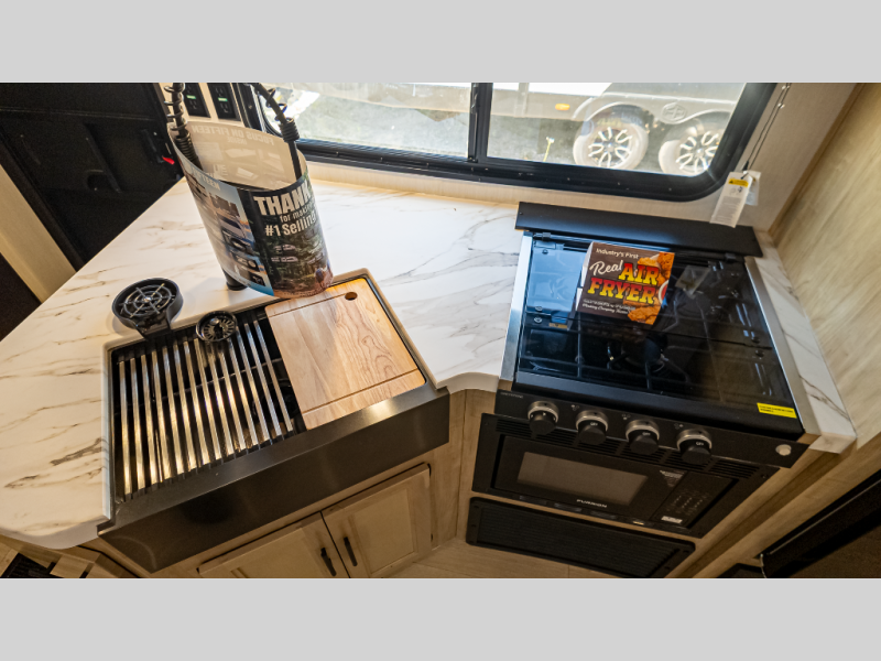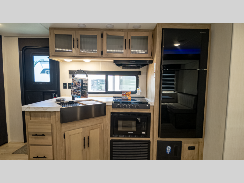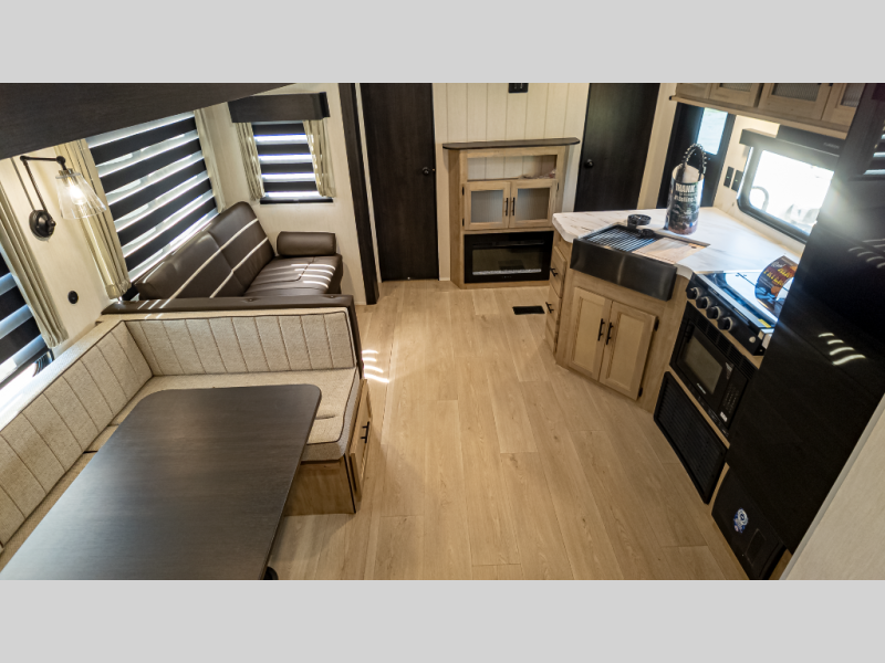 - Living & Kitchen: U-dinette + sofa with two slide-outs, 10 cu ft 12V refrigerator, 3-burner cooktop, full kitchen amenities