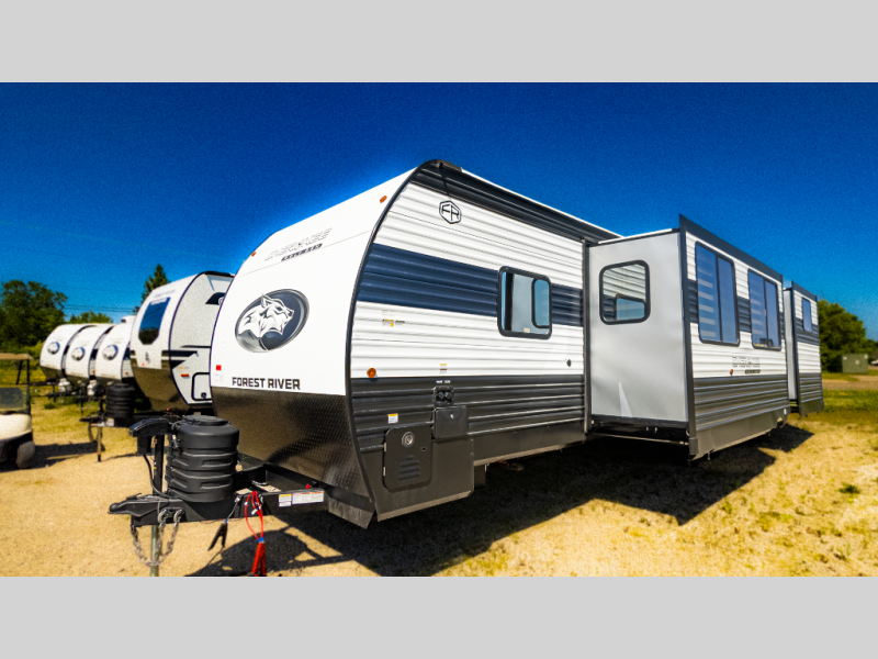 A: The Wolf Den 301BH brings you a rear bunkhouse, two slides for expanded living, a front private king bedroom, and a full kitchen + outdoor options—all in a 37'6" frame with ~52 gal fresh water and solid cargo capacity.